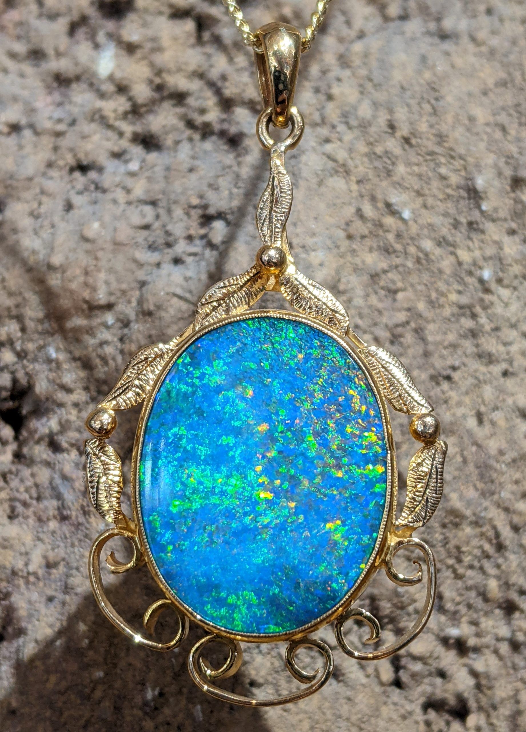 This opal doublet pendant is set in 9K Yellow Gold and has a sparkly display of the colours green, yellow, orange and red.