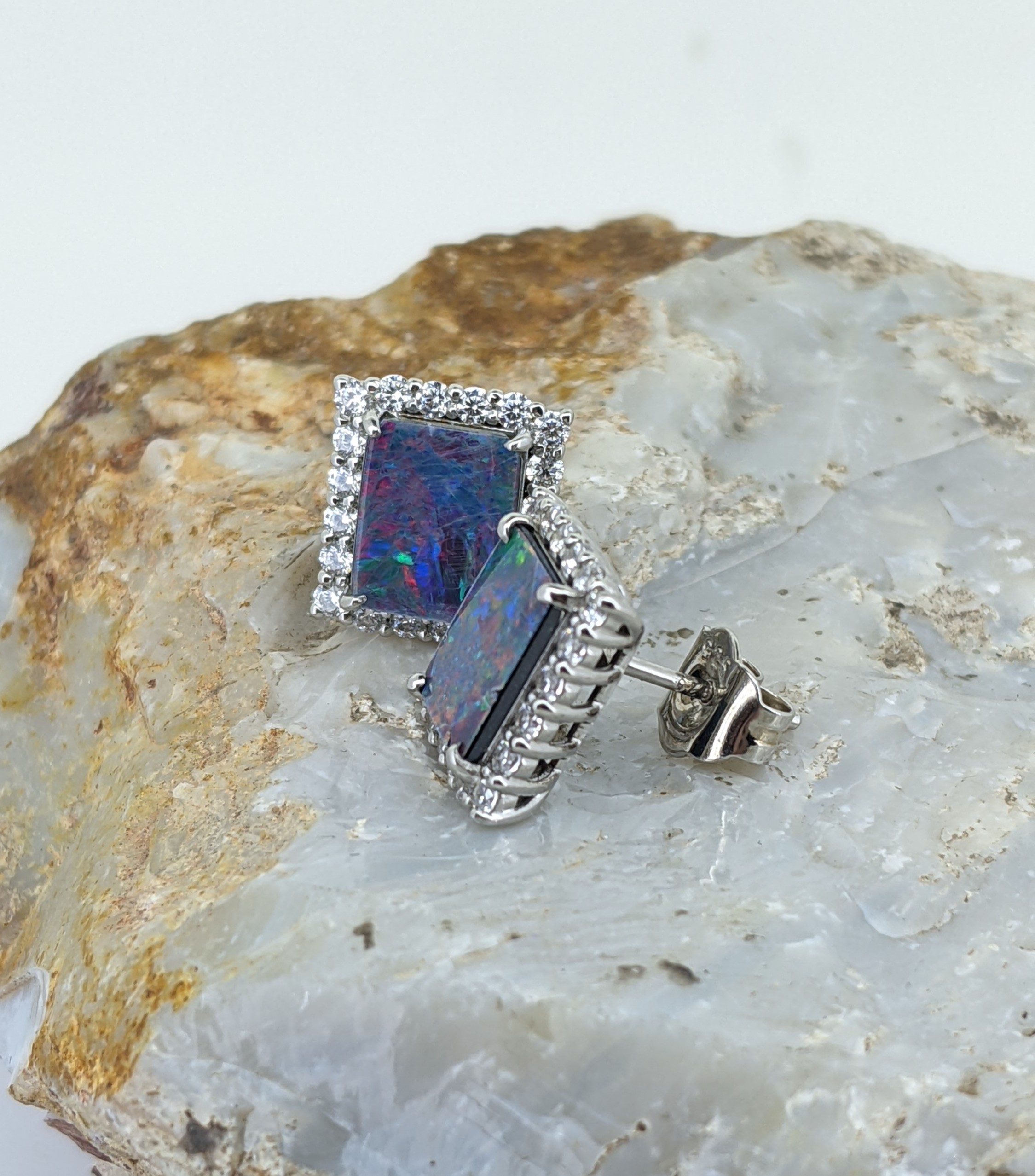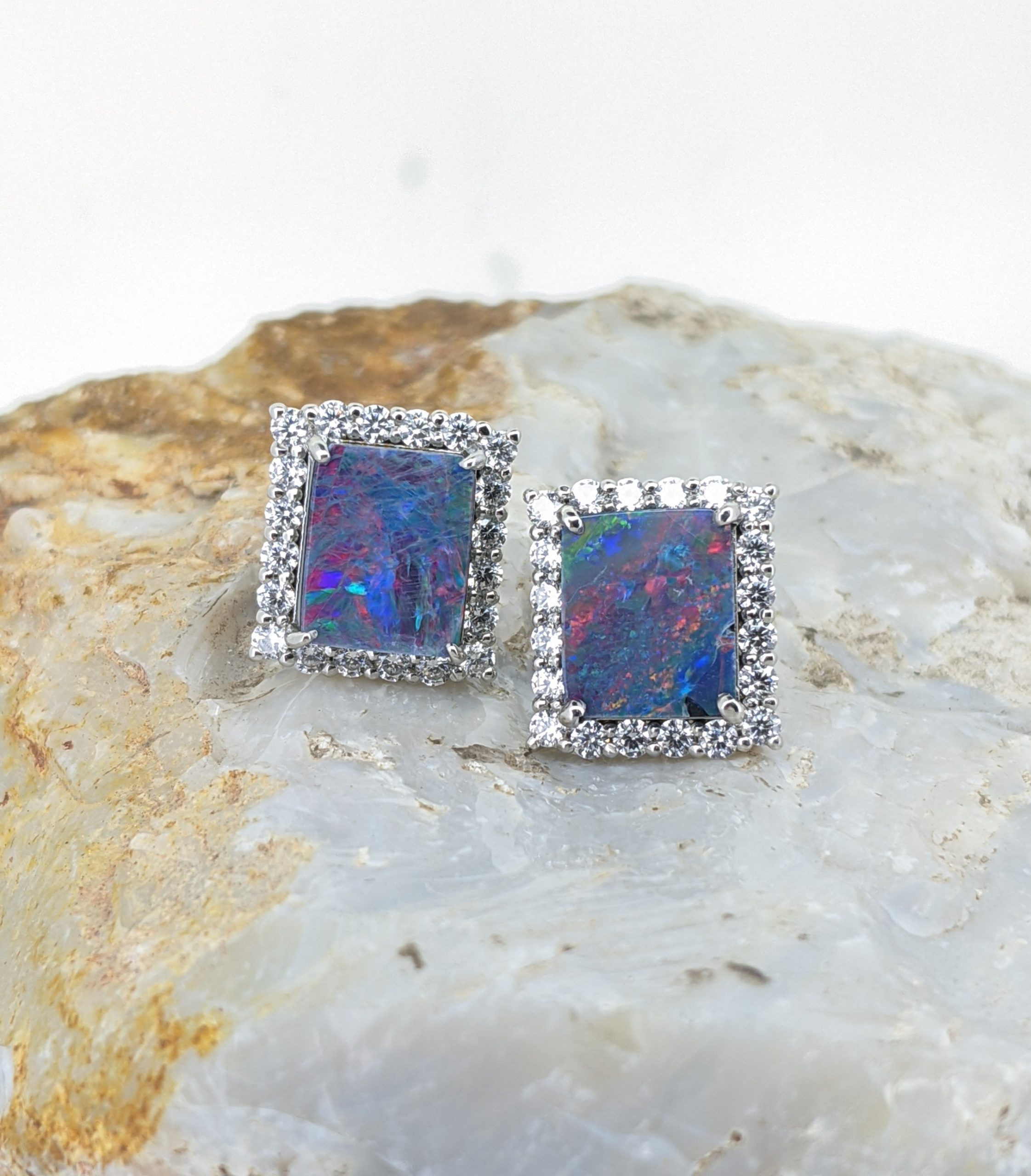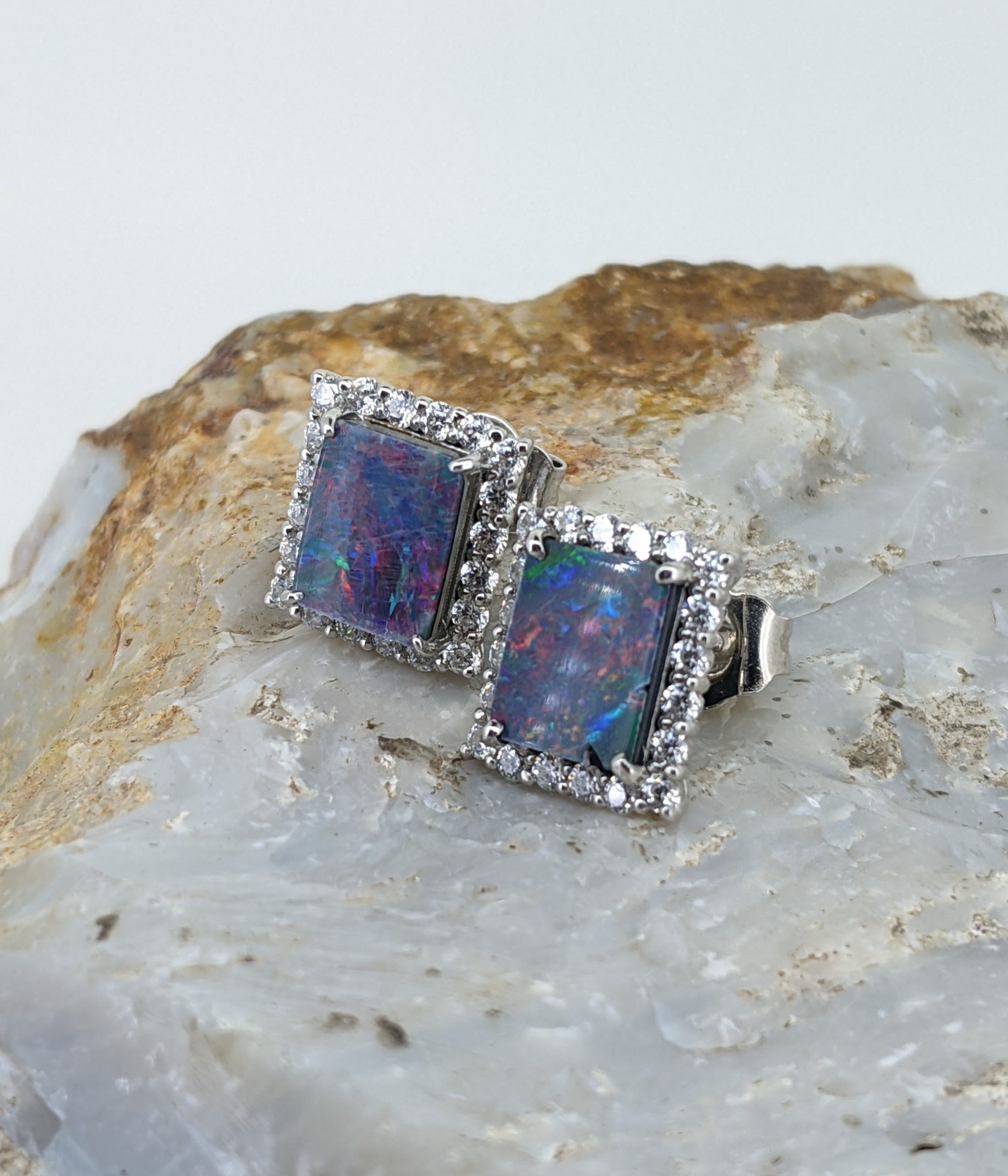 Doublet Opal Stud Sterling Silver Earrings With Cubic Zirconia Halo Setting