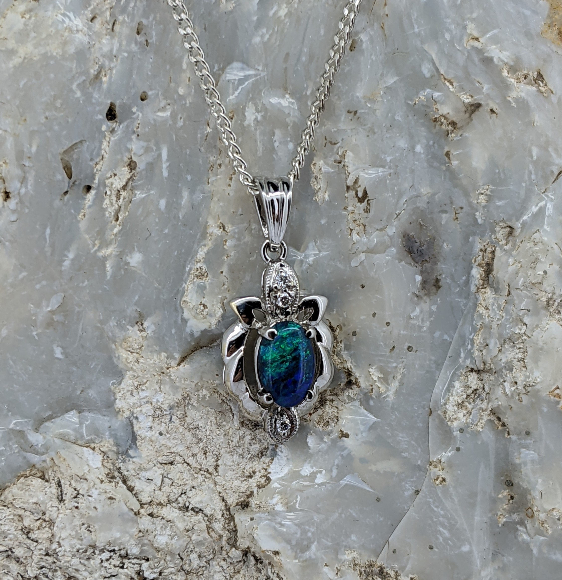 Solid natural black opal from Lightning Ridge, New South Wales. This solid black opal pendant is set in 18K White Gold. The opal is accentuated by three diamonds and has a strong display of the colours green and blue.