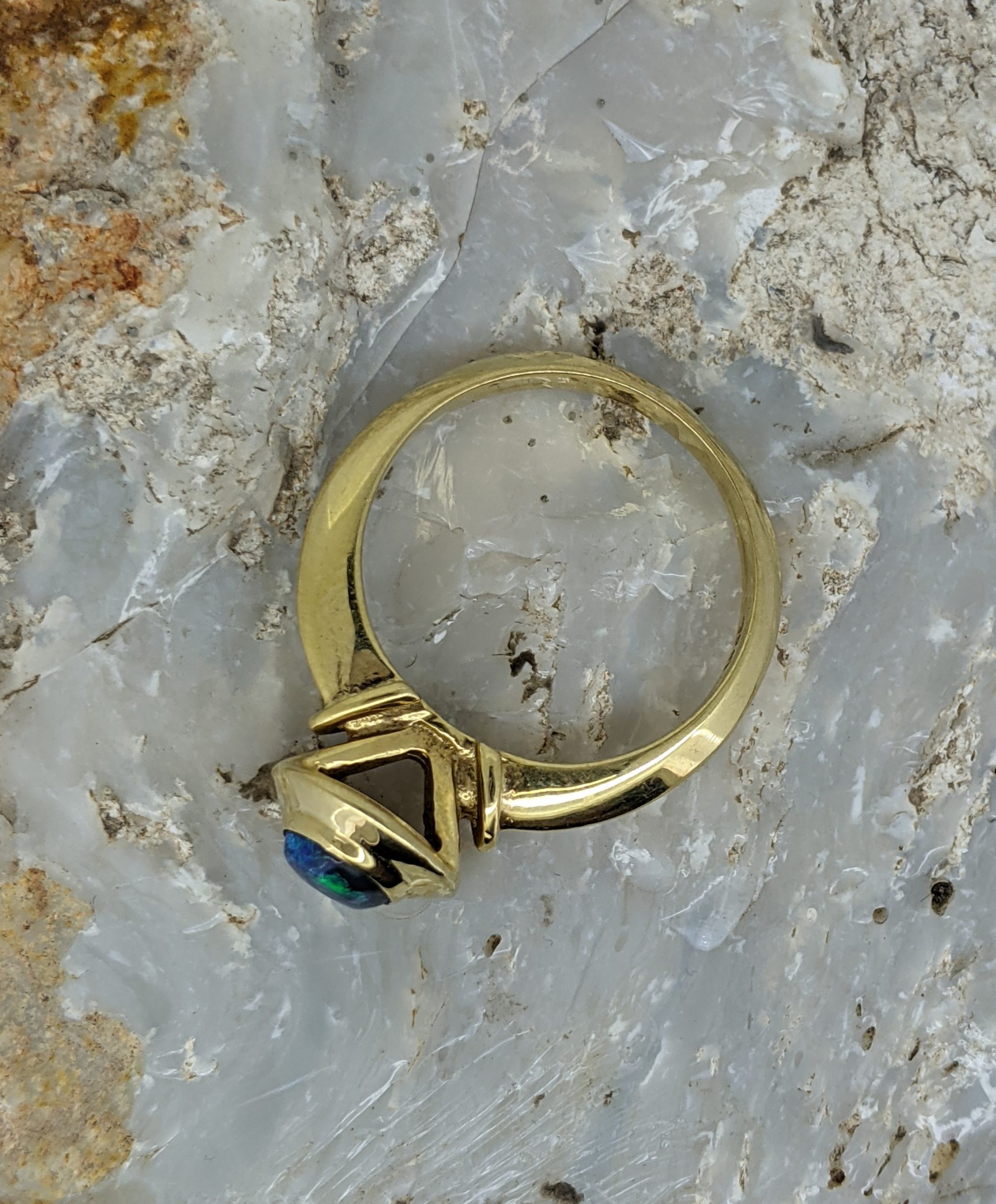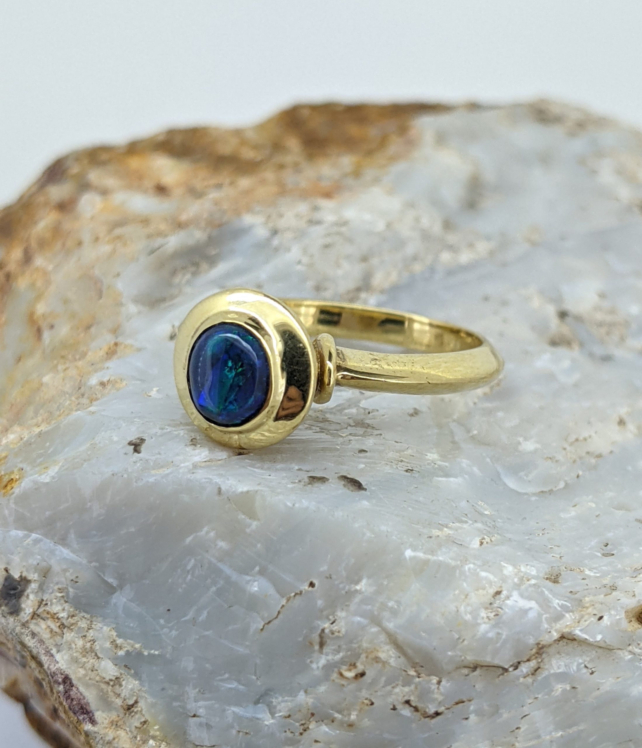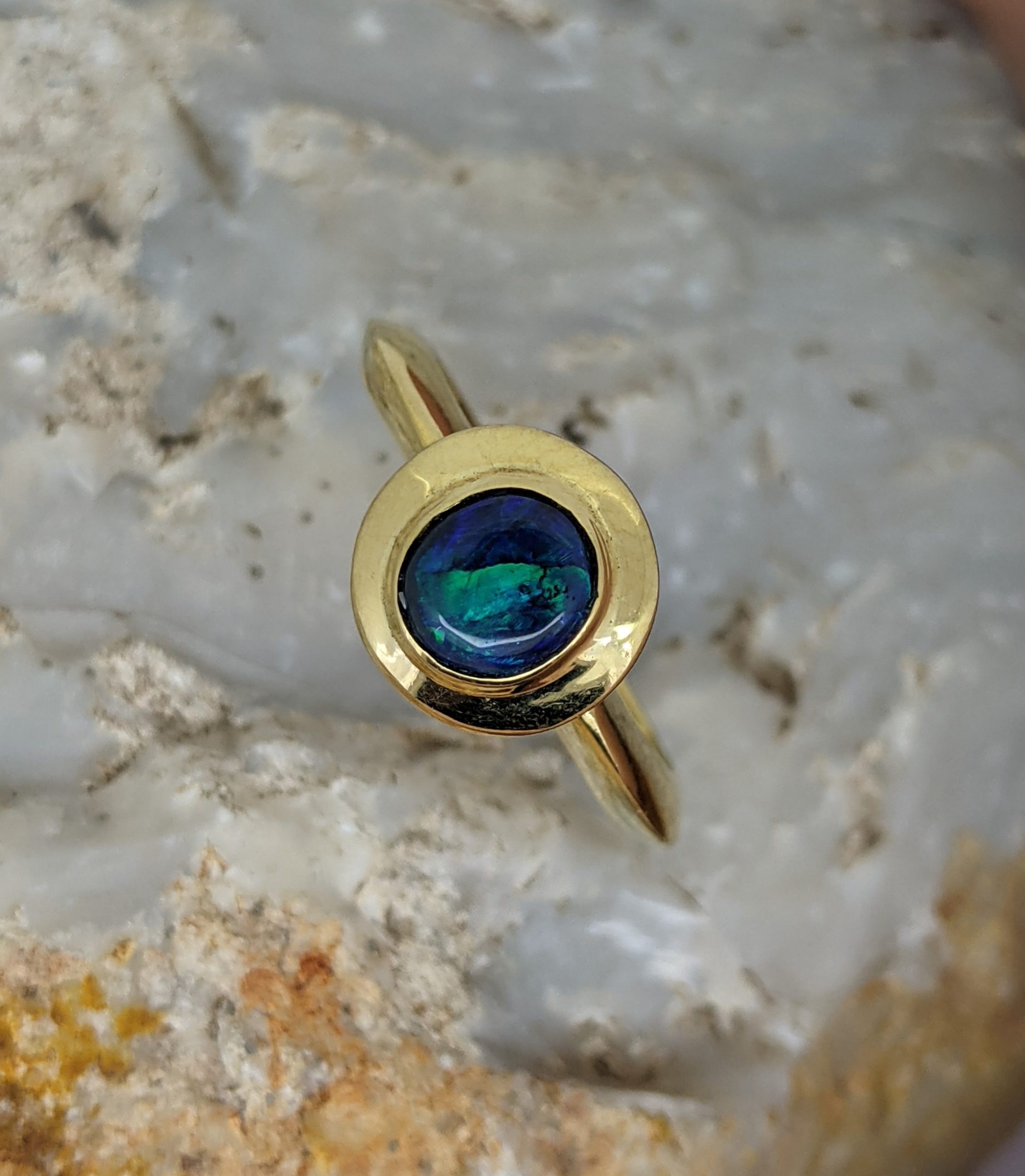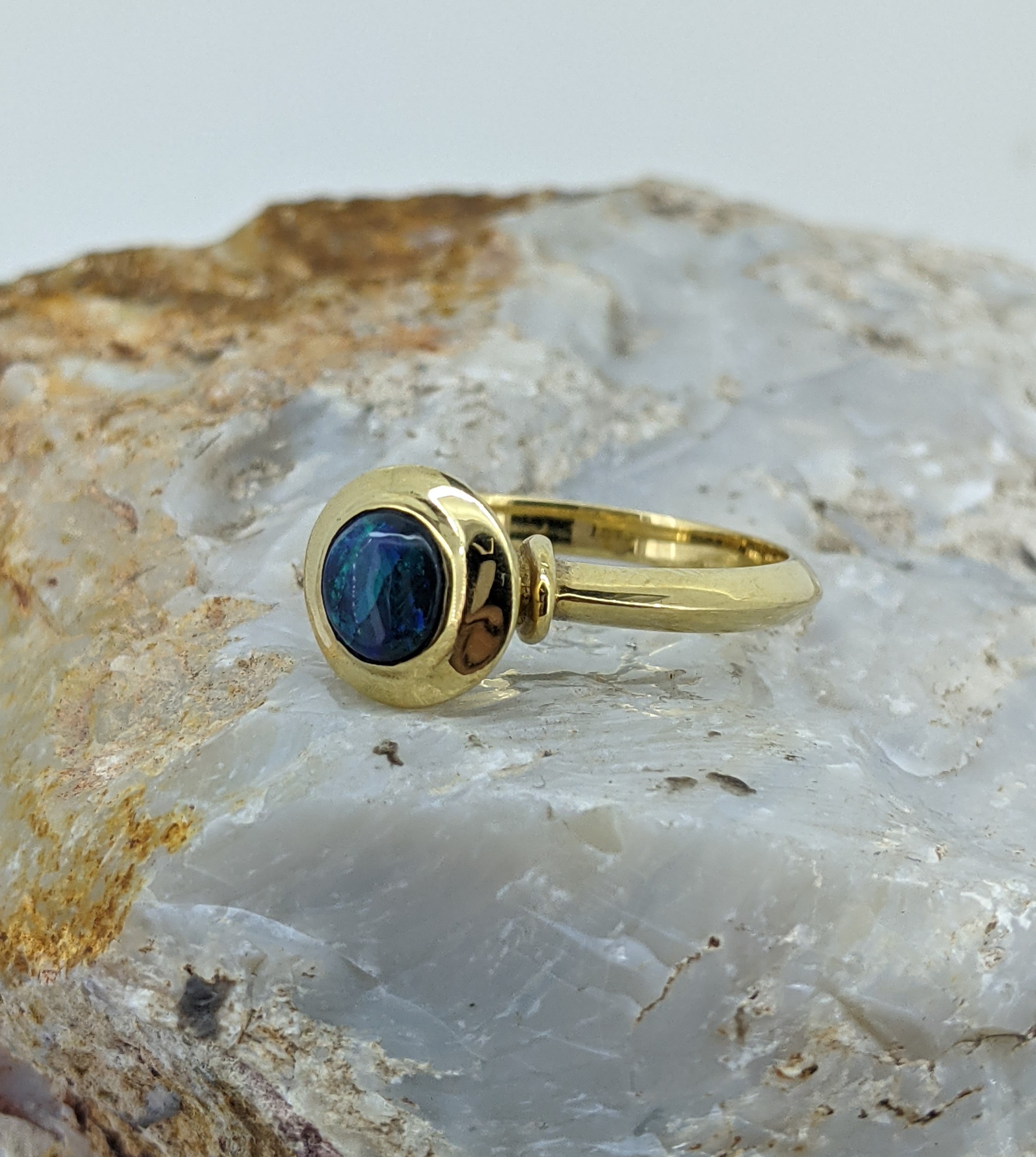 Solid natural black opal from Lightning Ridge, New South Wales. This solid black opal ring is set in 18K Yellow Gold. The opal has a strong display of the colours green and blue.