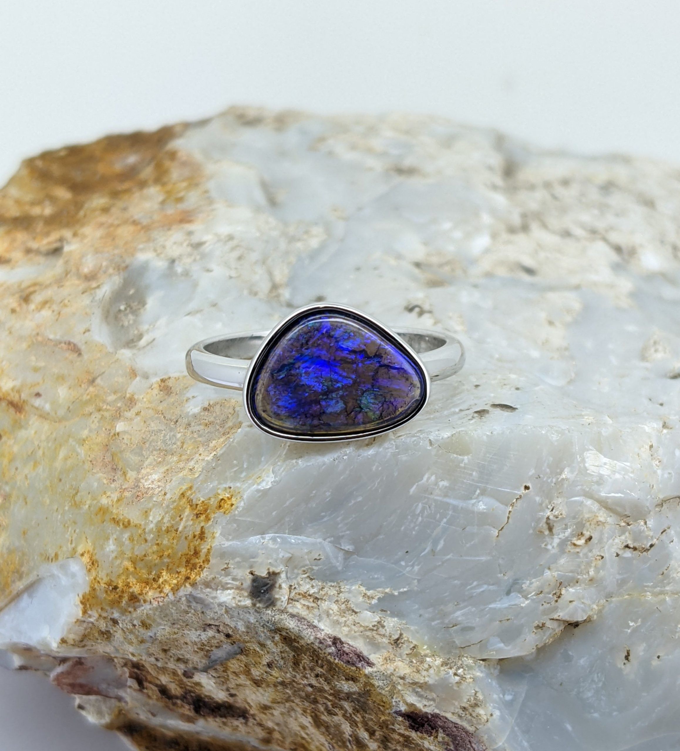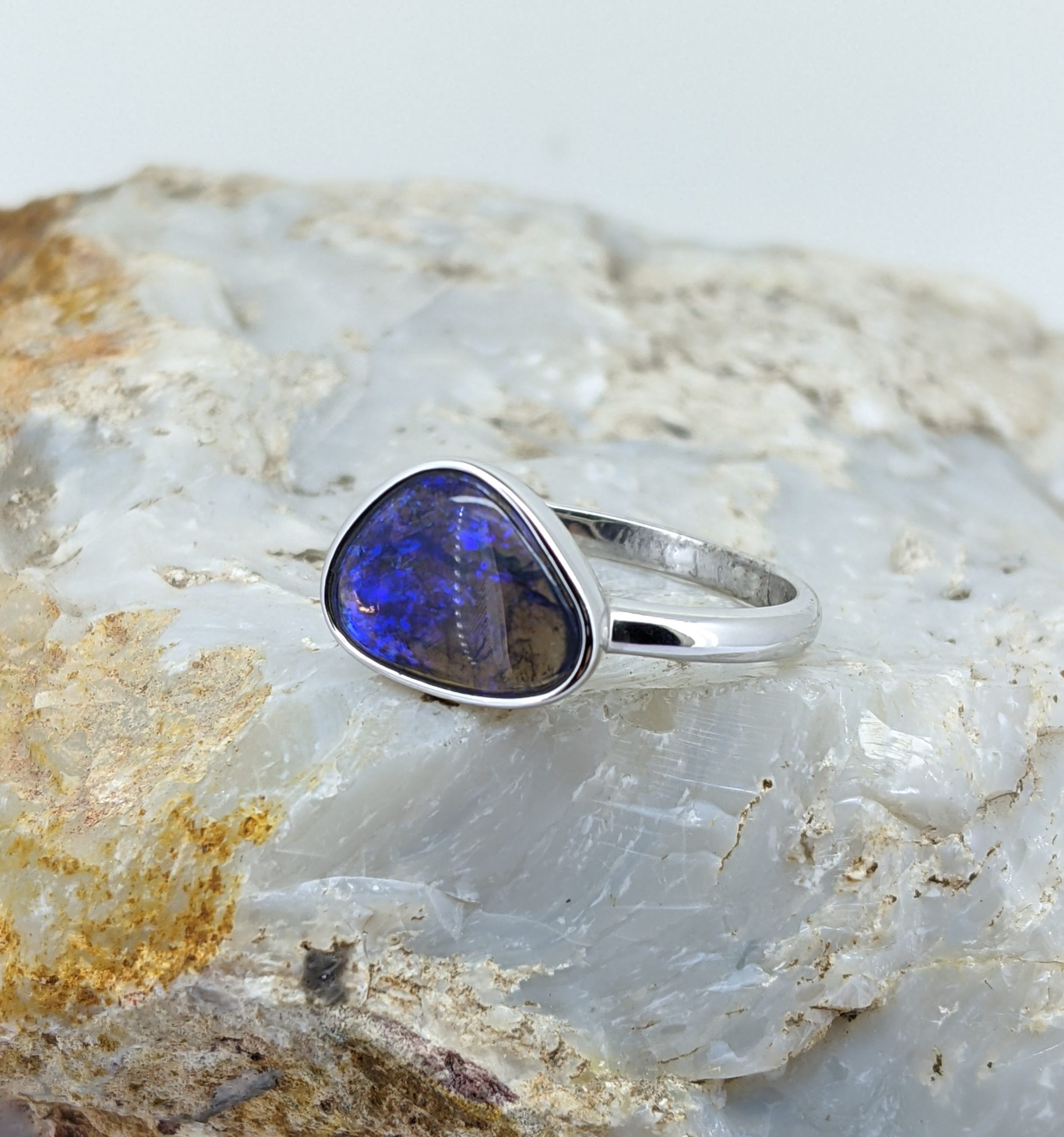 Solid natural black opal from Lightning Ridge, New South Wales. This solid black opal ring is set in 9K White Gold. The opal has a vibrant display of the colours blue and green.