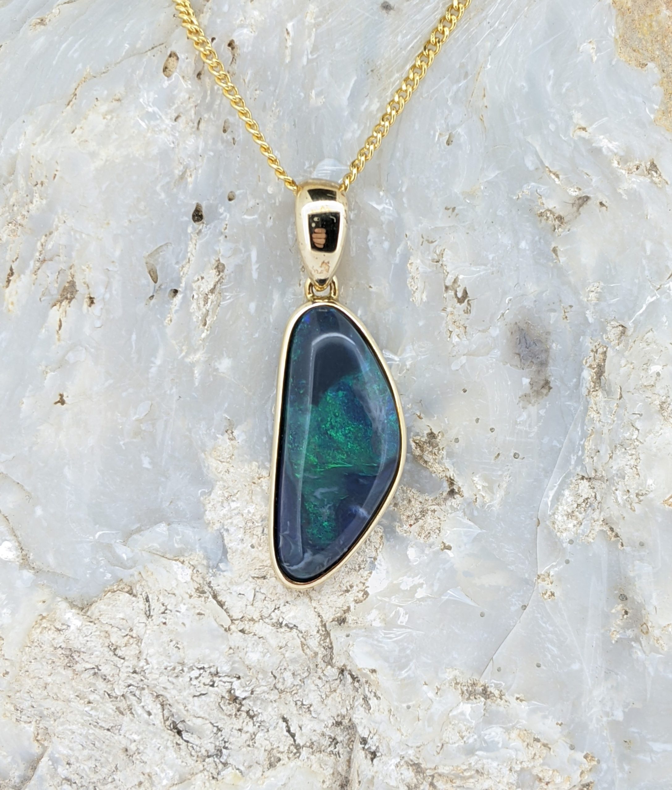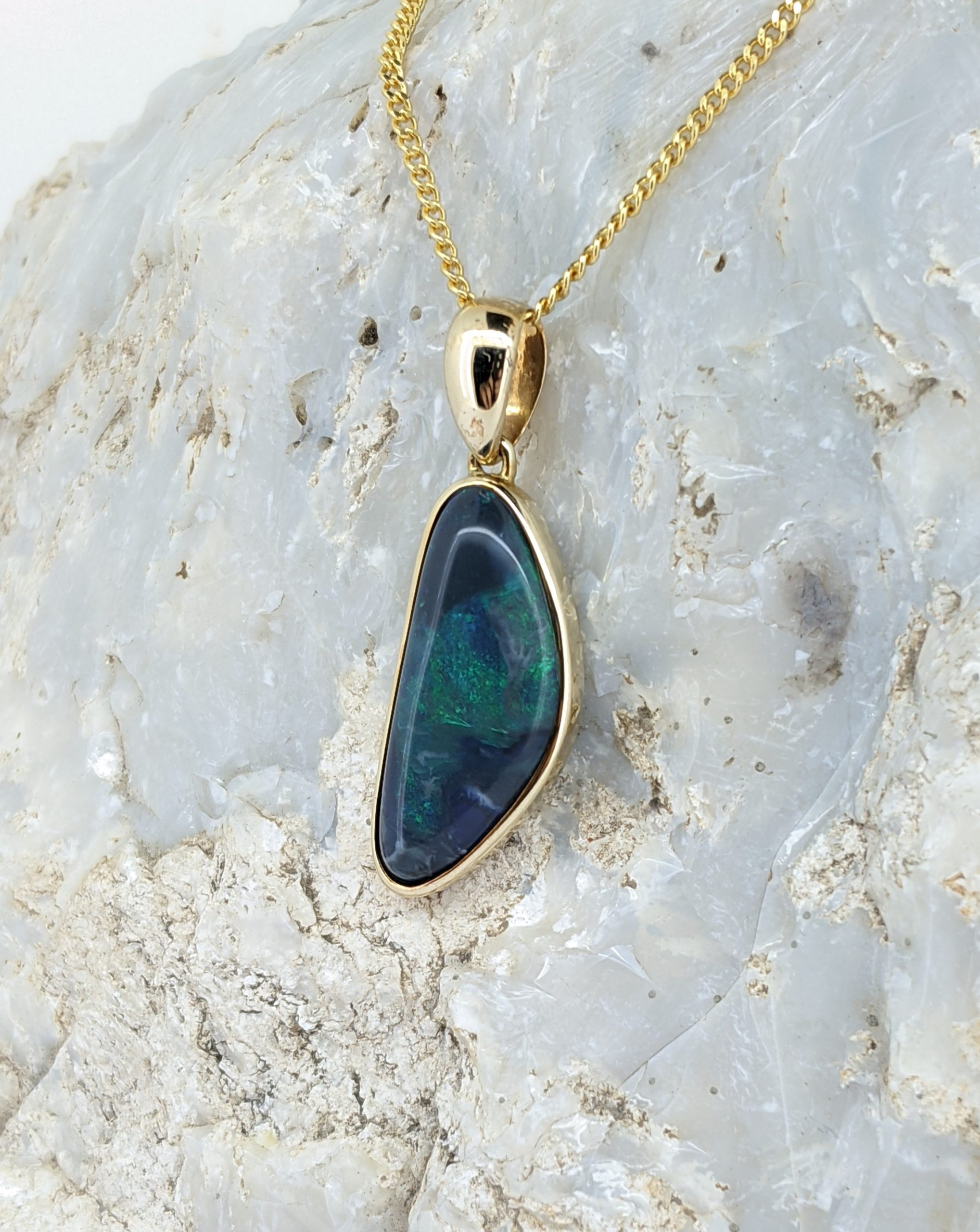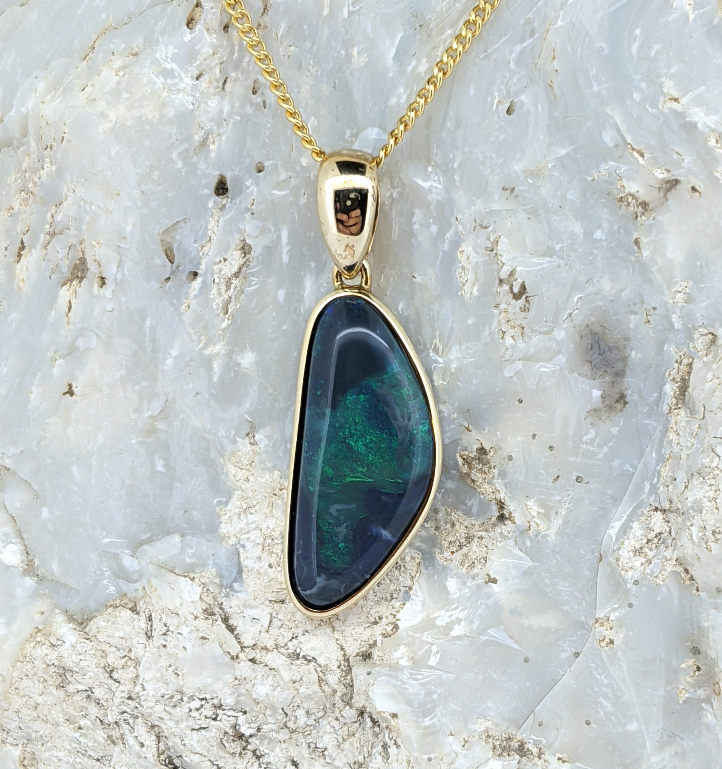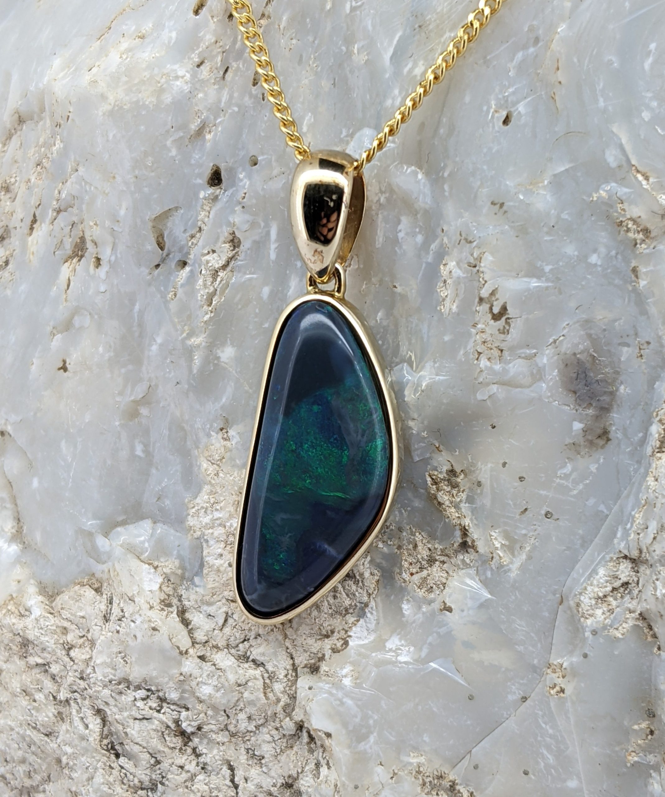 Solid natural black opal from Lightning Ridge, New South Wales. This solid black opal pendant is set in 9K Yellow Gold. The opal has a constant display of the colour green.