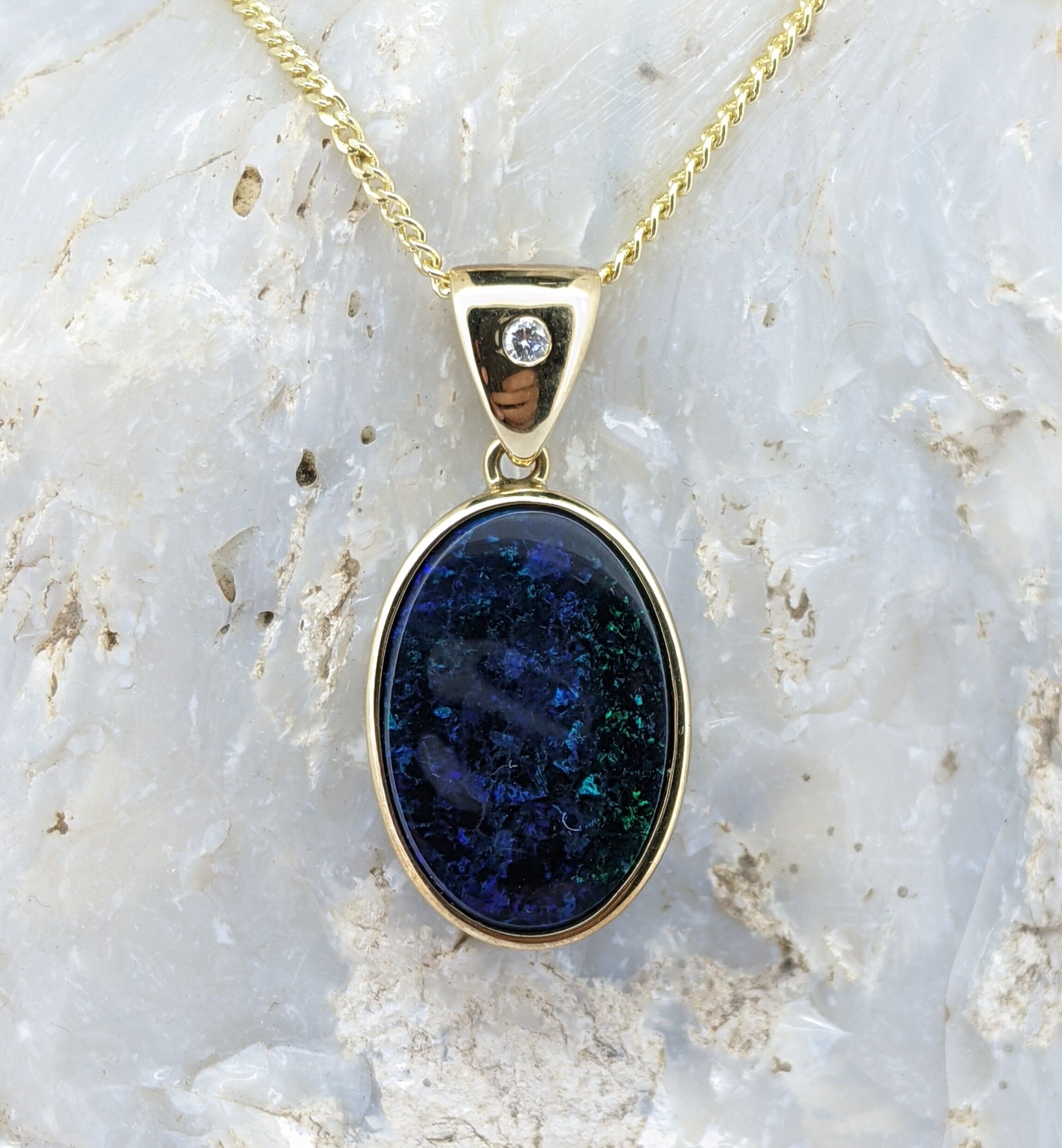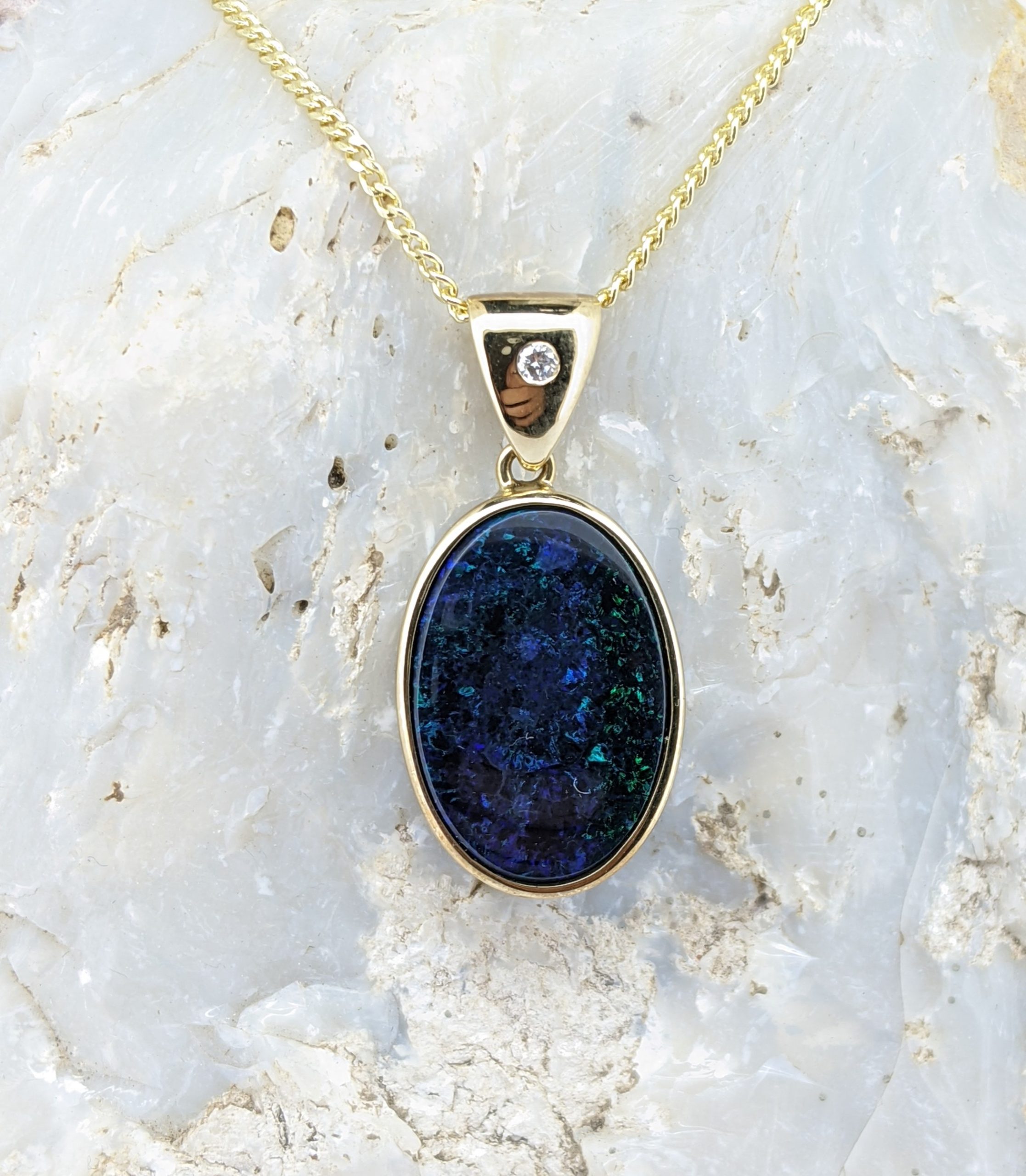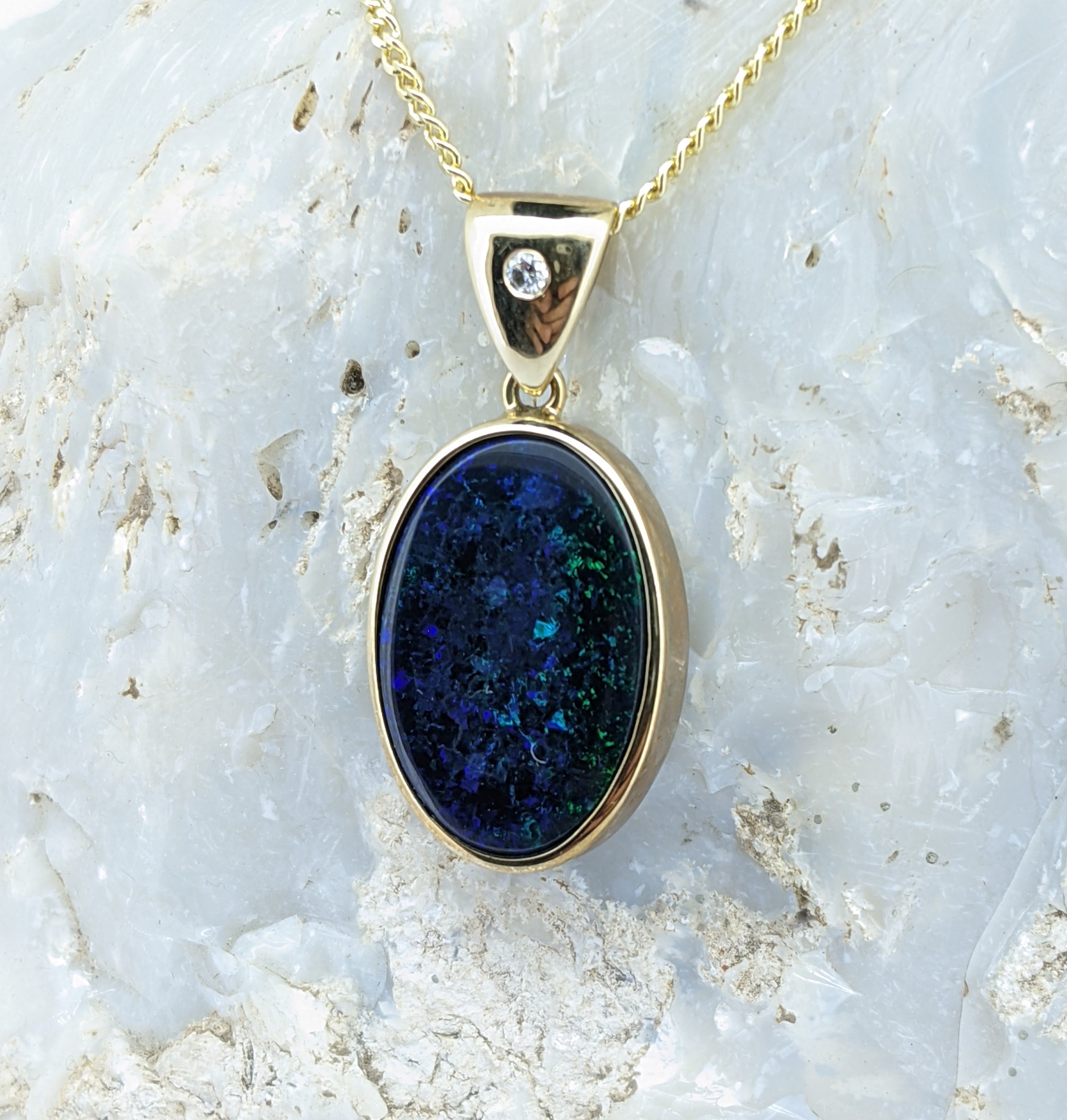Solid natural black opal from Lightning Ridge, New South Wales. This solid black opal pendant is set in 9K Yellow Gold. The opal is accentuated by a diamond, located within the bail. The opal itself has a sparkly display of the colours blue and green.