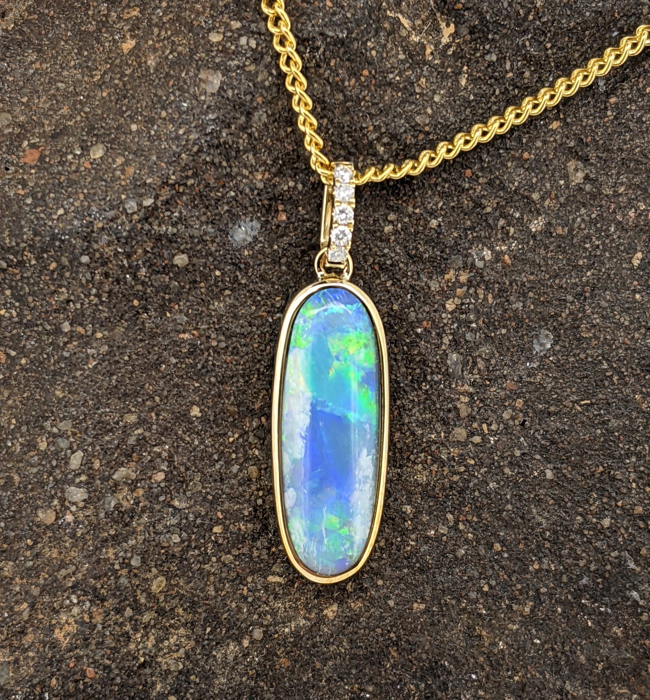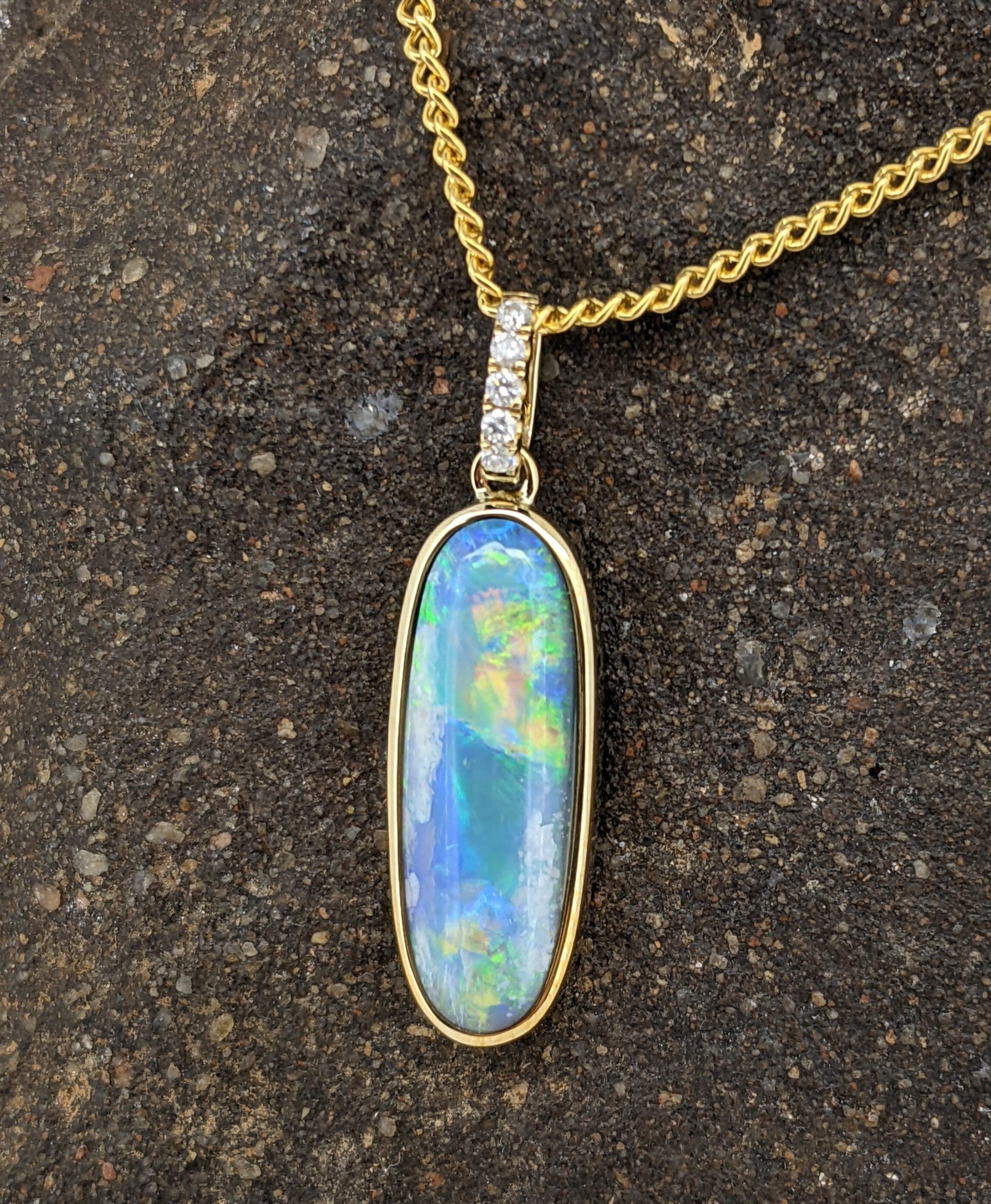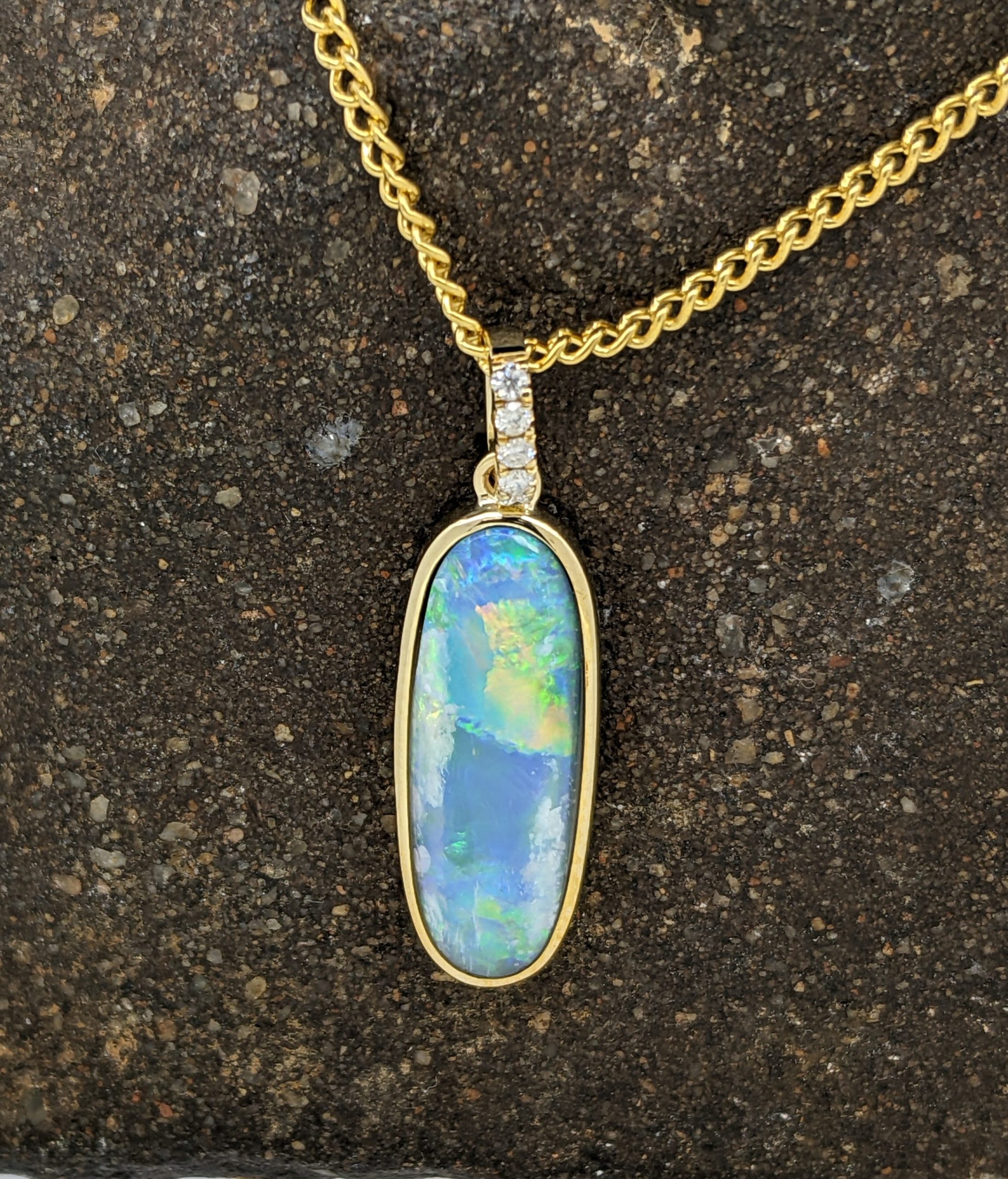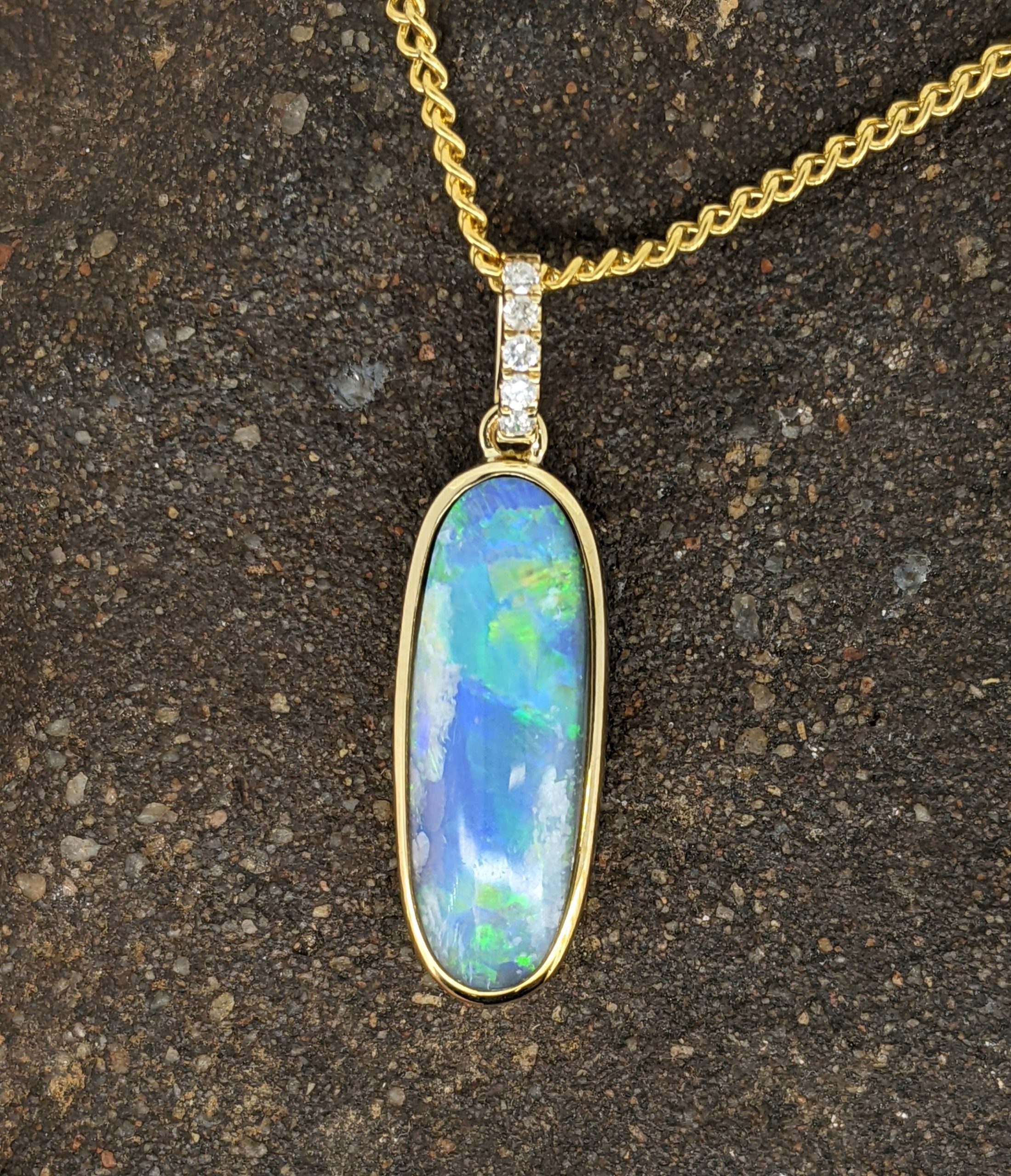 Solid natural black opal from Lightning Ridge, New South Wales. This solid black opal pendant is set in 9K Yellow Gold. The opal is accentuated by five diamonds located in the bail and has a flahy display of the colours green, blue, yellow and orange.