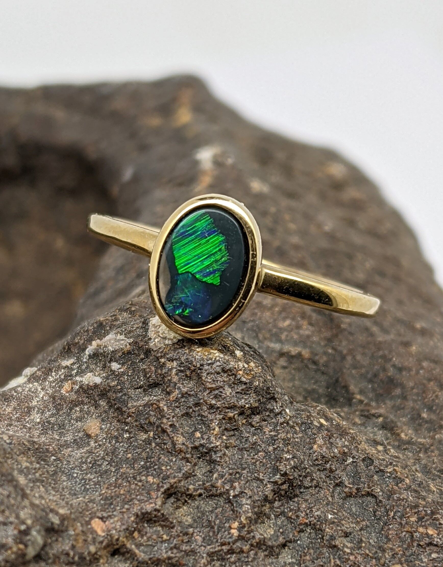 Solid natural black opal from Lightning Ridge, New South Wales. This solid black opal ring is made in 9K Yellow Gold and has a flashy display of the colours green, blue and orange.