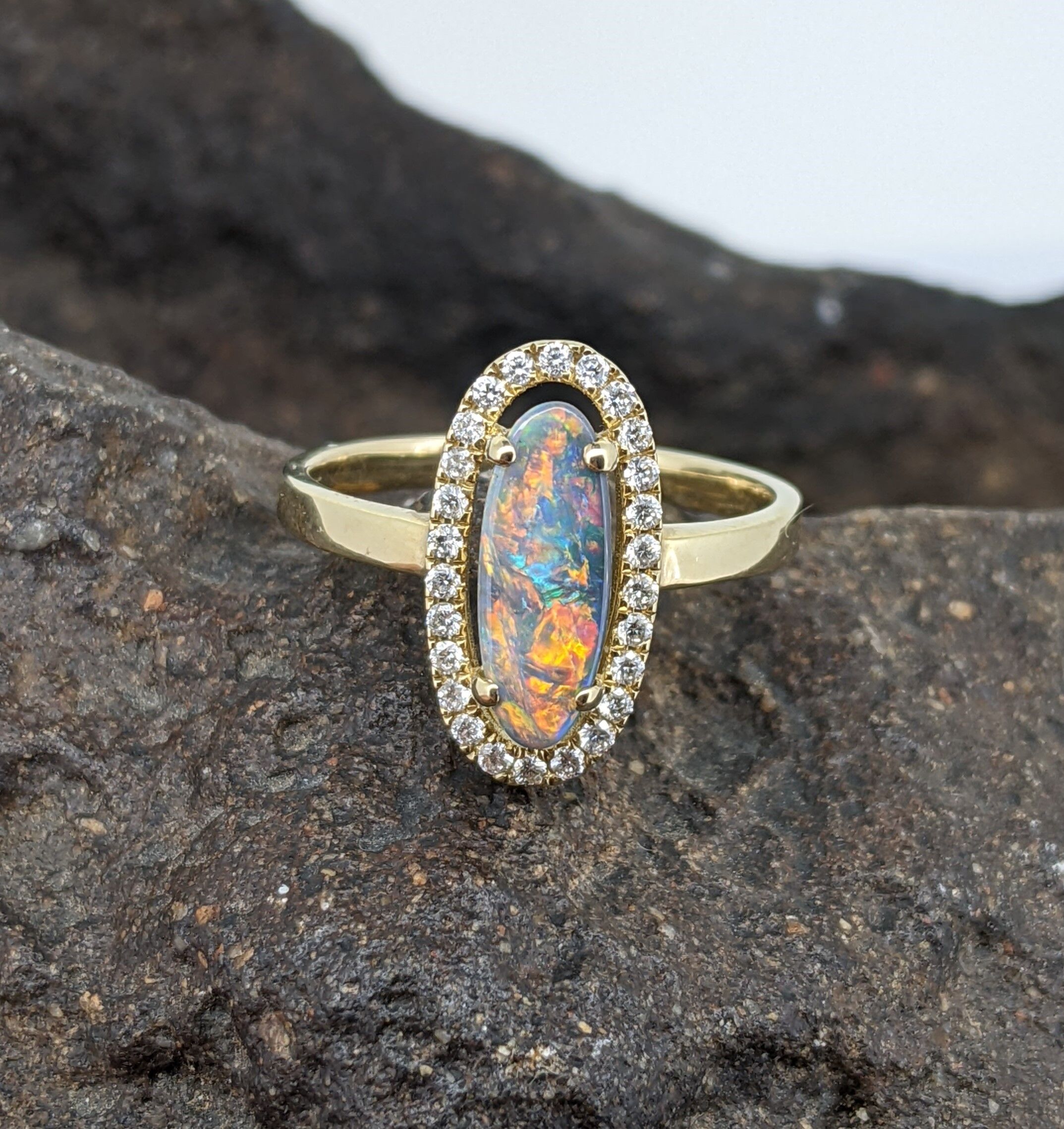 Solid natural black opal from Lightning Ridge, New South Wales. This solid black opal ring is set in 9K Yellow Gold is surrounded by a halo setting., made of 26 diamonds. This opal has an intensely vibrant display of the colours orange, red and blue.