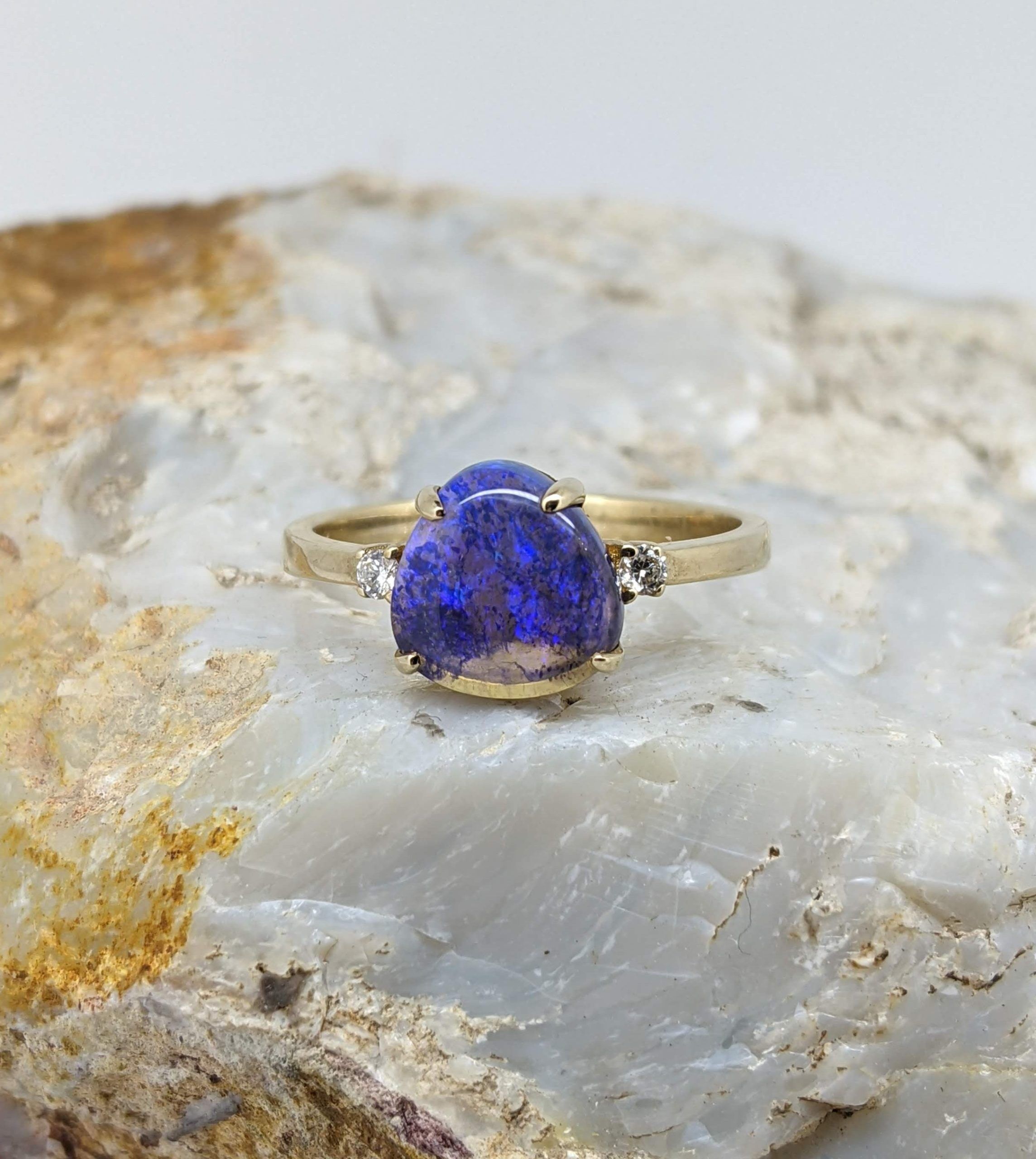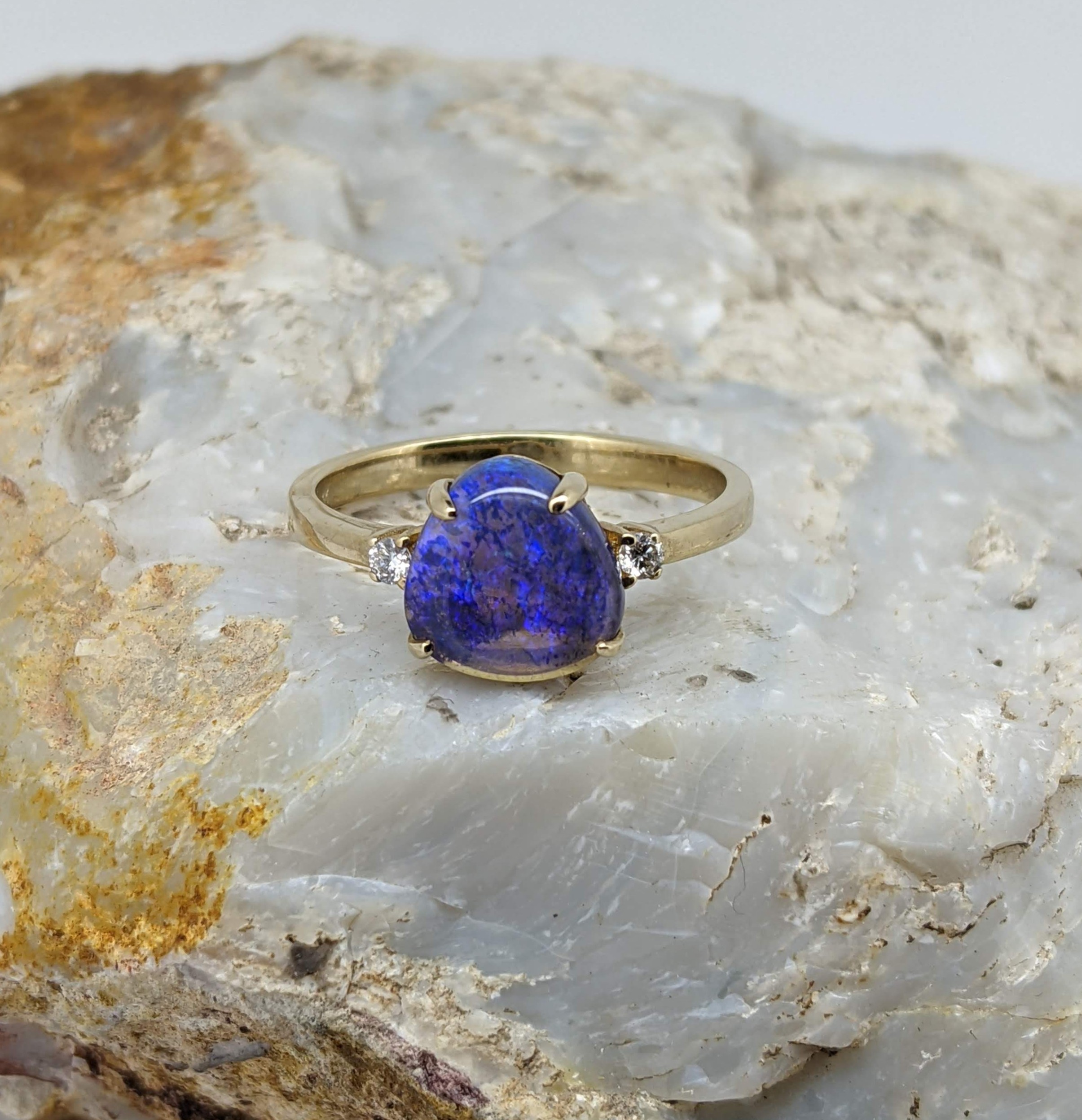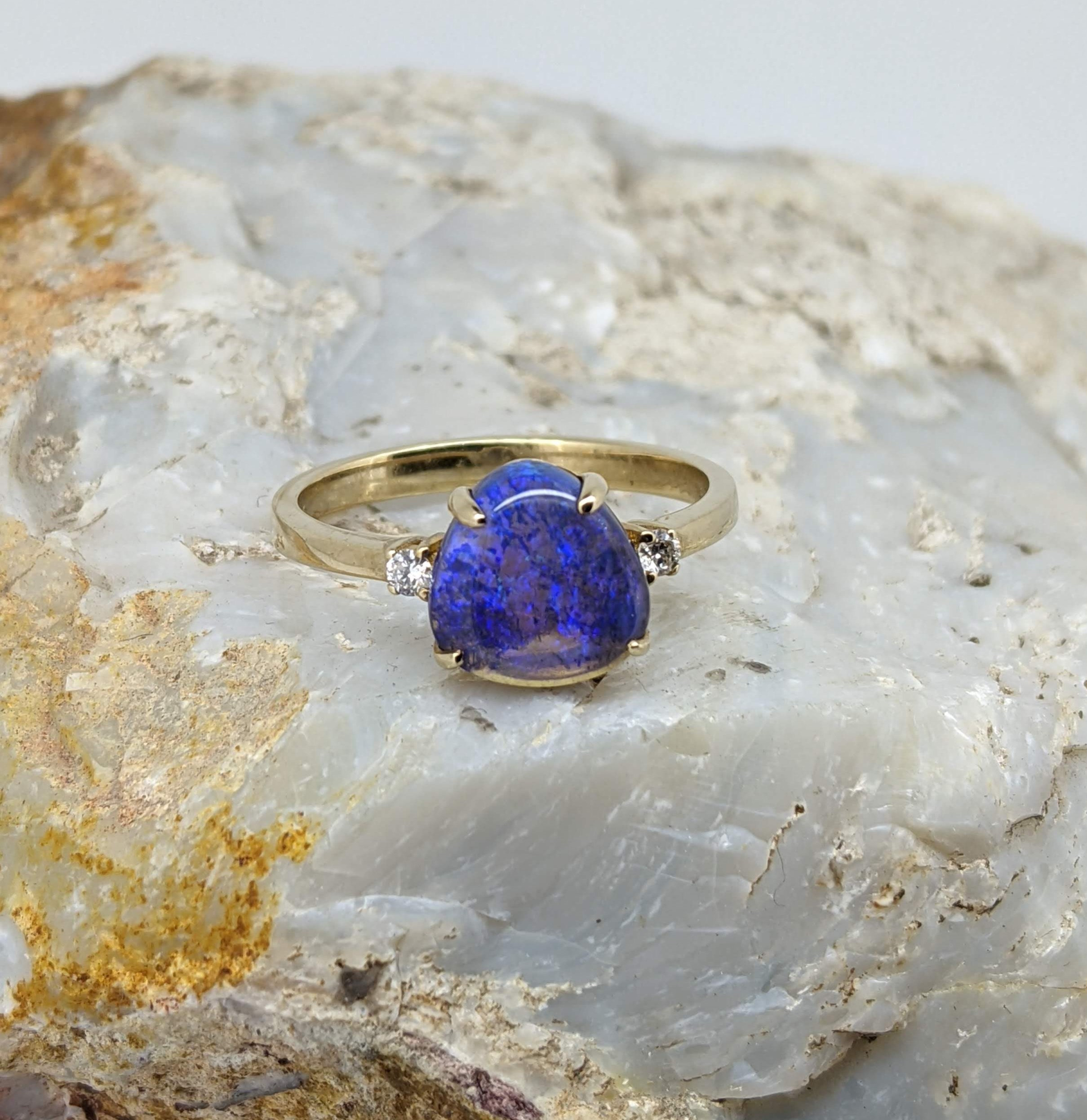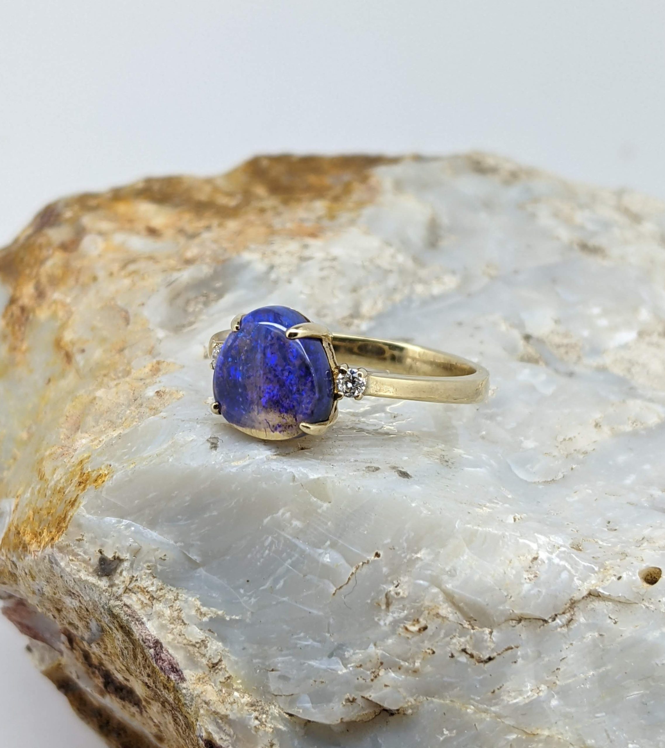 Solid natural black opal from Lightning Ridge, New South Wales. This solid black opal ring is crafted in 9K Yellow Gold. The opal is accentuated by two diamonds and has a constant display of the colour blue.