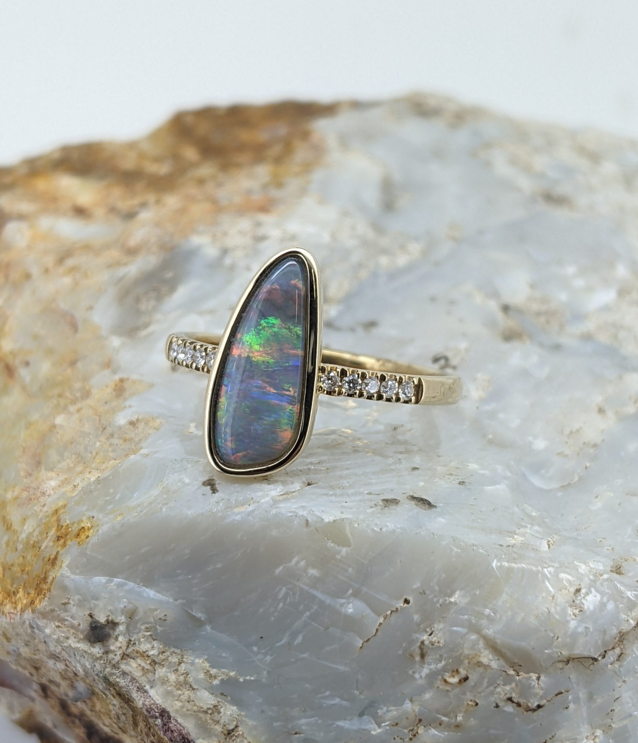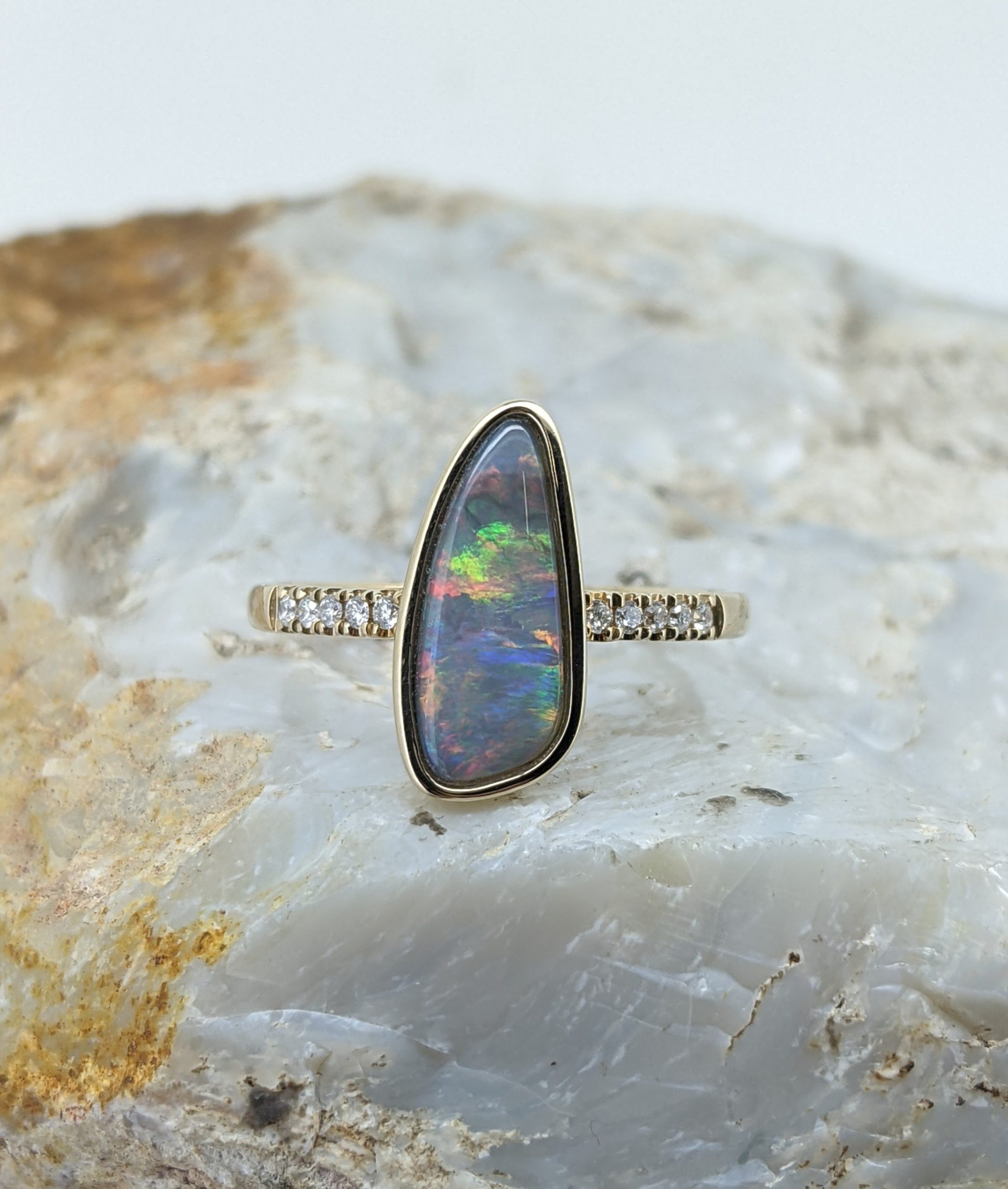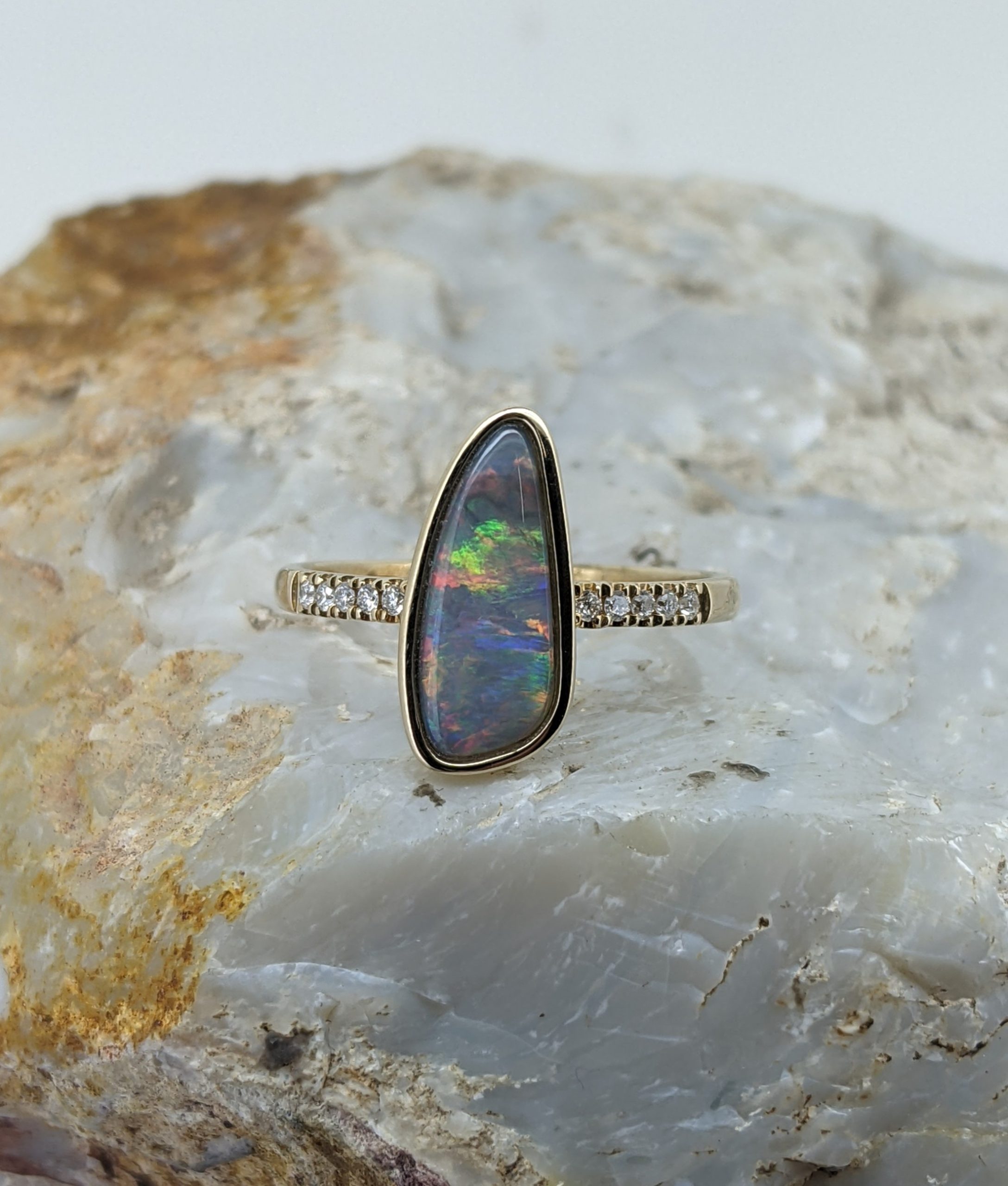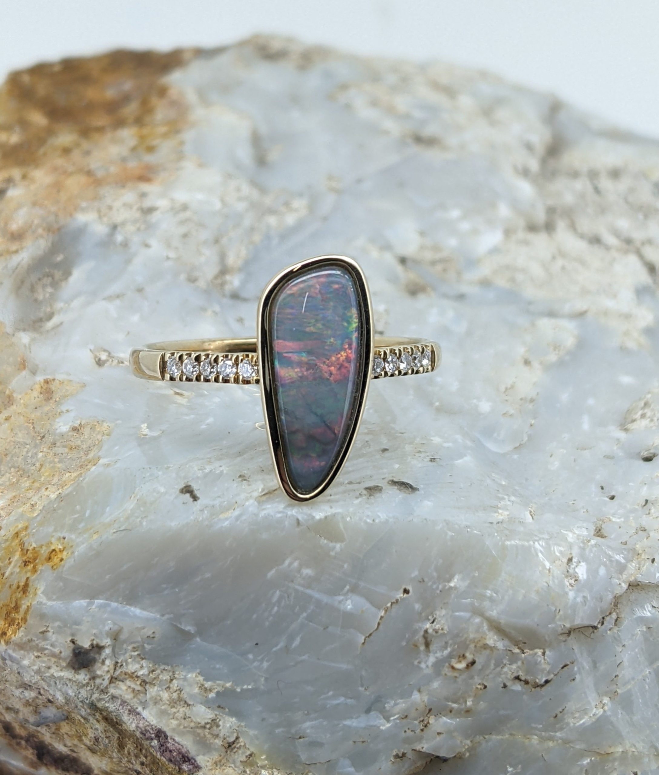 Solid natural black opal from Lightning Ridge, New South Wales. This solid black opal ring is crafted in 9K Yellow Gold. The opal is accentuated by 10 diamonds and has a vibrant display of the colours red, orange, yellow and green.