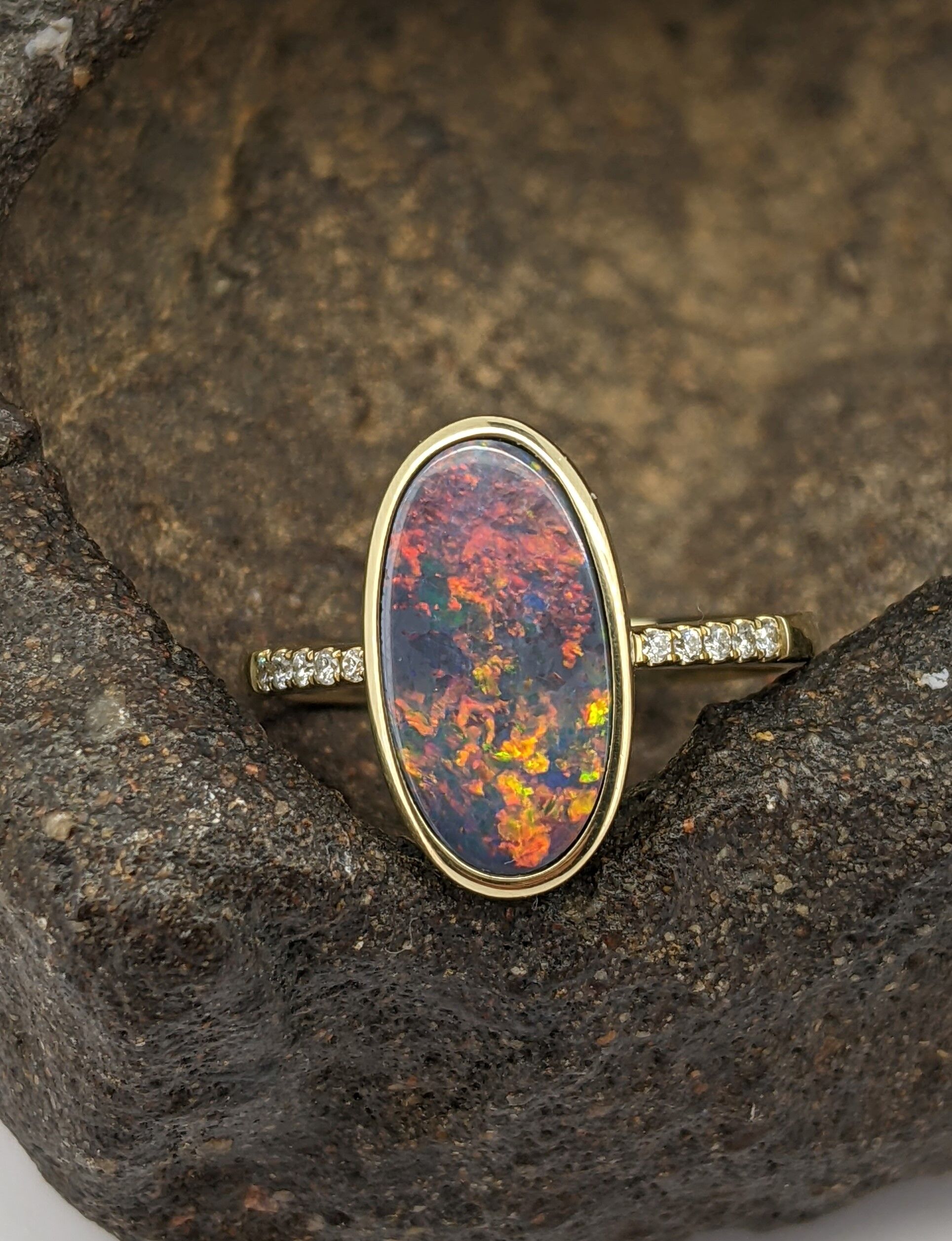 Solid natural black opal from Lightning Ridge, New South Wales. This solid black opal ring is made in 9K Yellow Gold and is accentuated by ten diamonds. The opal itself has a vibrant display of the colours red, orange and blue.