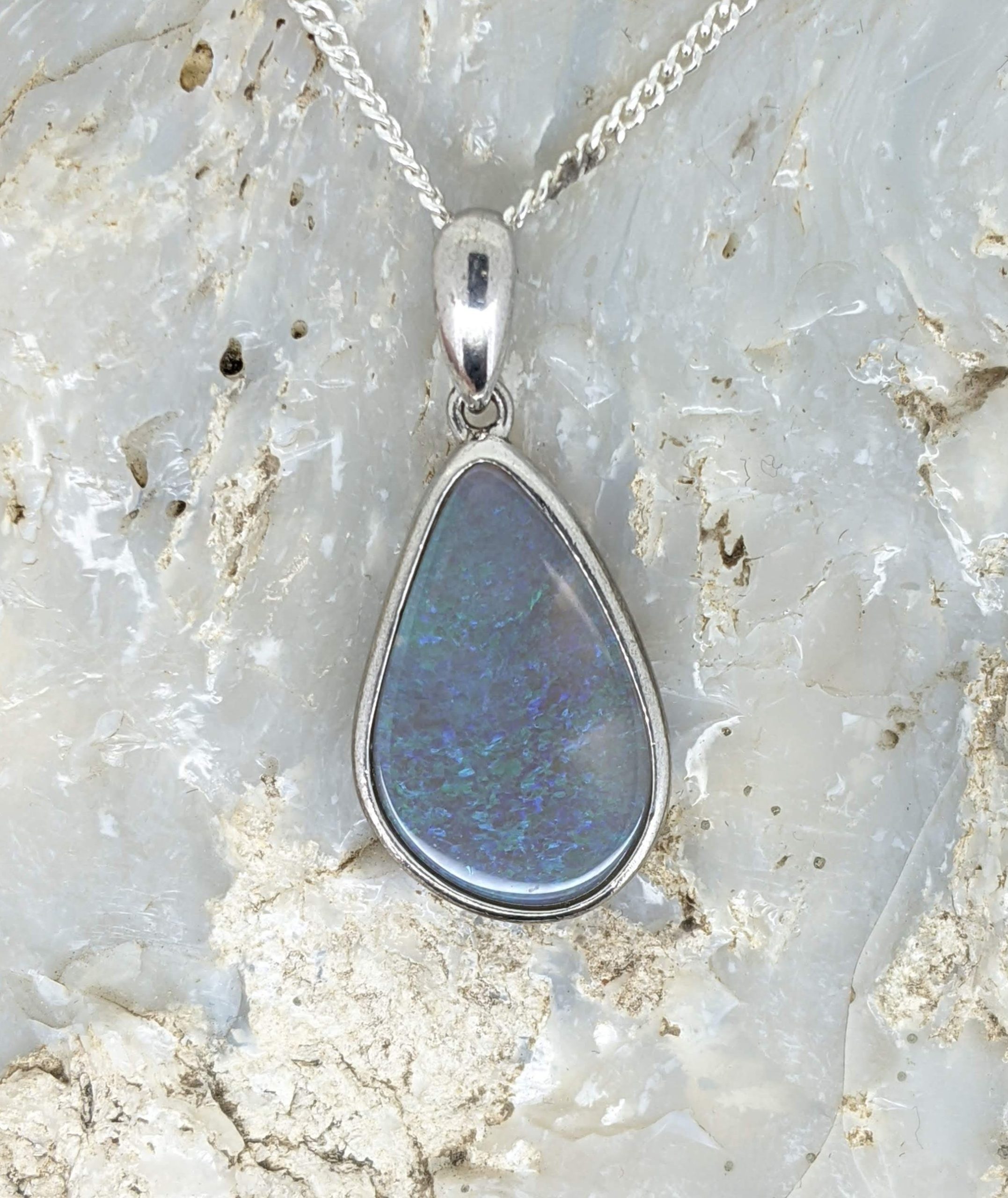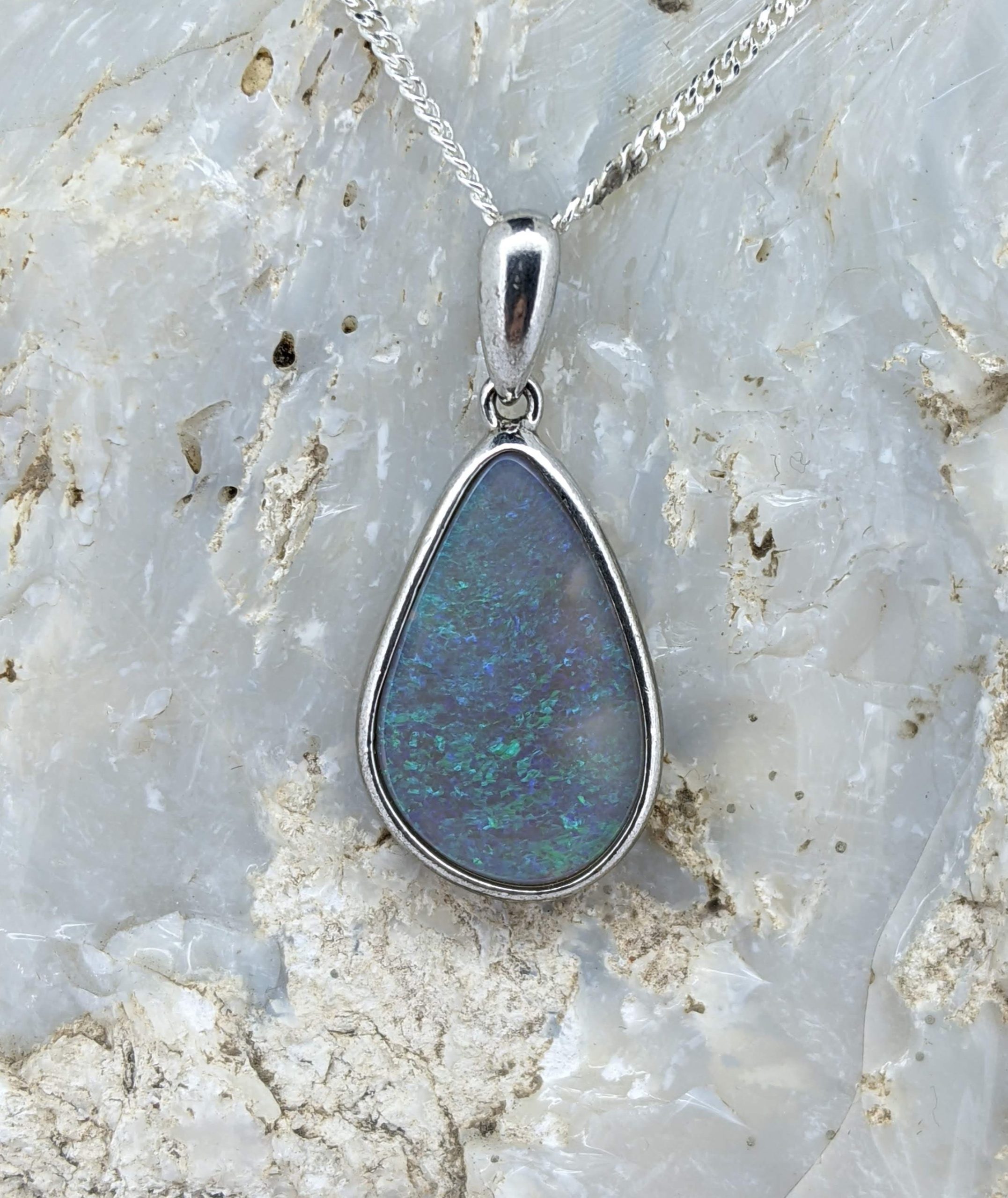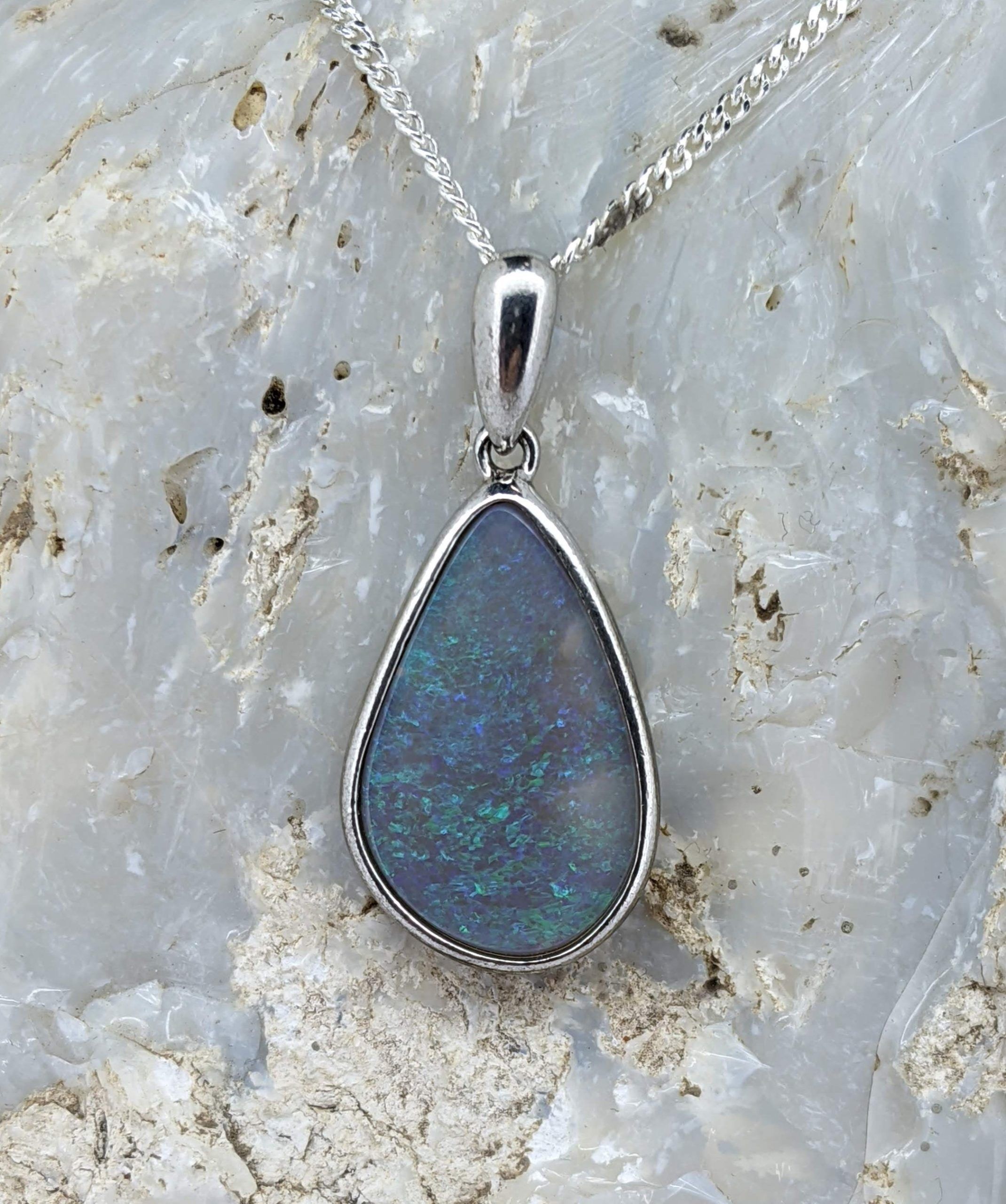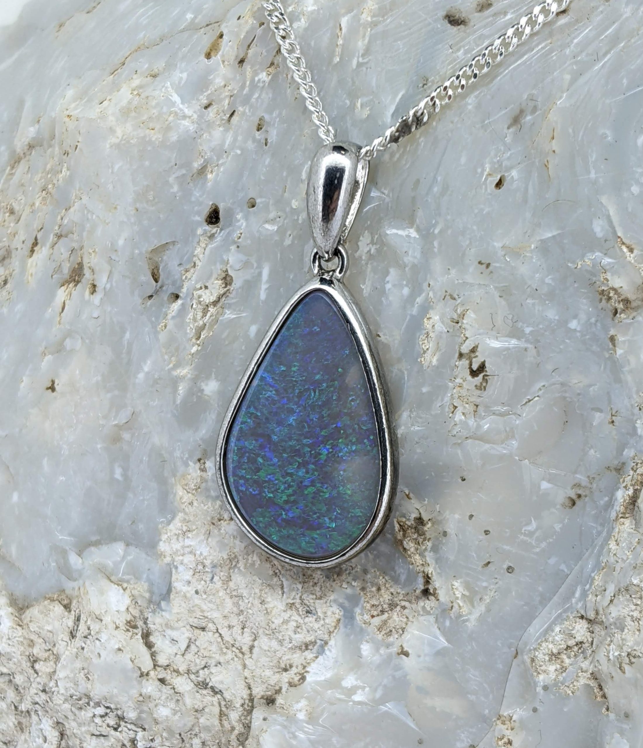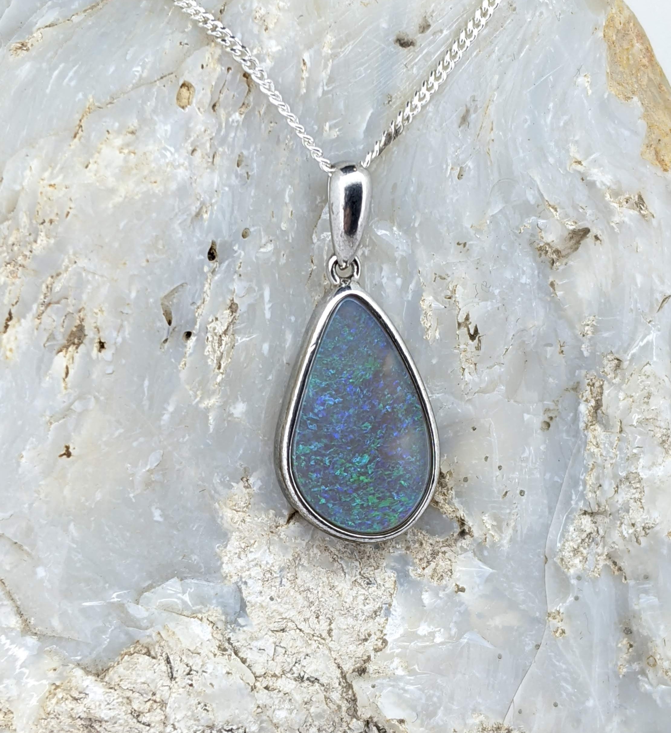 Solid natural black opal from Lightning Ridge, New South Wales. This solid black opal pendant is set in Sterling Silver. The opal has a display of the colours green and blue.