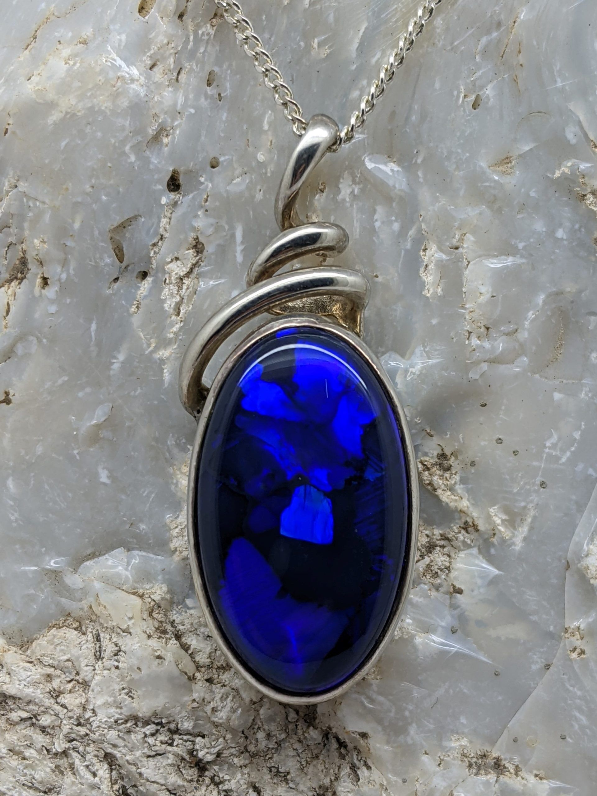 Solid natural black opal from Lightning Ridge, New South Wales. This solid black opal pendant is set in Sterling Silver and has a vibrant, flashy display of the colours blue and green.