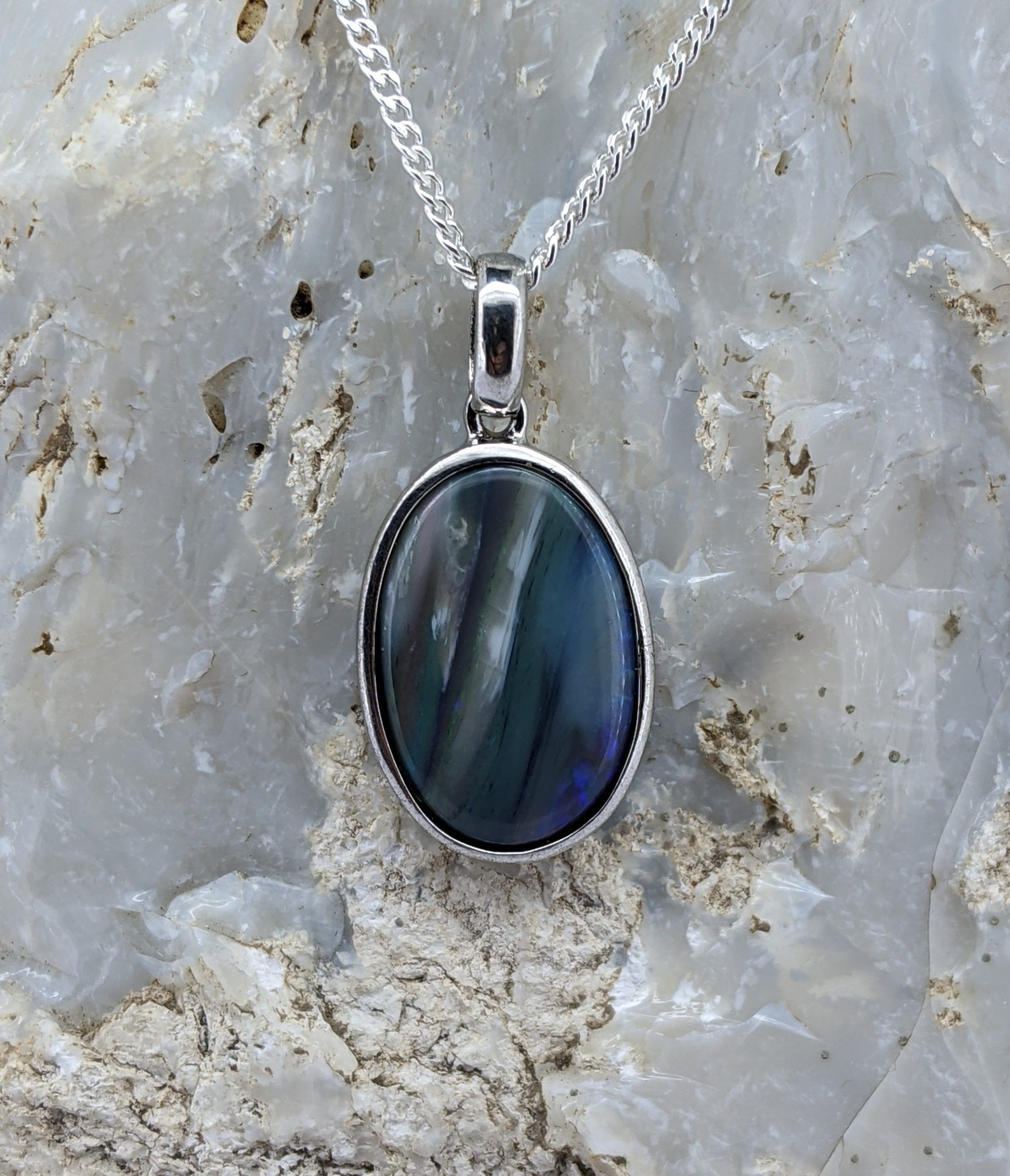 Solid natural black opal from Lightning Ridge, New South Wales. This solid black opal pendant is set in Sterling Silver. The opal has an interesting and unique striped pattern, displaying the colours grey, green, blue and white.