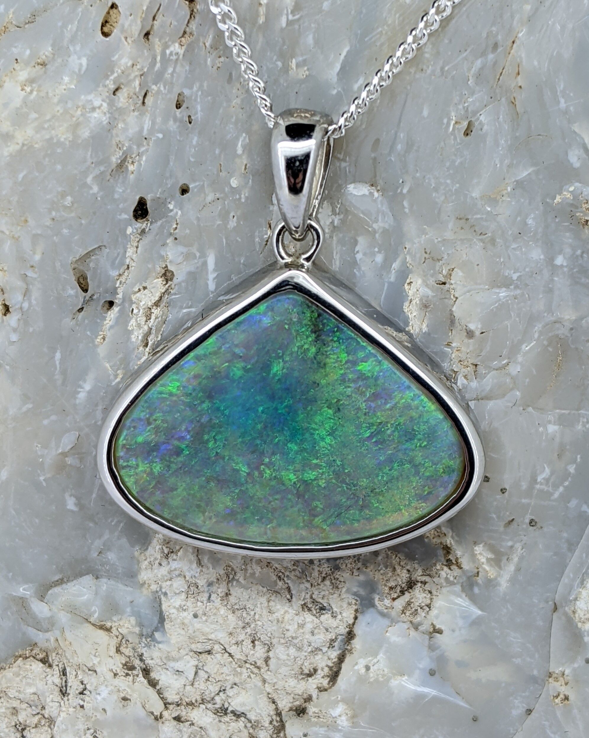 Solid natural black opal from Lightning Ridge, New South Wales. This solid black opal pendant is set in Sterling Silver and has an intense, vibrant display of the colours blue, green and yellow.