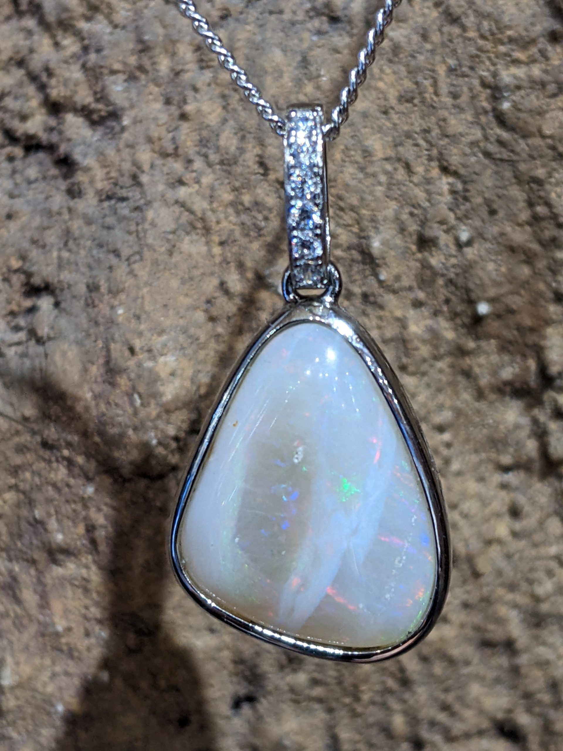 Solid natural black opal from Lightning Ridge, New South Wales. This solid black opal pendant is set in Sterling Silver and is decorated with cubic zirconias in the bail. It has a vibrant display of the colours red, orange, green and blue.