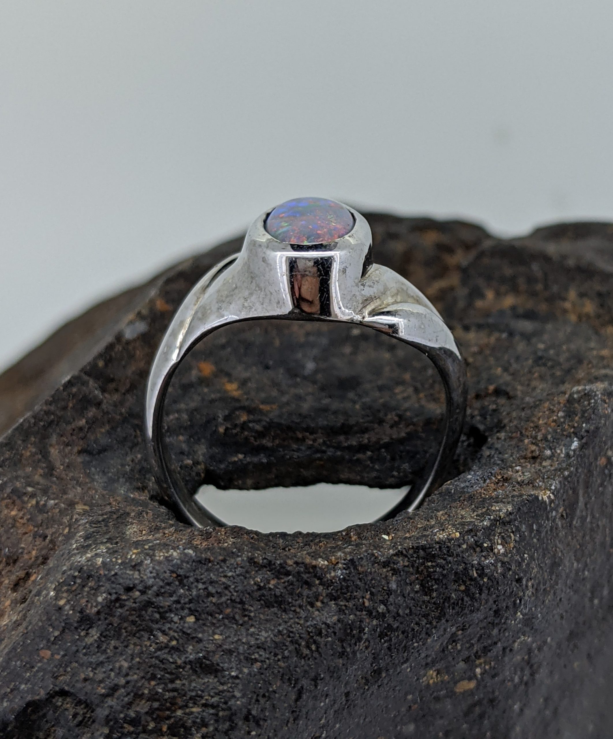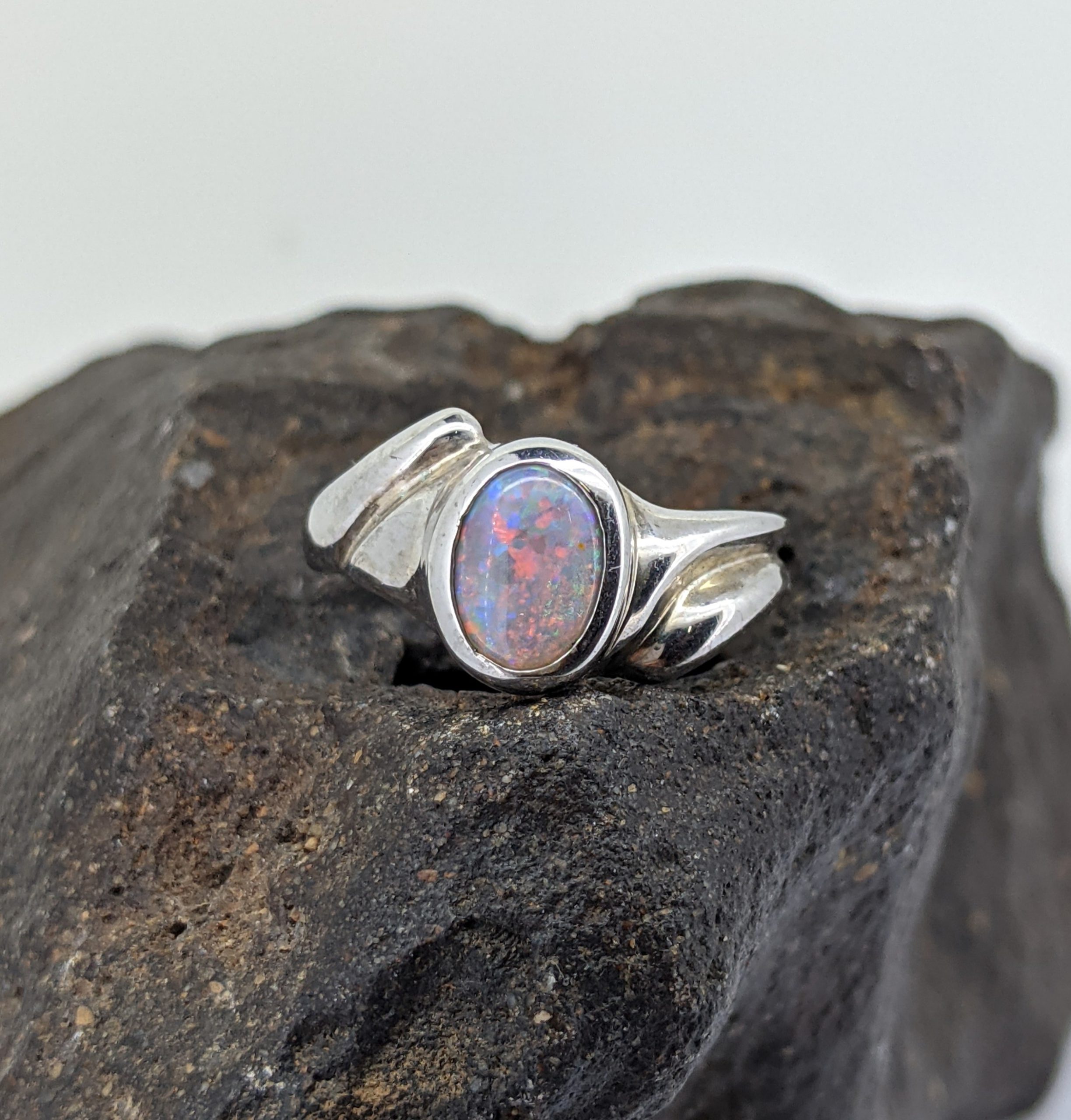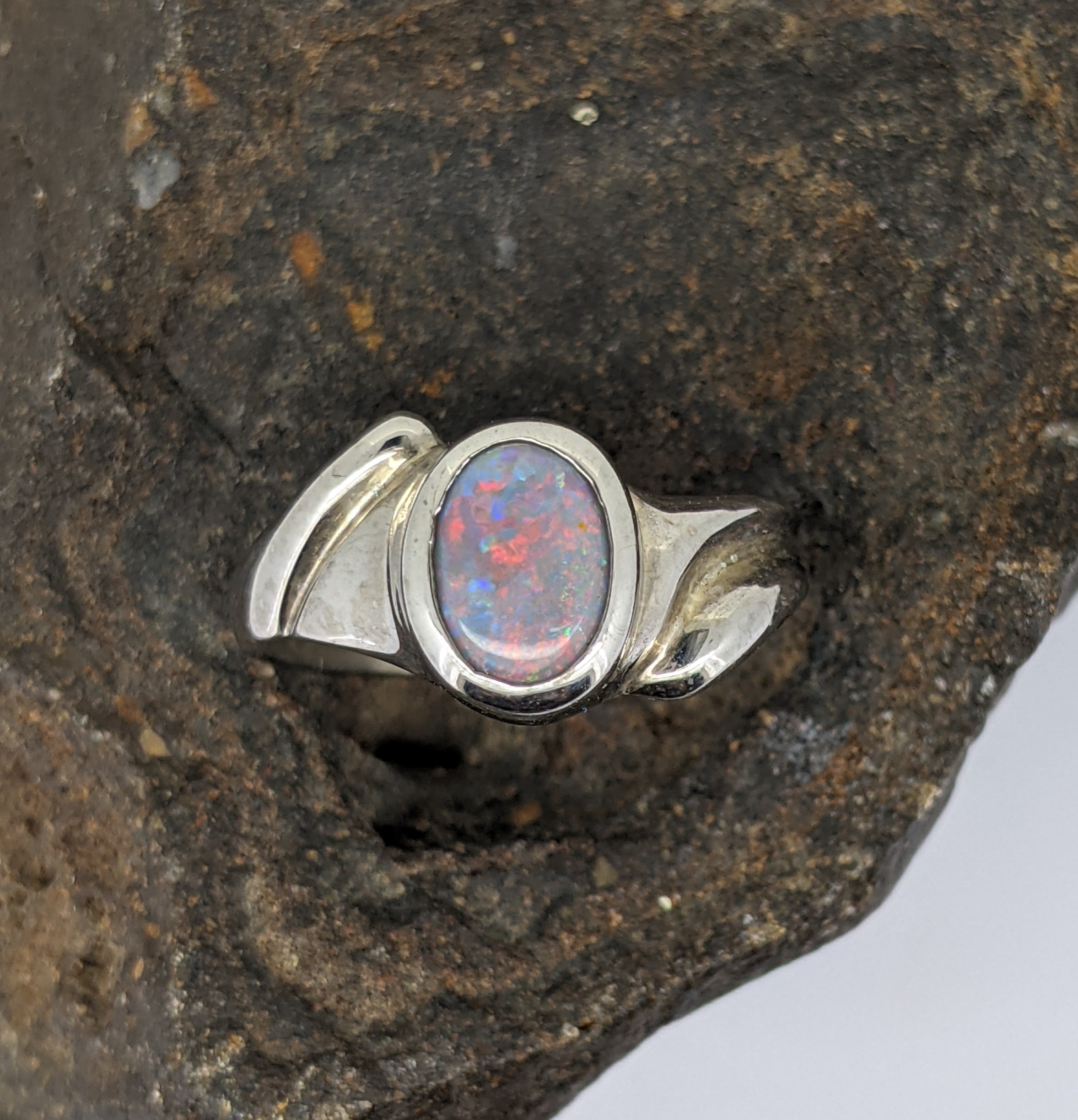 Solid natural black opal from Lightning Ridge, New South Wales. This solid black opal ring is set in Sterling Silver. The opal has a vibrant display of the colours red and blue.