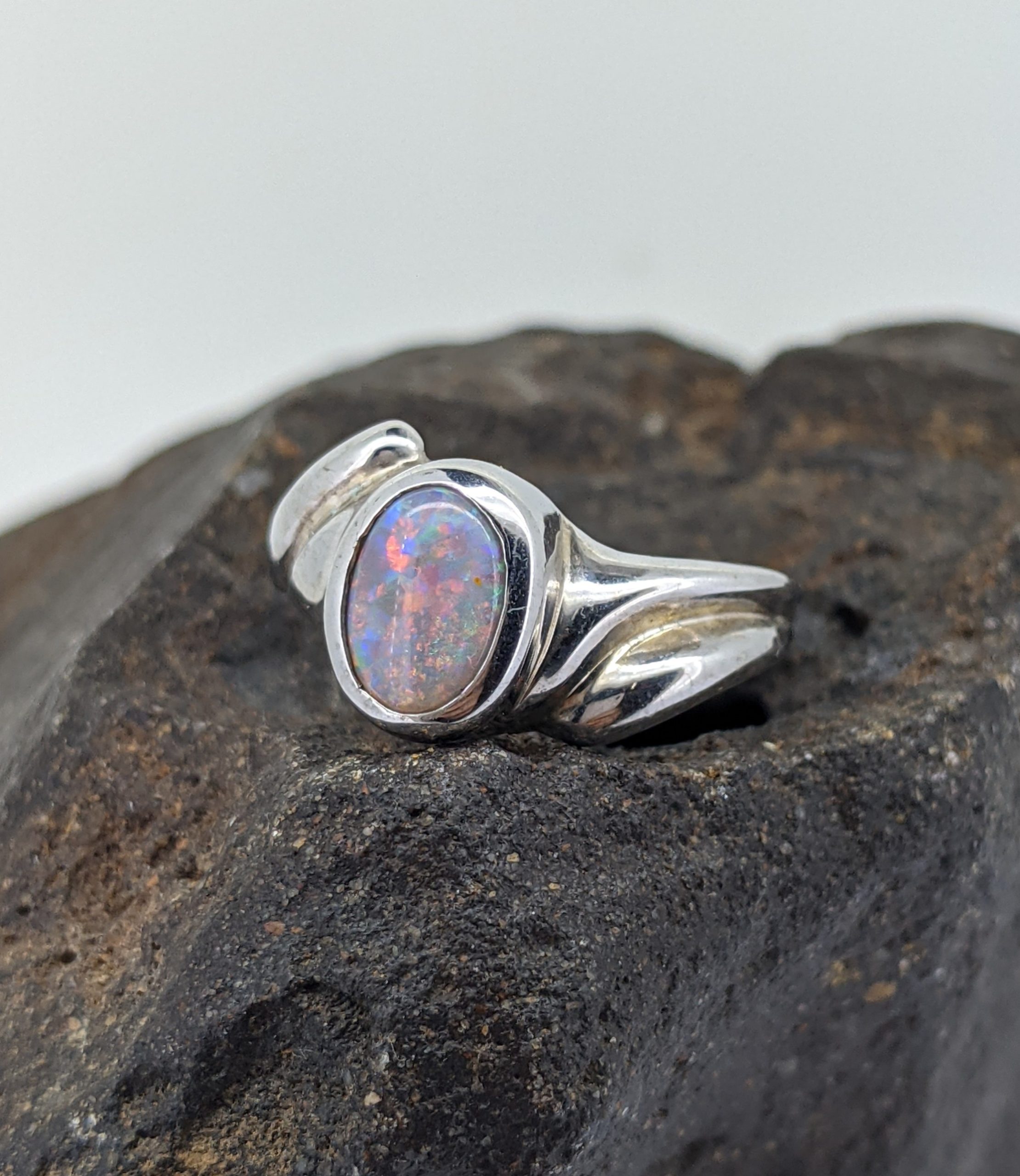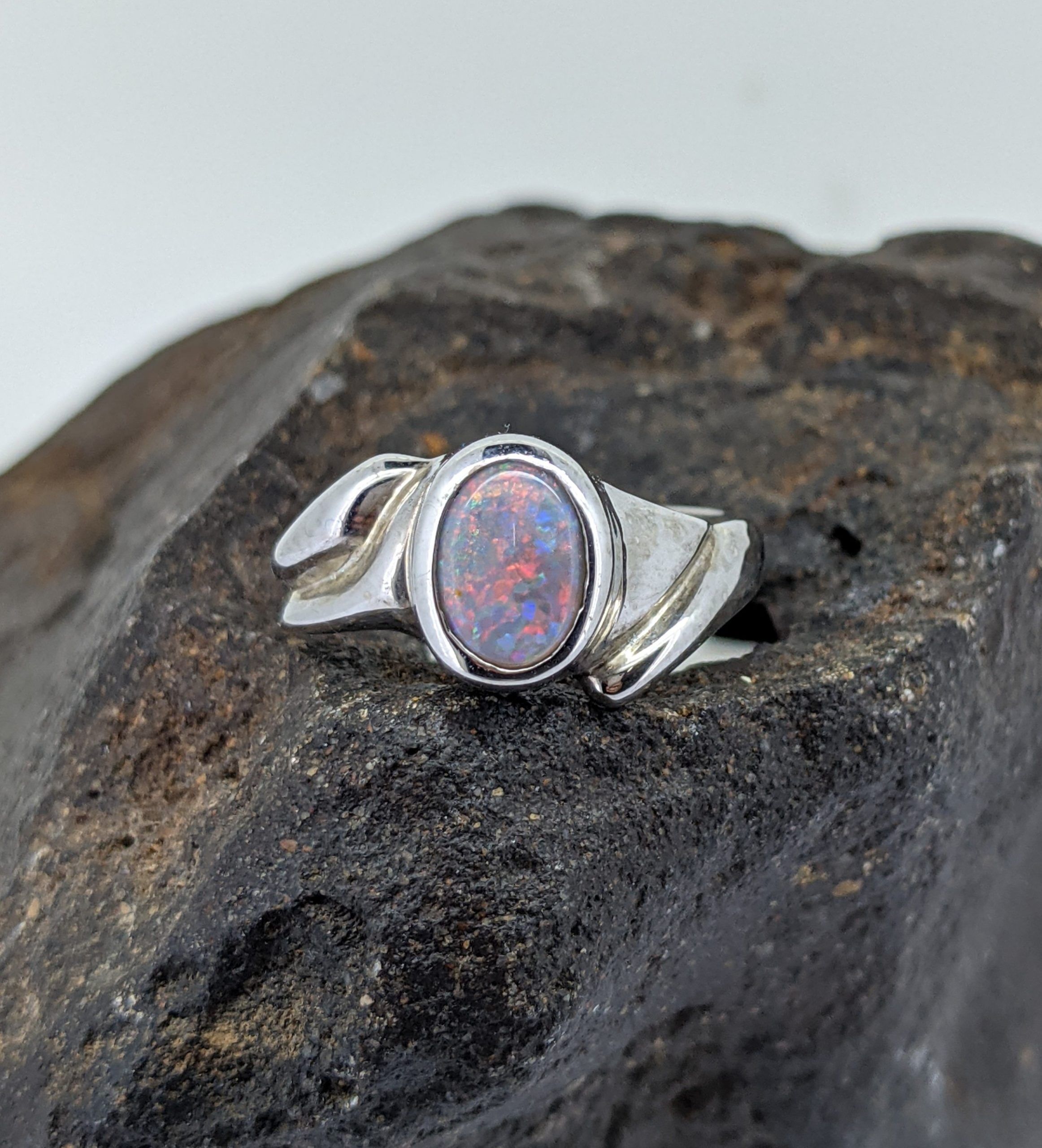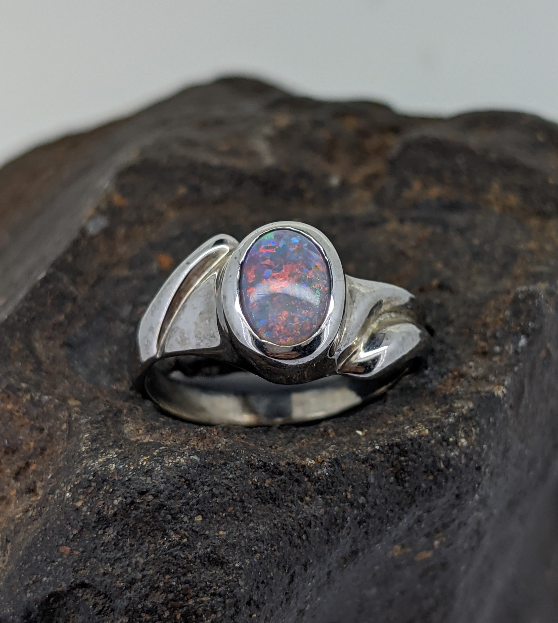 Solid natural black opal from Lightning Ridge, New South Wales. This solid black opal ring is set in Sterling Silver. The opal has a vibrant display of the colours red and blue.