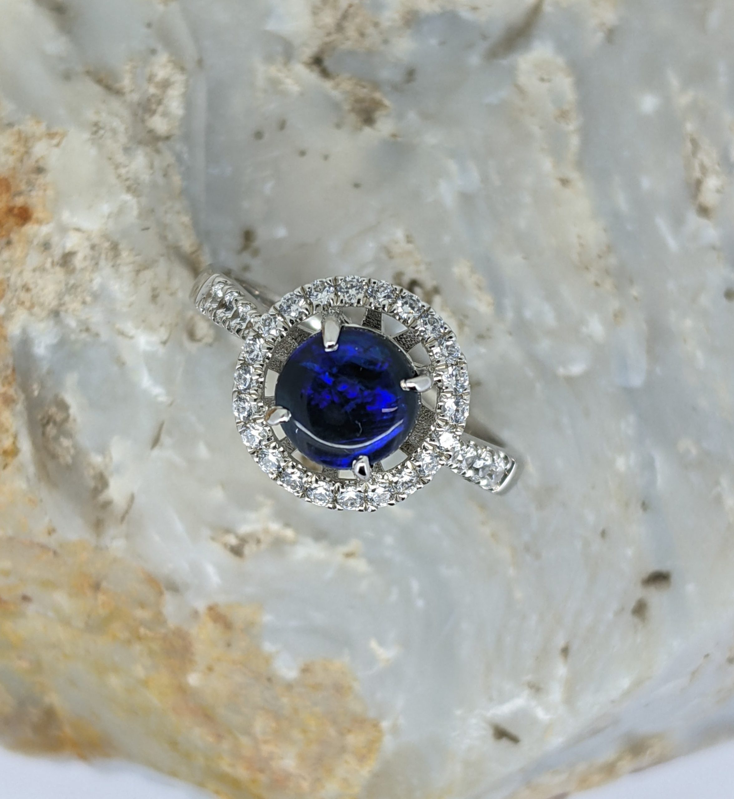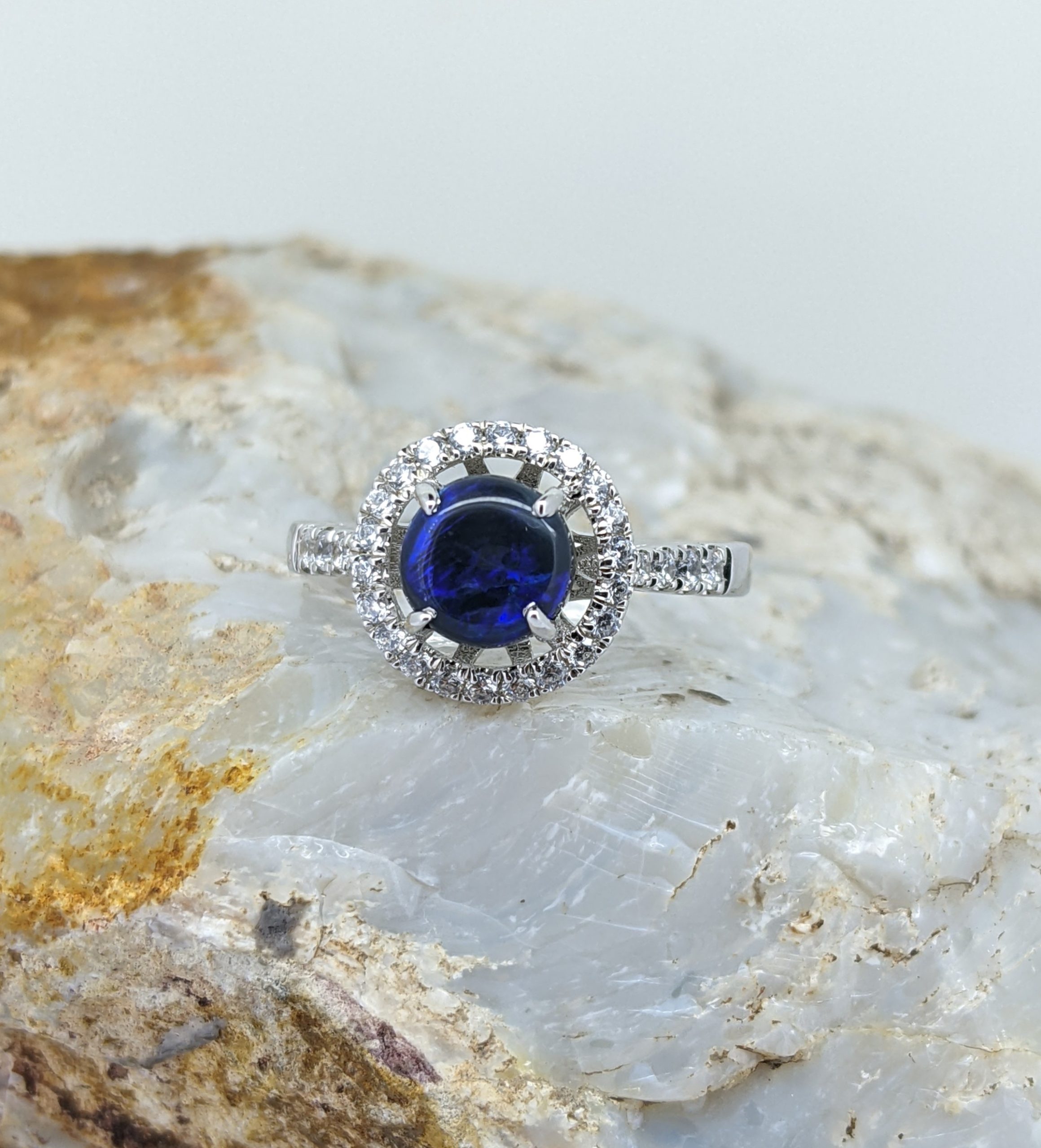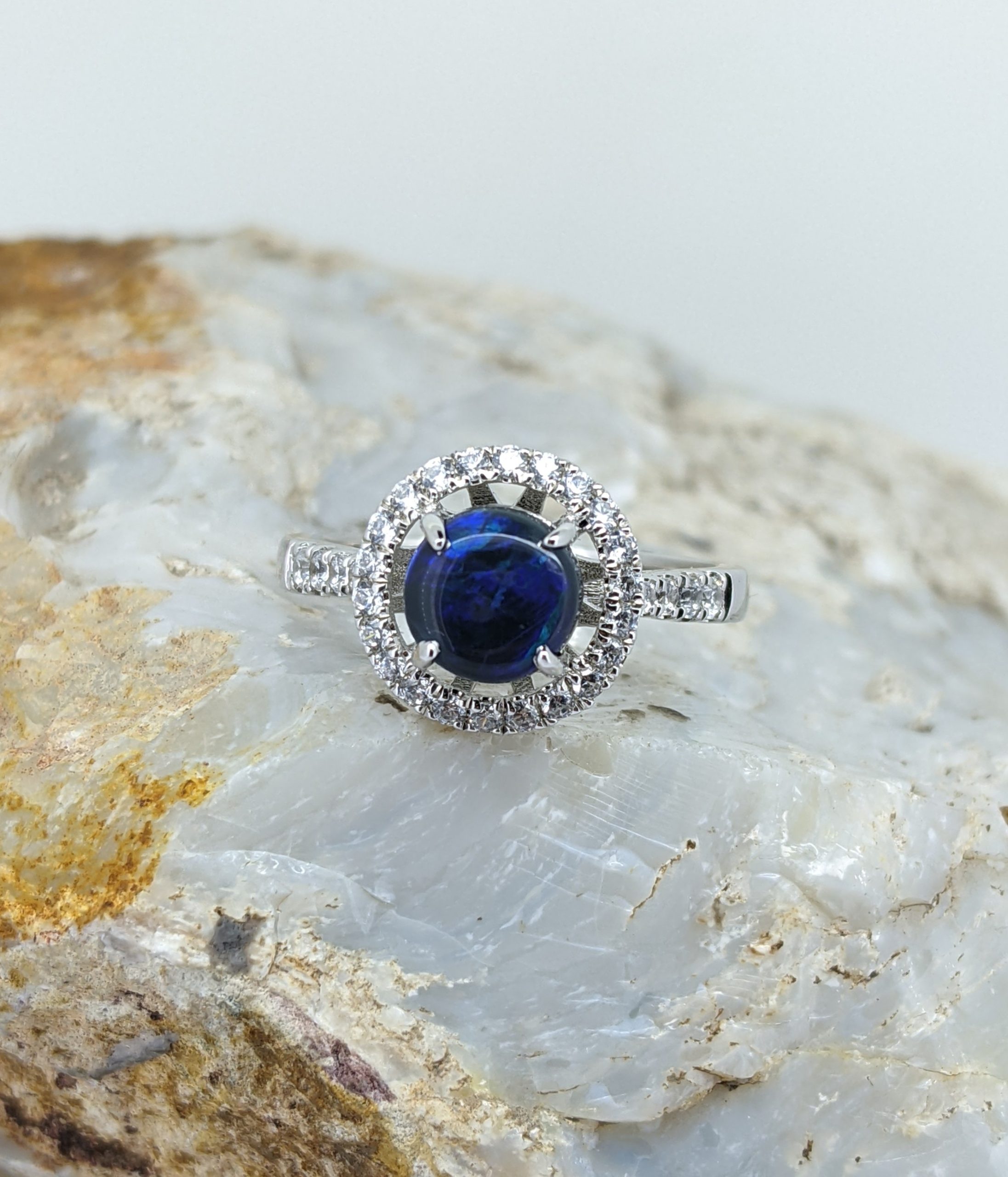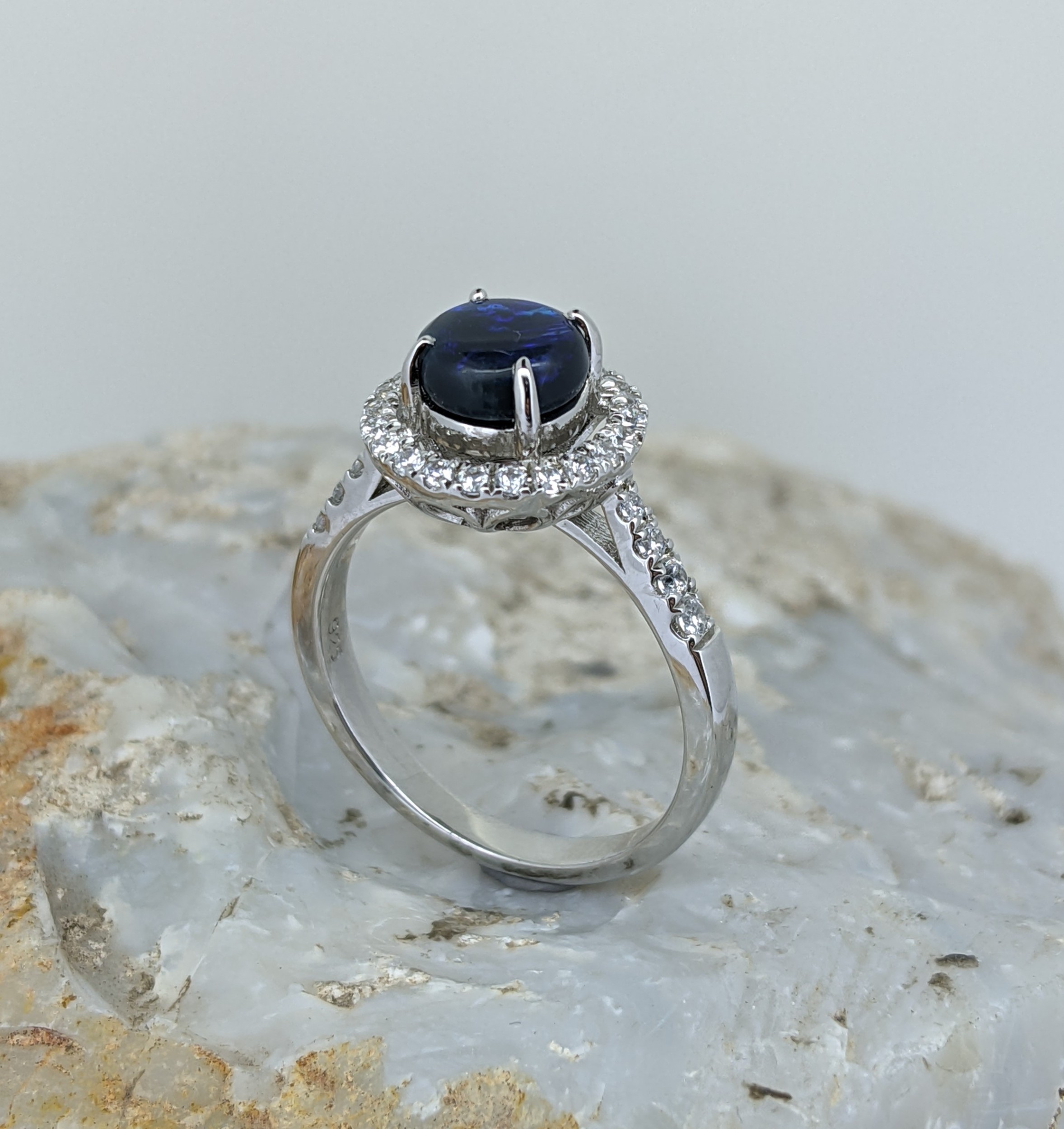 Solid natural black opal from Lightning Ridge, New South Wales. This solid black opal ring is set in Sterling Silver. The opal is accentuated by Cubic Zirconias and has a strong display of the colour blue.