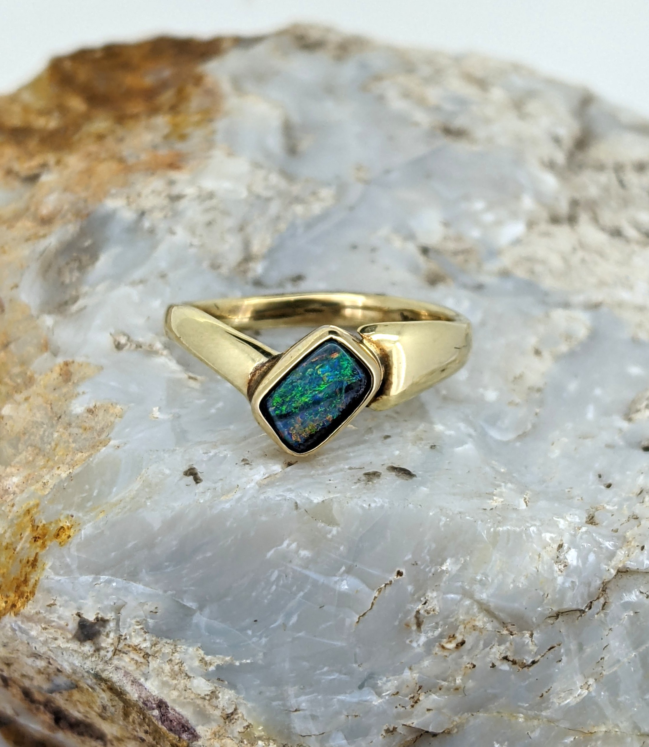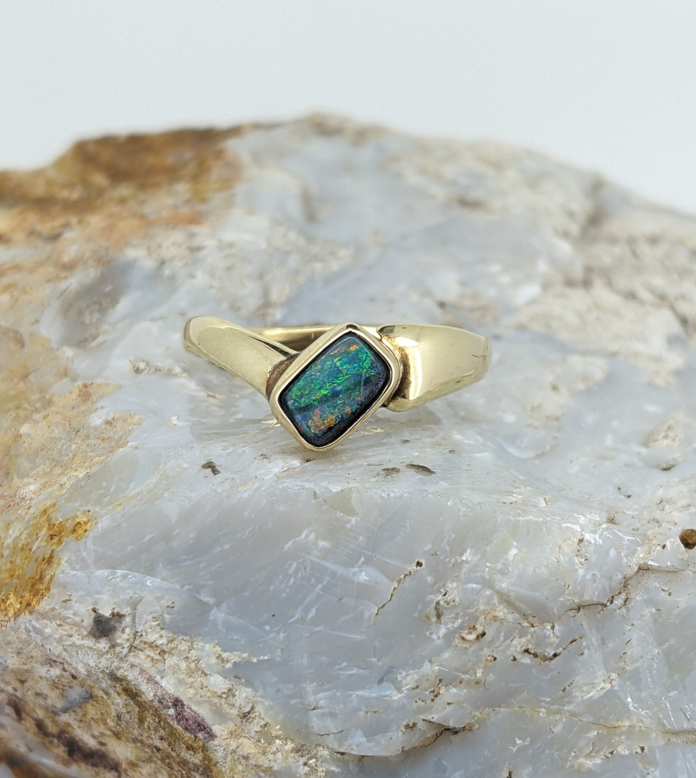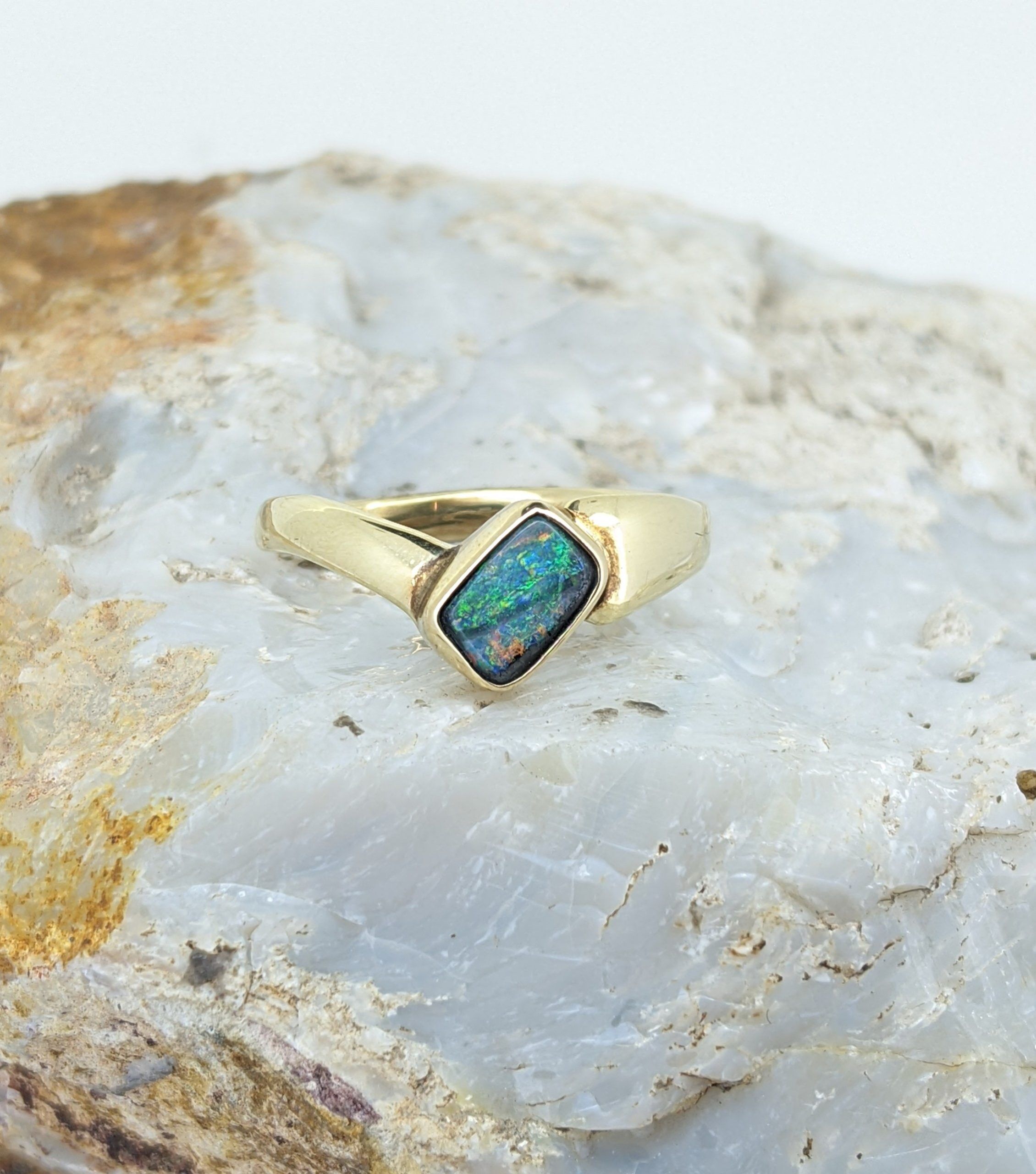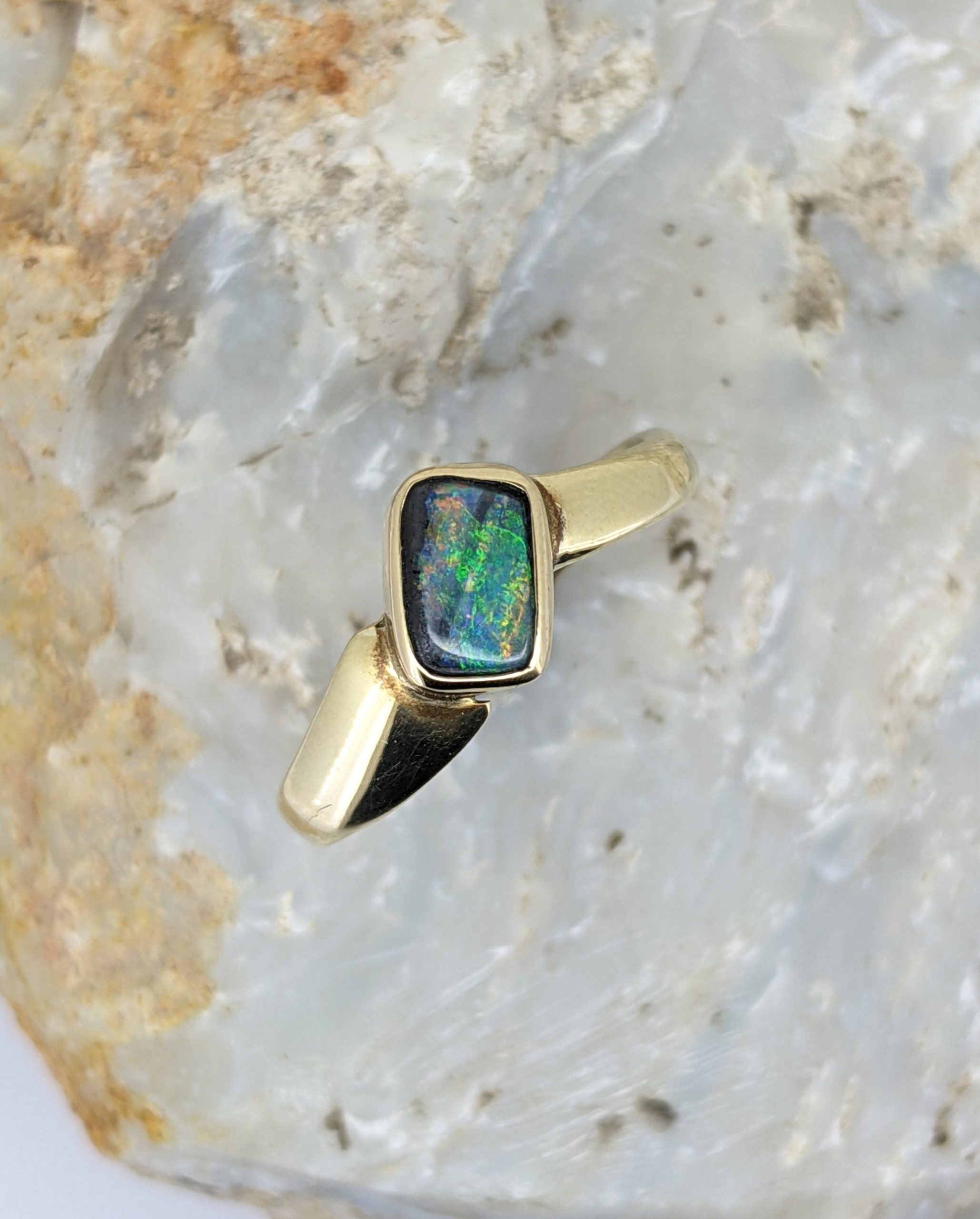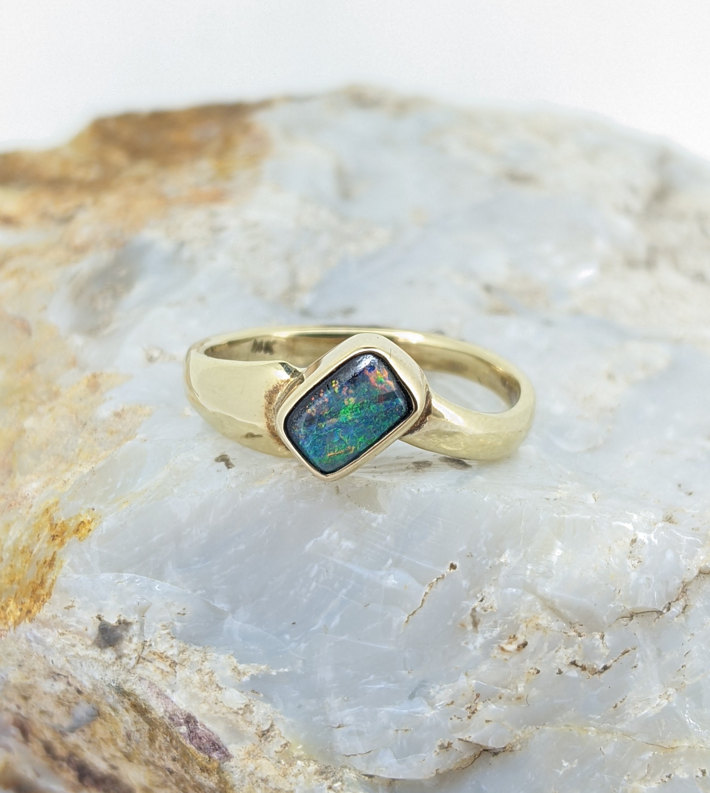 Solid natural boulder opal from Winton, Queensland. This solid boulder opal ring is crafted in 14K Yellow Gold. The opal has a strong display of the colours green, yellow, blue and red.