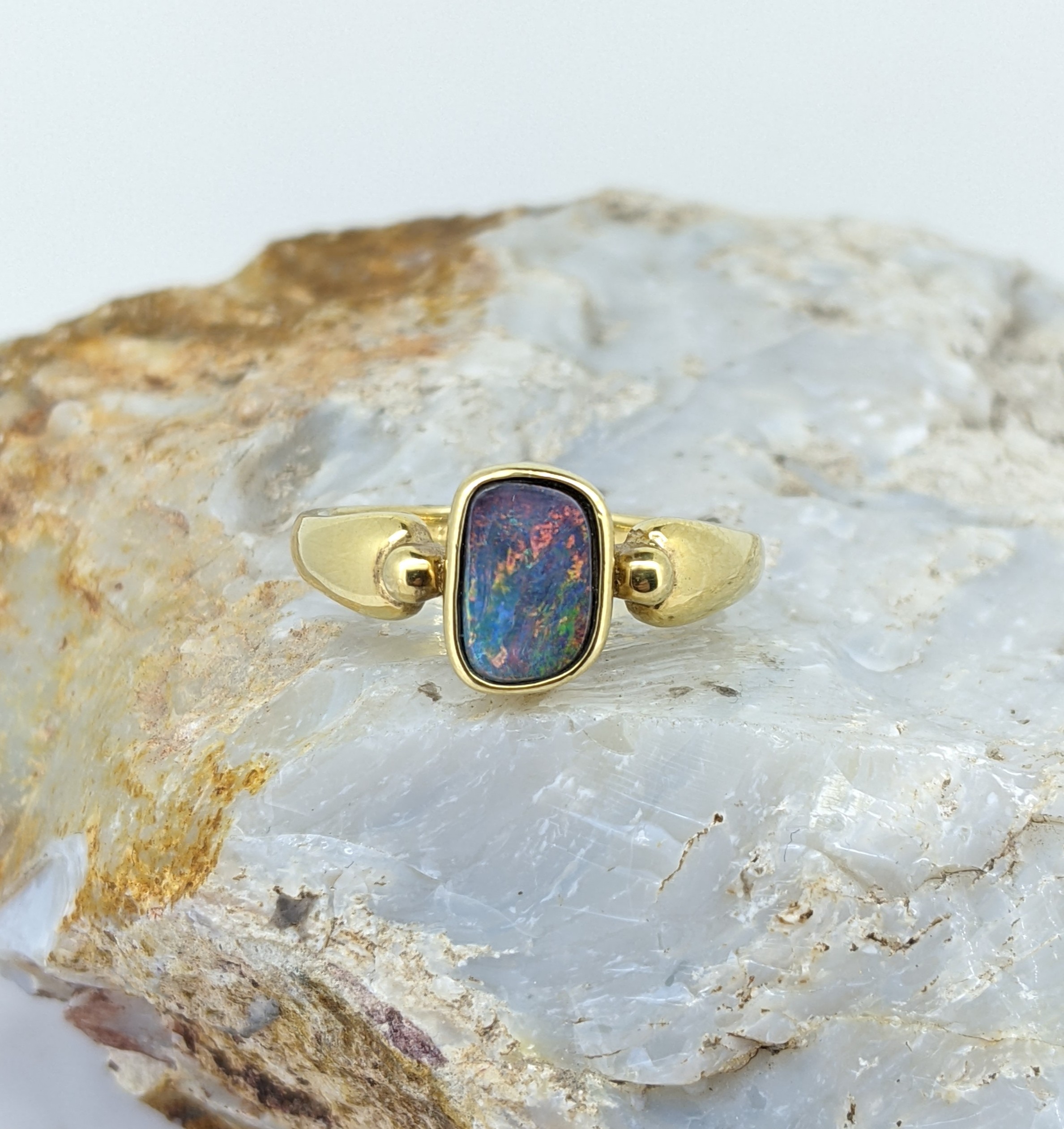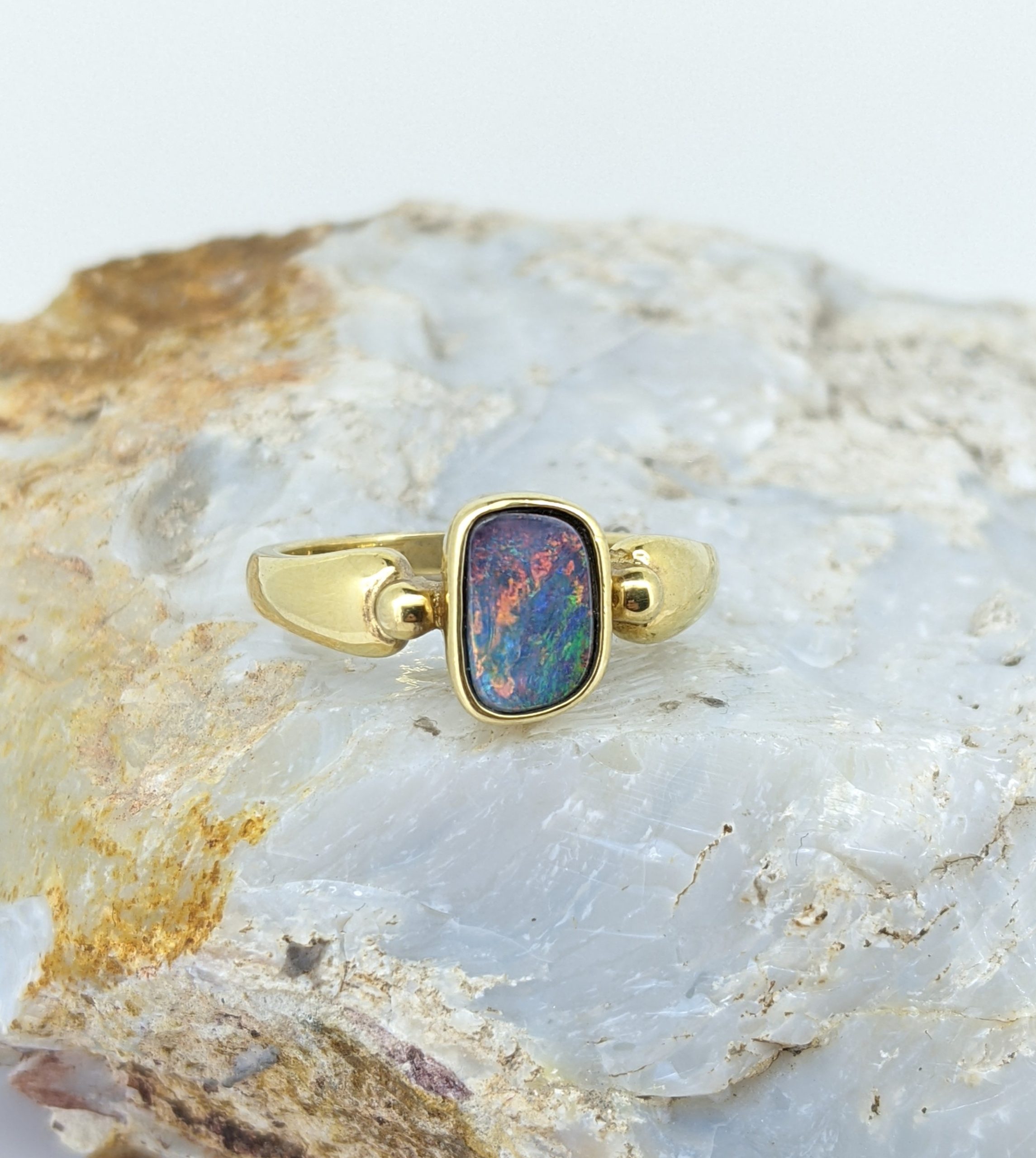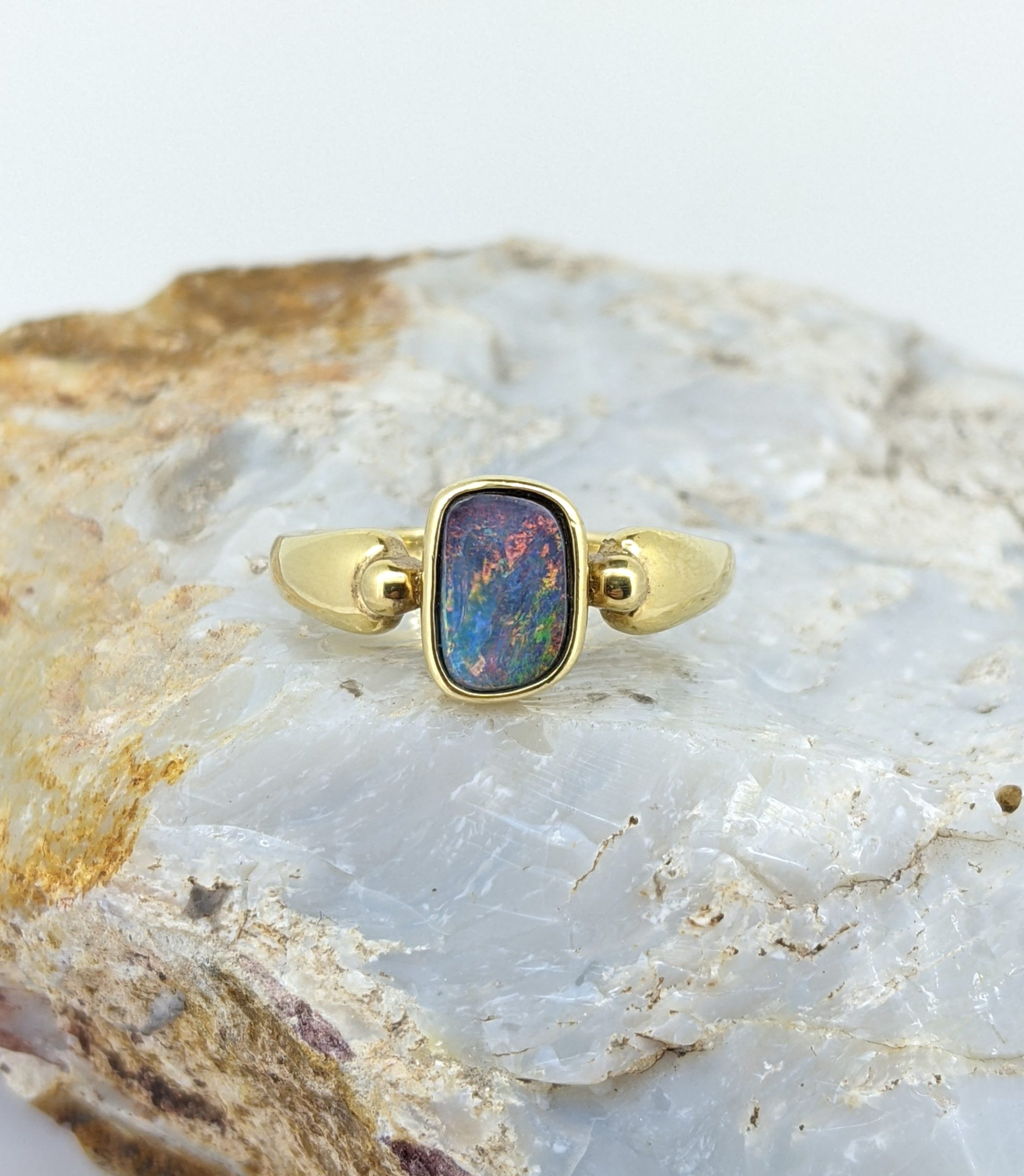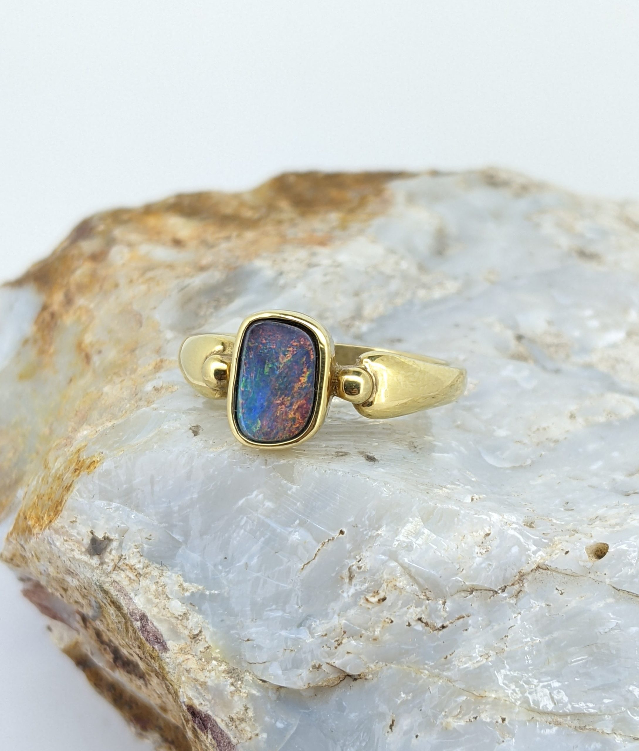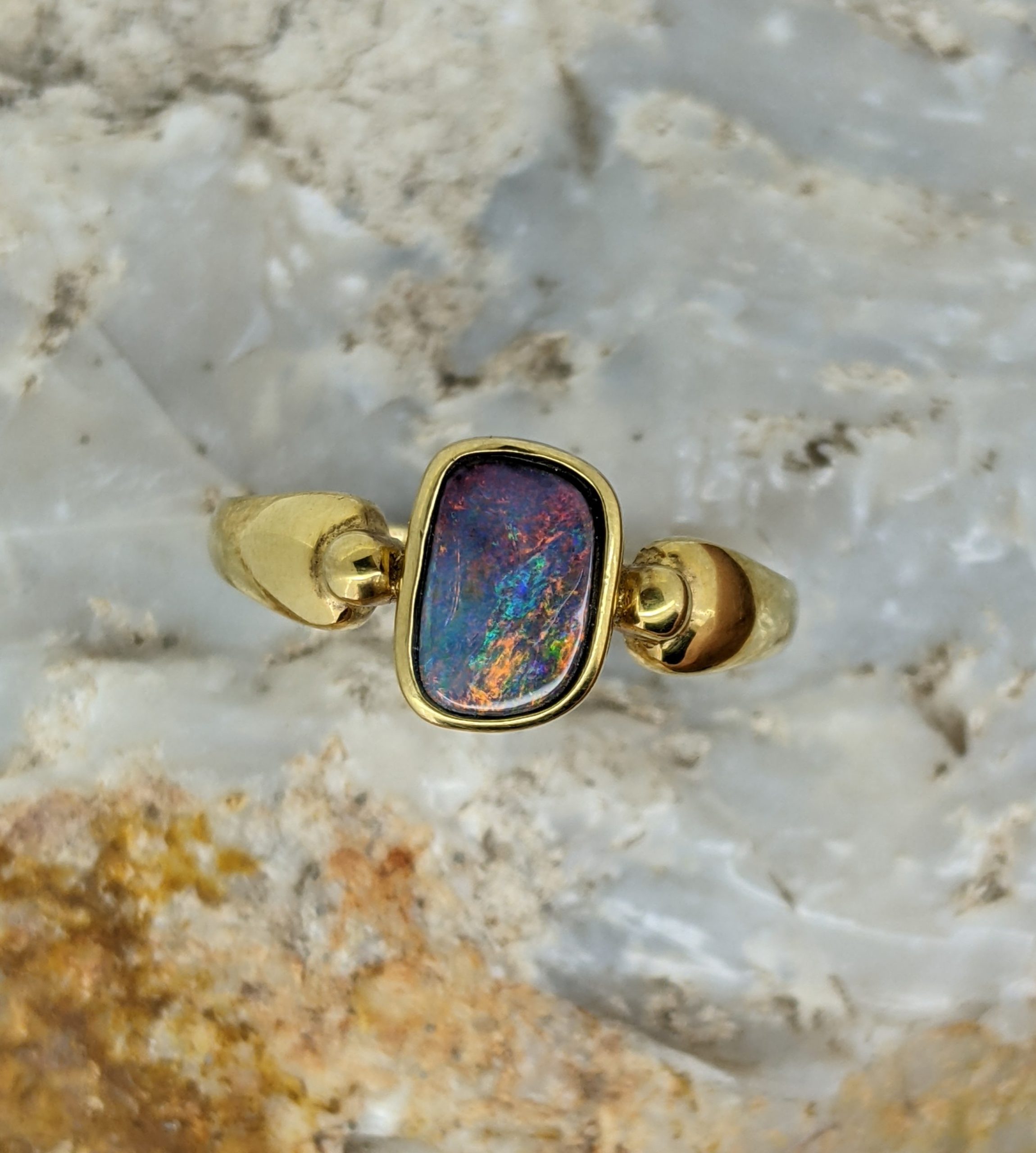 Solid natural boulder opal from Winton, Queensland. This solid boulder opal ring is set in 18K Yellow Gold. The opal has a strong display of the colours red, orange and blue.
