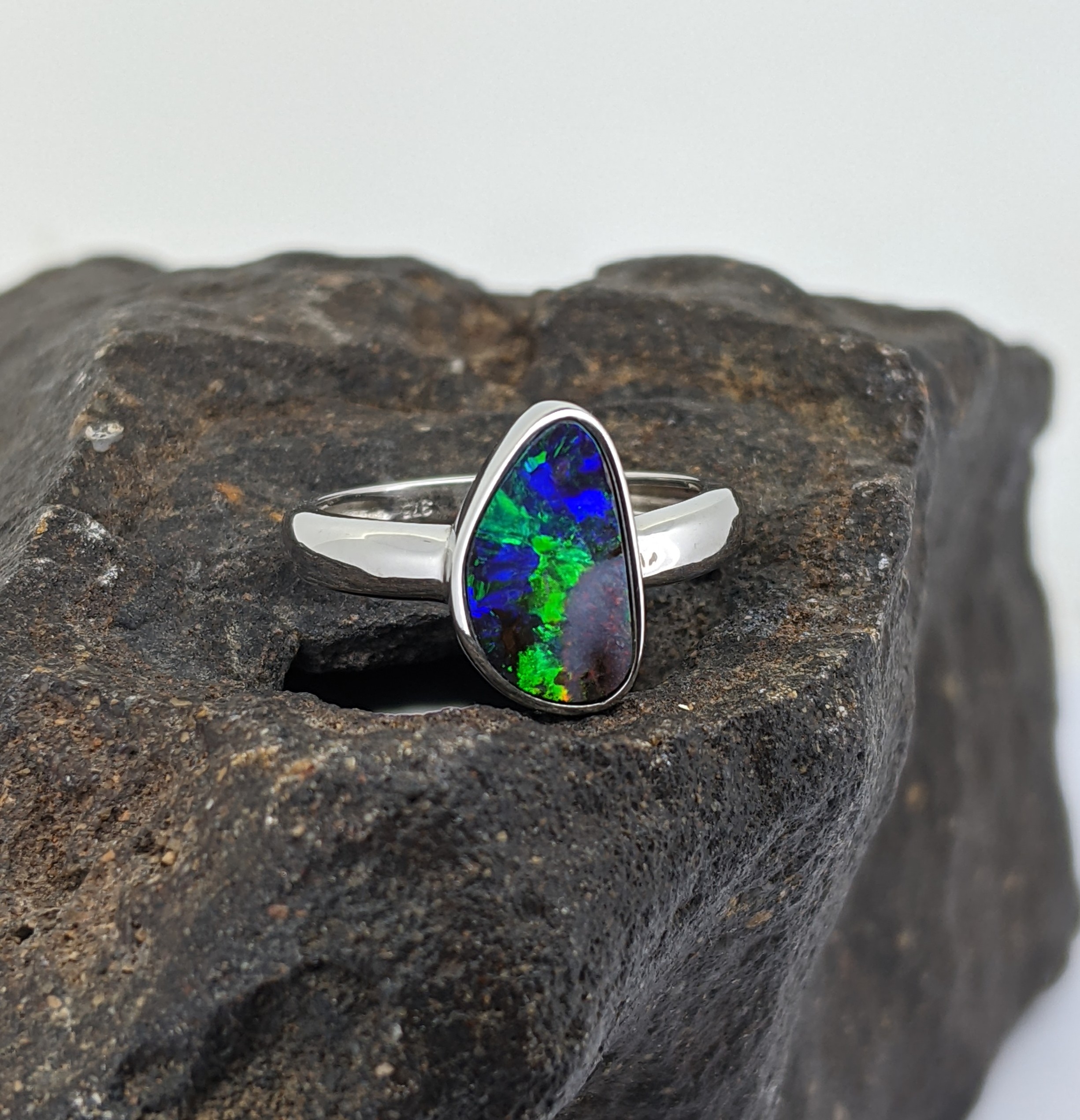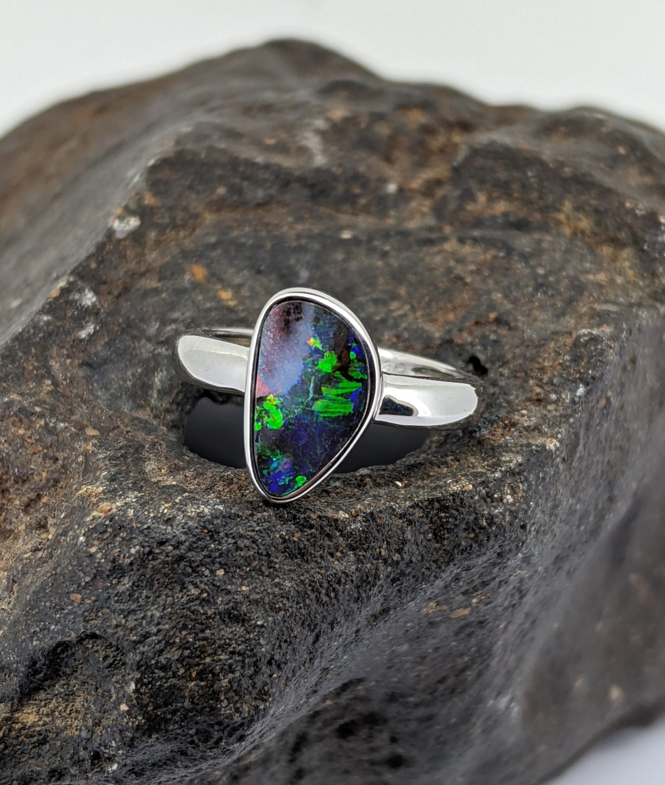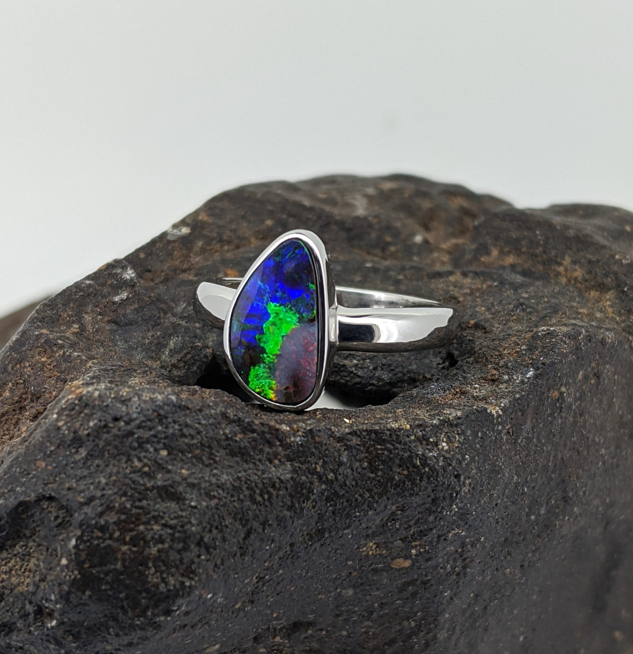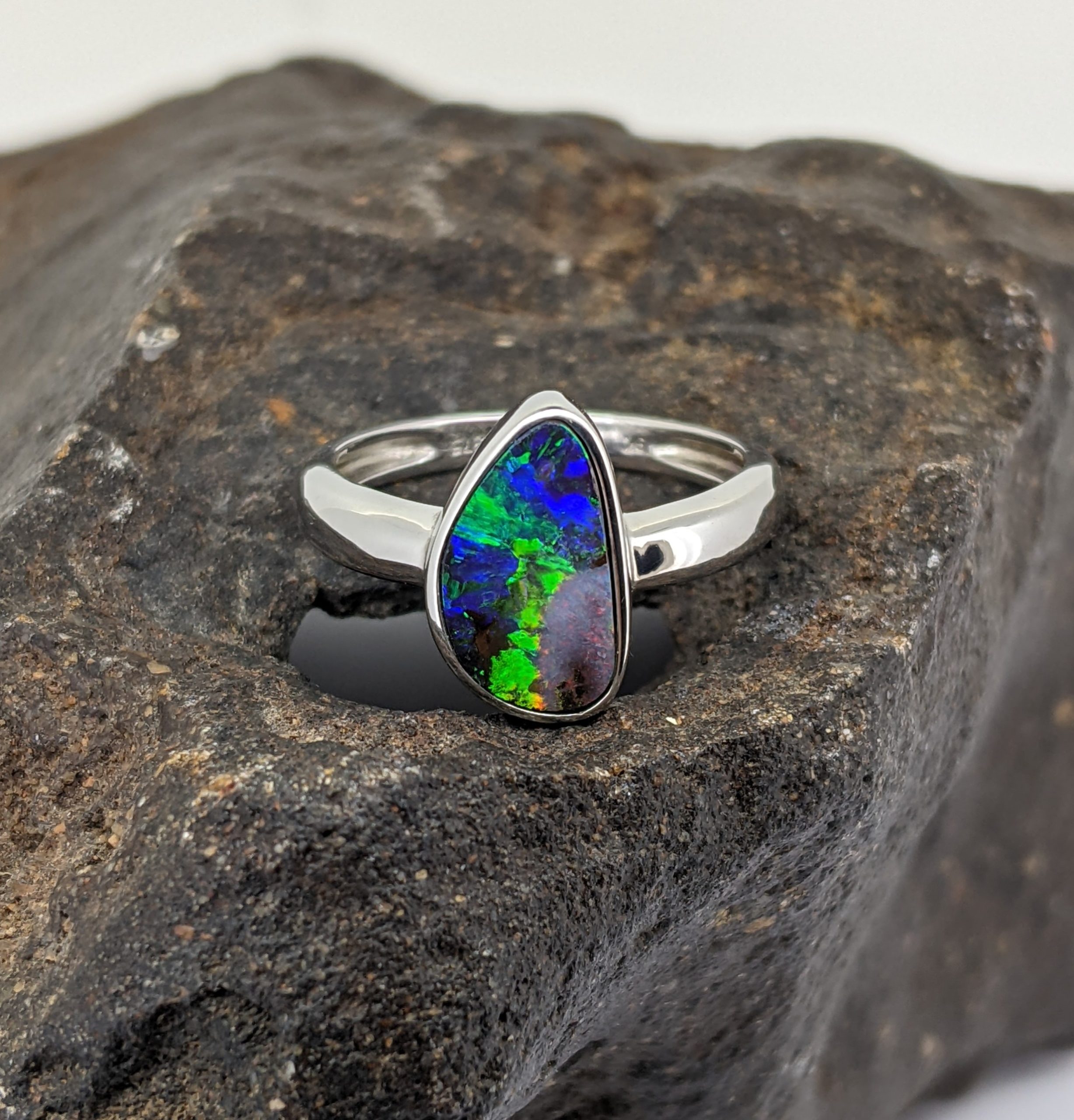 Solid natural boulder opal from Winton, Queensland. This solid boulder opal ring is set in 9K White Gold. The opal has an intense display of the colours green, blue and red.