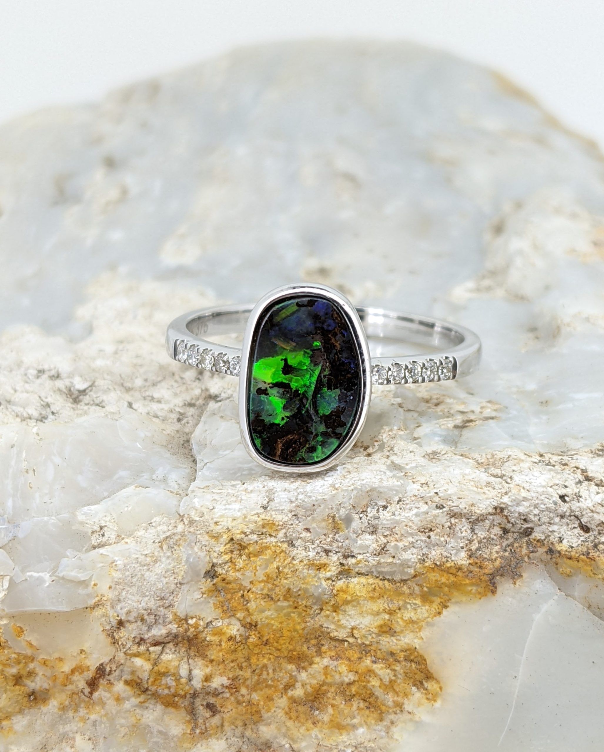 Solid natural boulder opal from Winton, Queensland. This solid boulder opal ring is set in 9K White Gold and is accentuated by ten diamonds. This opal has an intense, flashy display of the colours green, orange and yellow.