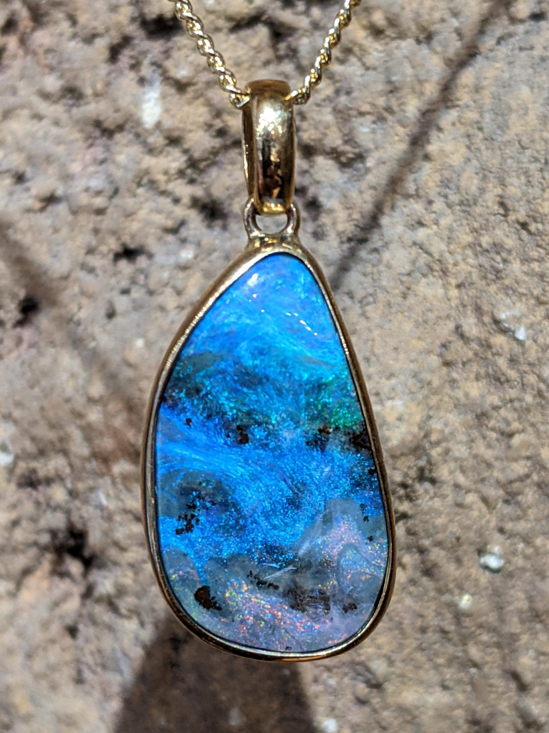 Solid natural boulder opal from Winton, Queensland. This solid boulder opal pendant is set in 9K Yellow Gold and has a strong display of the colours blue, green and red.