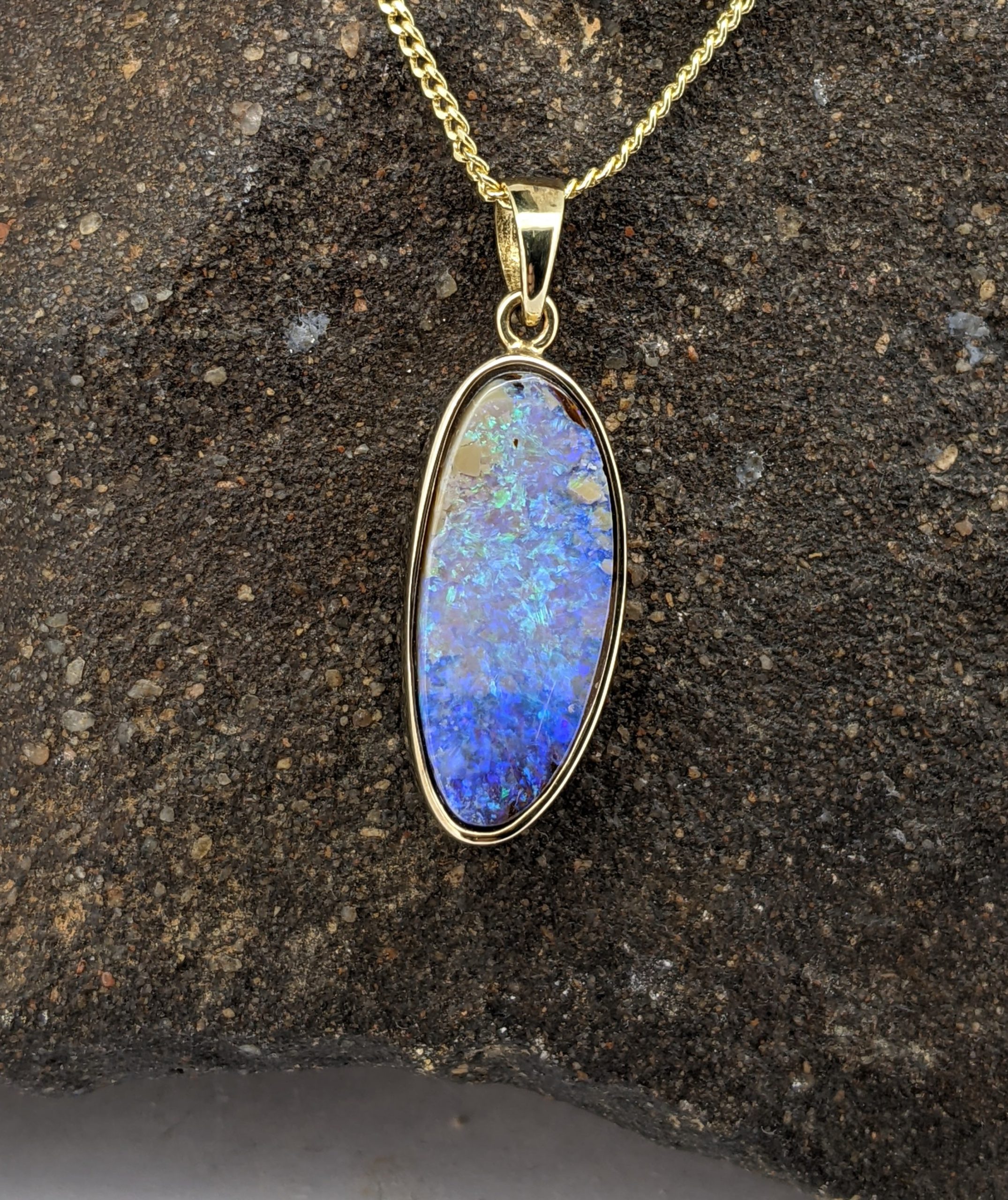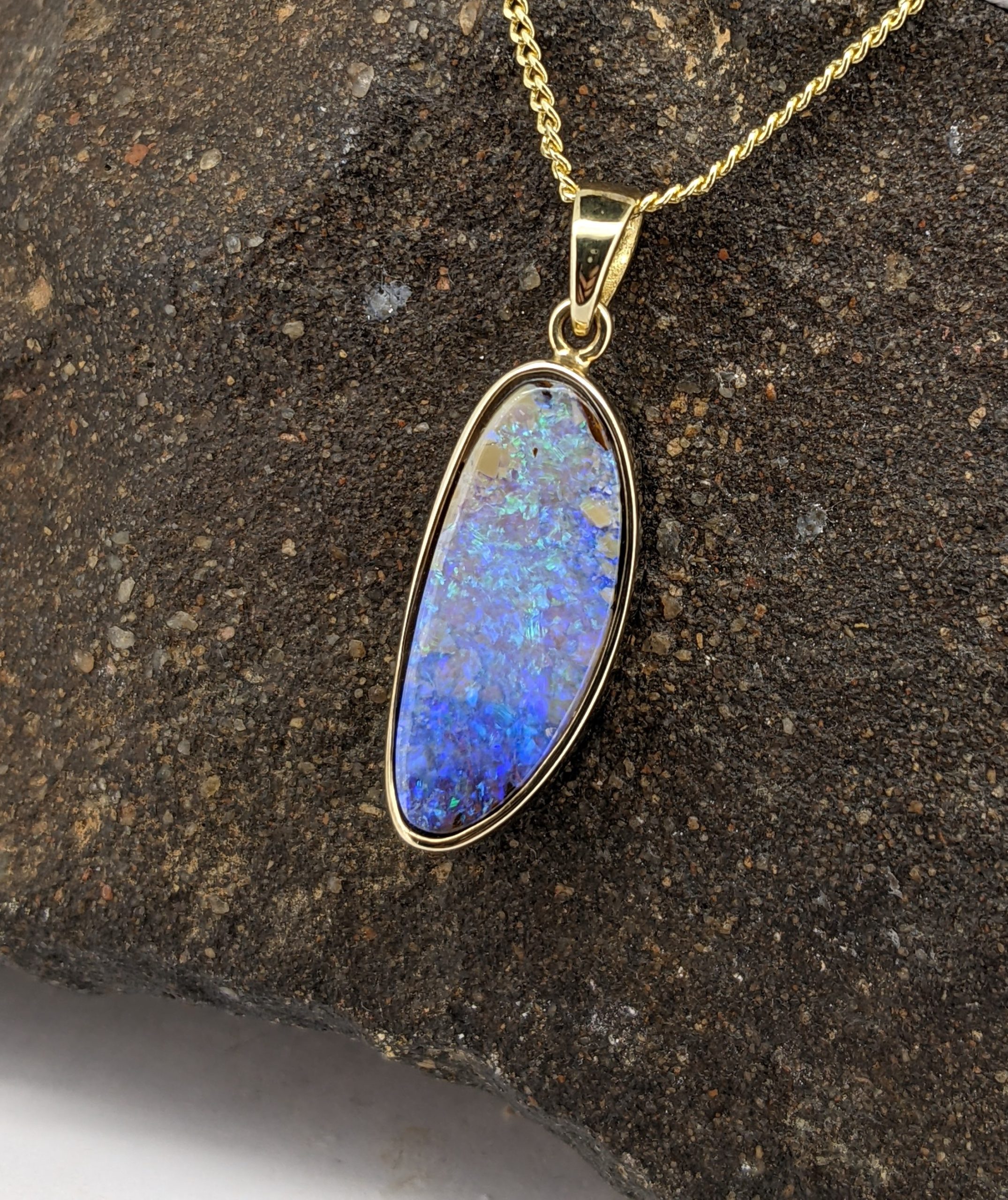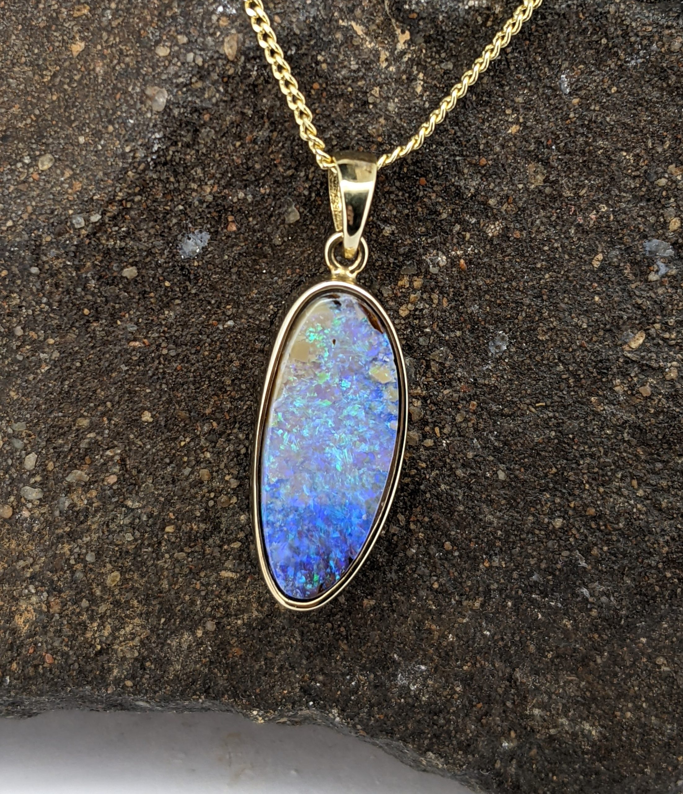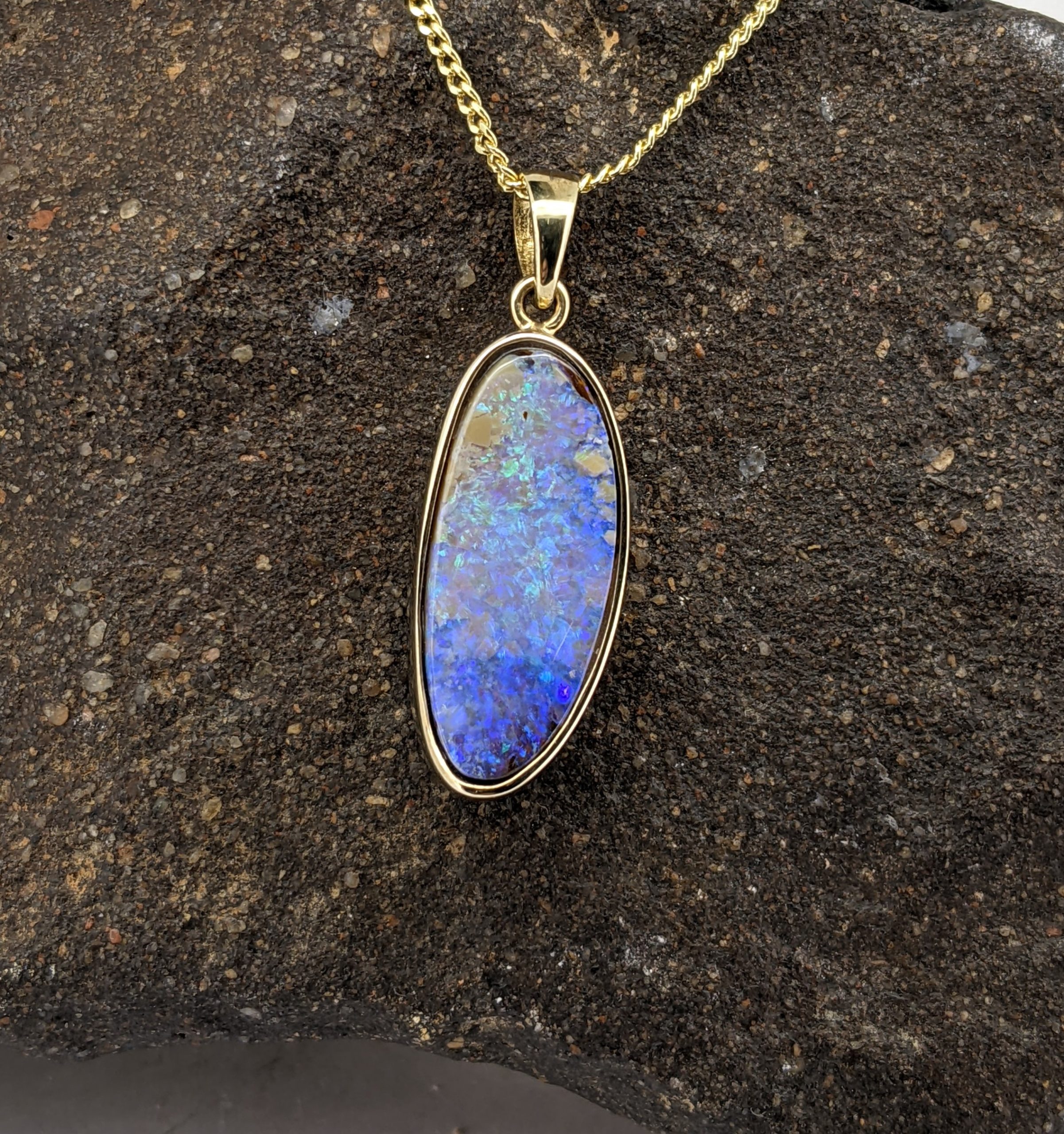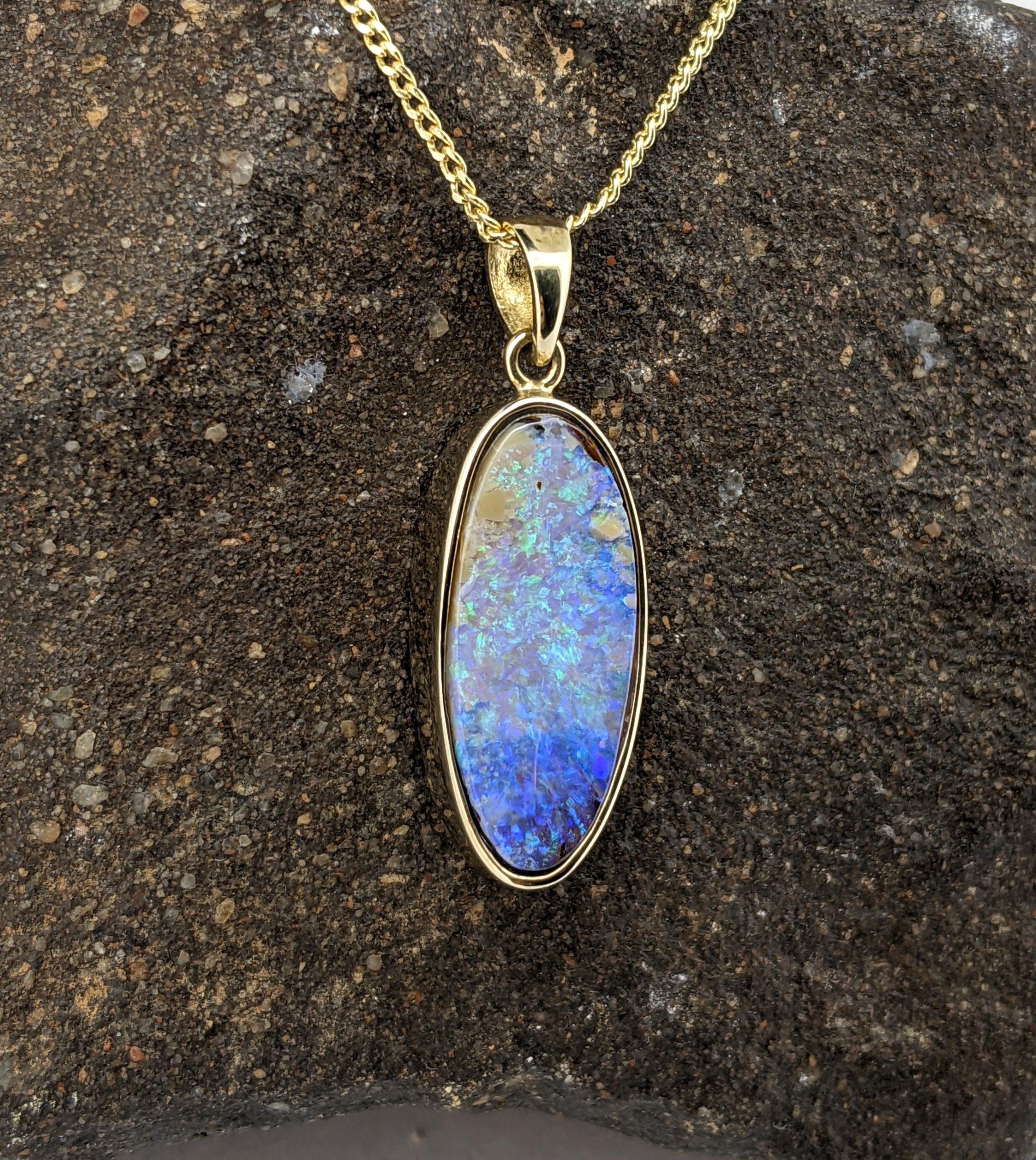 Solid natural boulder opal from Winton, Queensland. This solid boulder opal pendant is set in 9K Yellow Gold and has a flashy display of the colours green and blue.