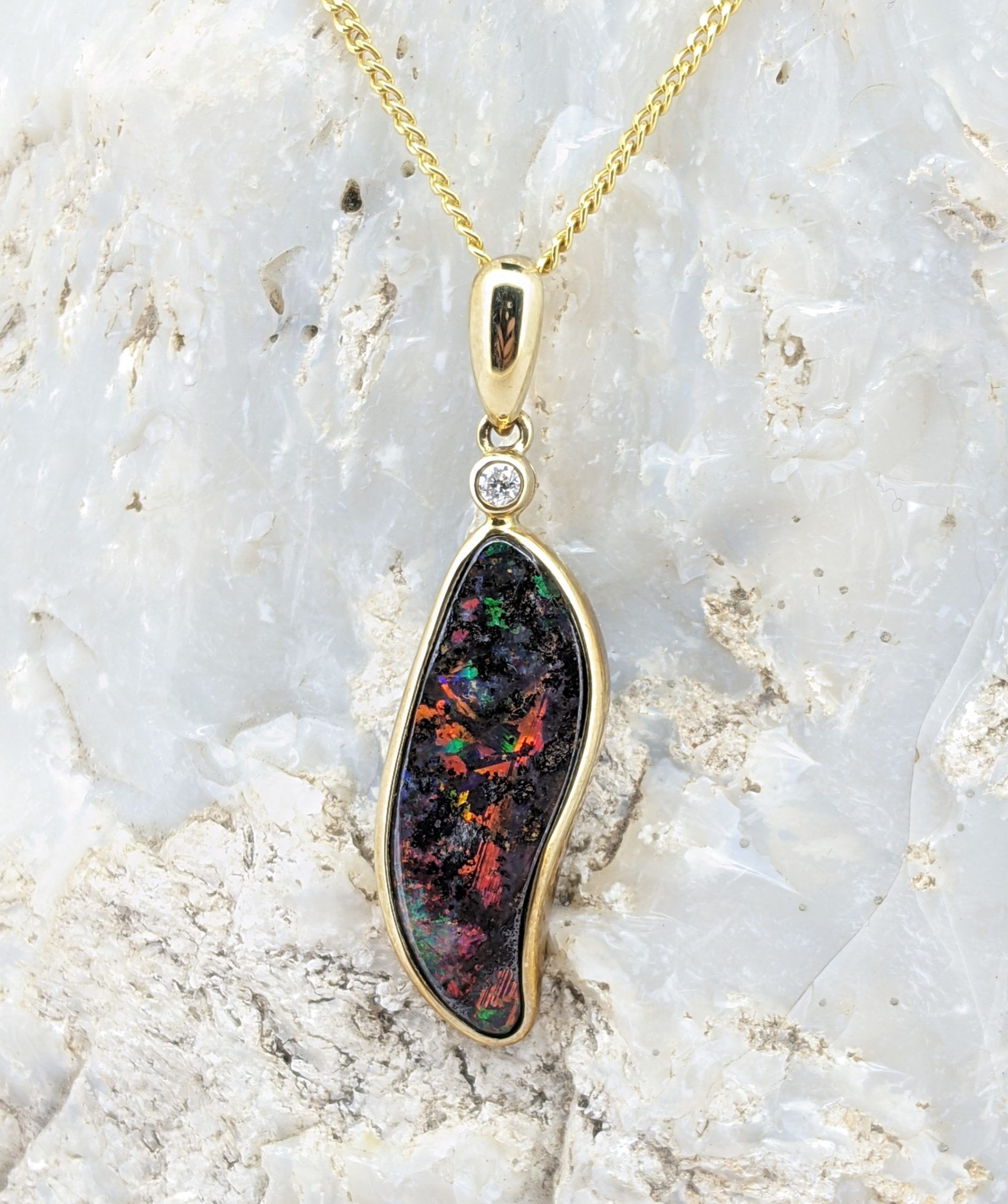 Solid natural boulder opal from Winton, Queensland. This solid boulder opal pendant is set in 9K Yellow Gold and is accentuated by a diamond beneath the bail. The opal has an intense and flashy display of the colours red, orange and green.