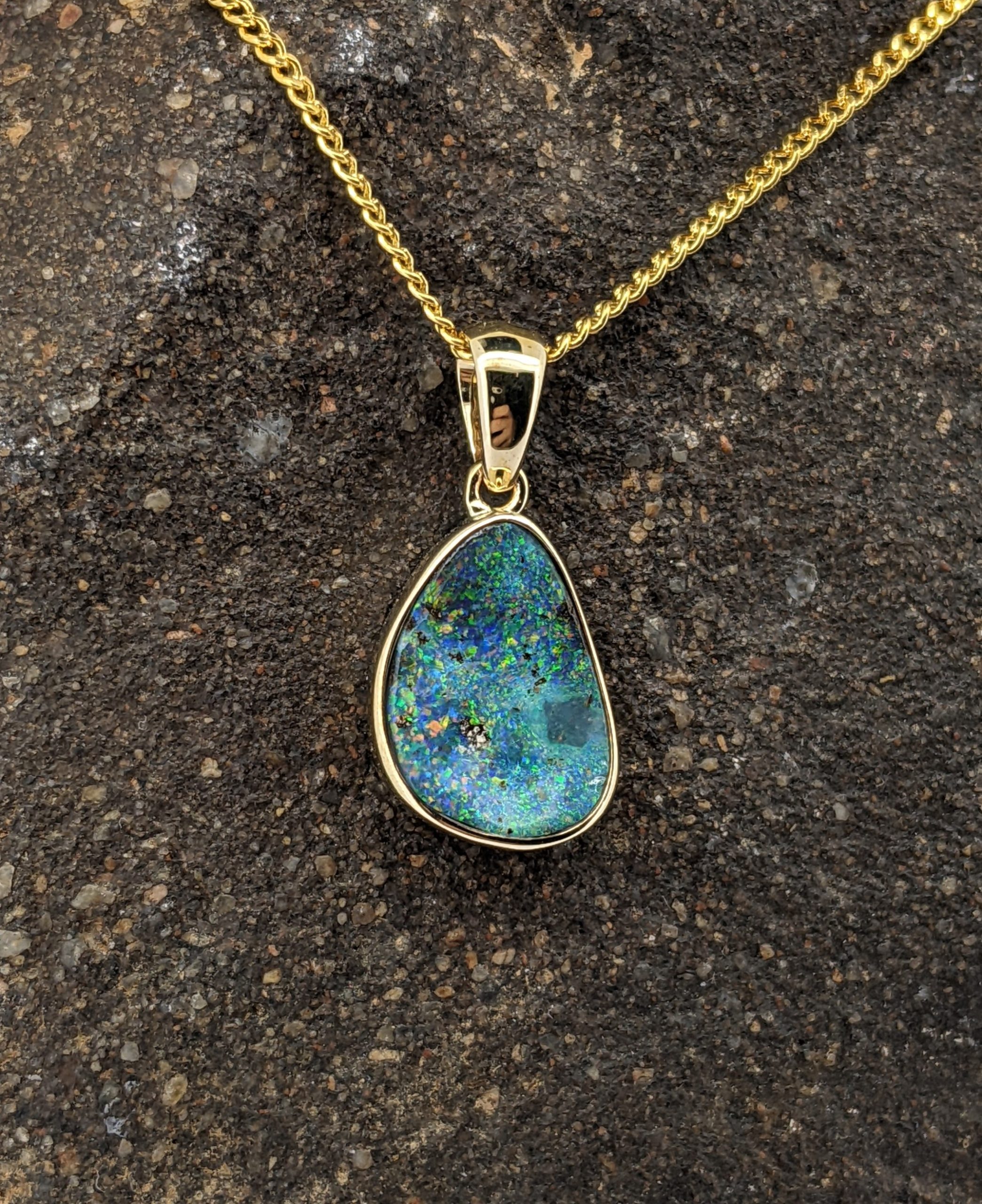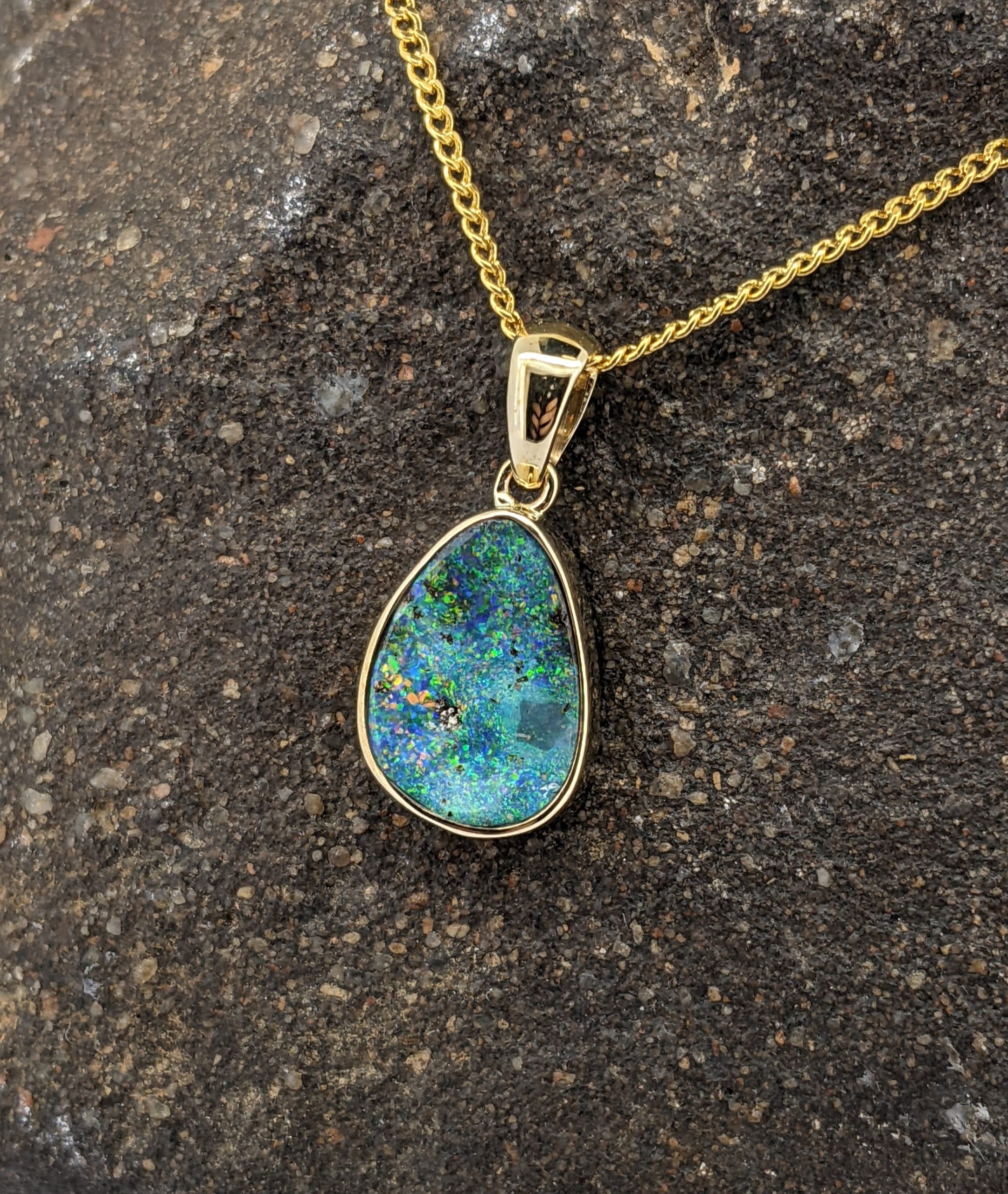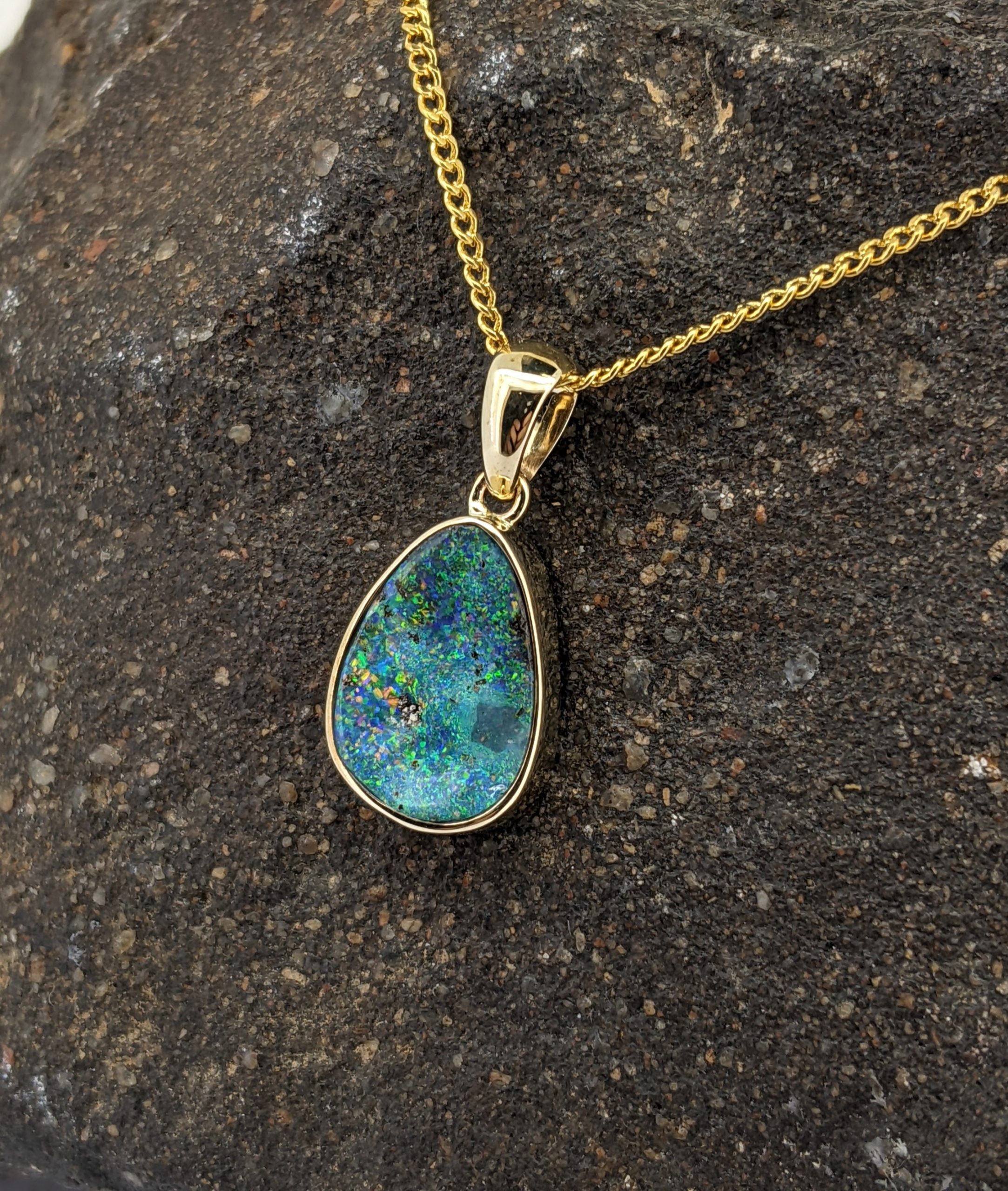Solid natural boulder opal from Winton, Queensland. This solid boulder opal pendant is set in 9K Yellow Gold. The opal has a sparkly display of the colours green, blue, yellow and orange.