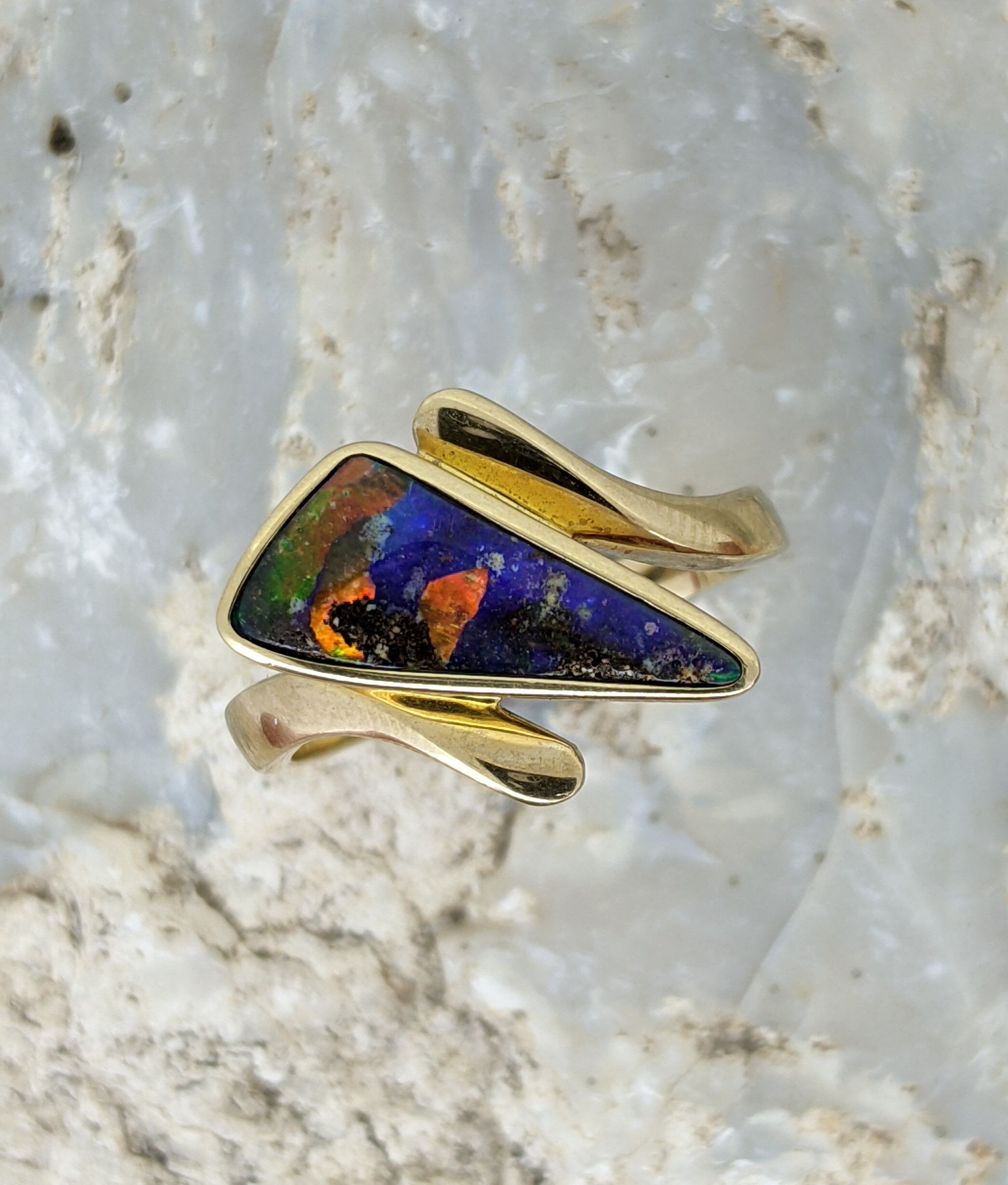 Solid natural boulder opal from Winton, Queensland. This solid boulder opal ring is set in 9K Yellow Gold and has an intense, vibrant display of the colours red, orange, yellow, green and blue.