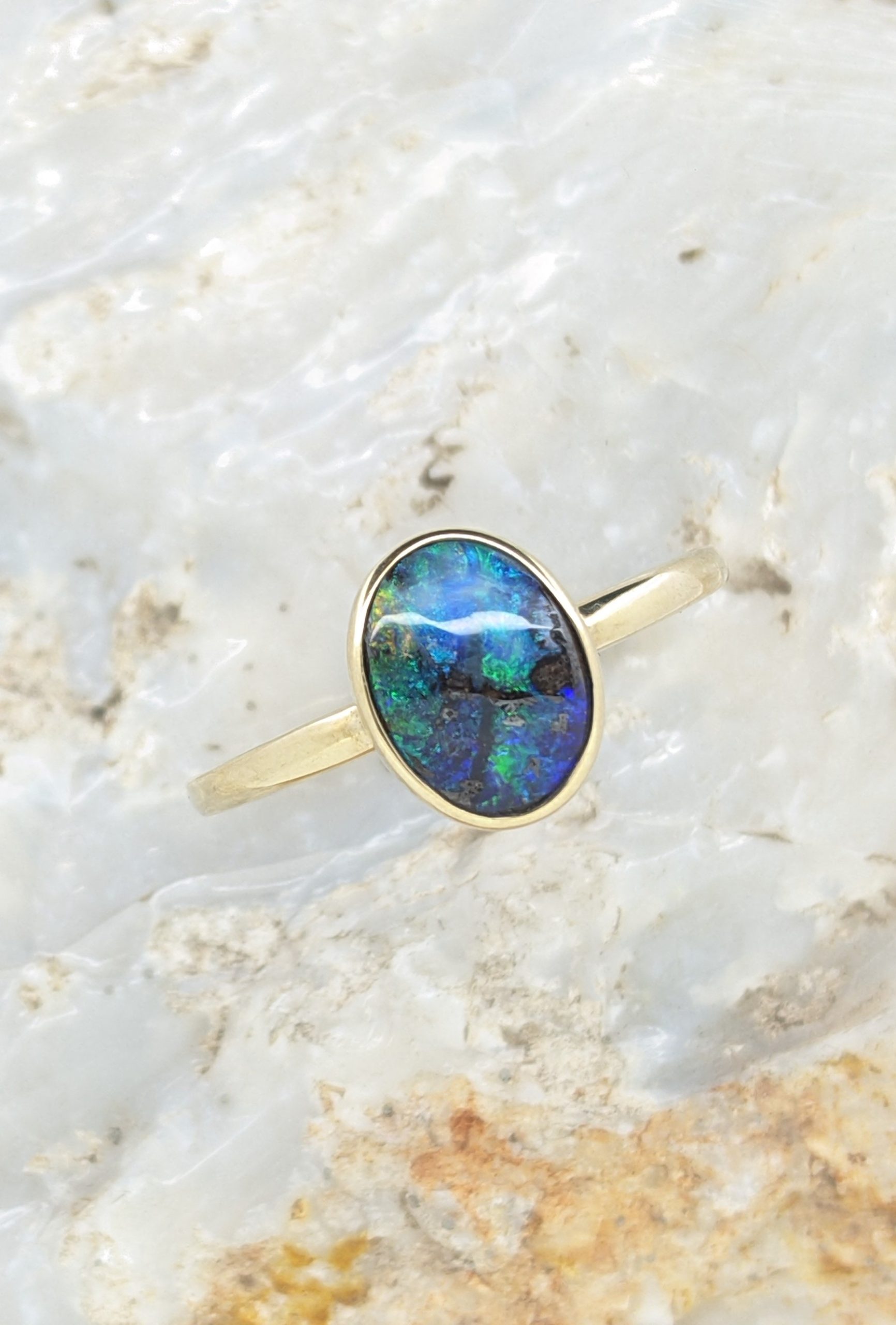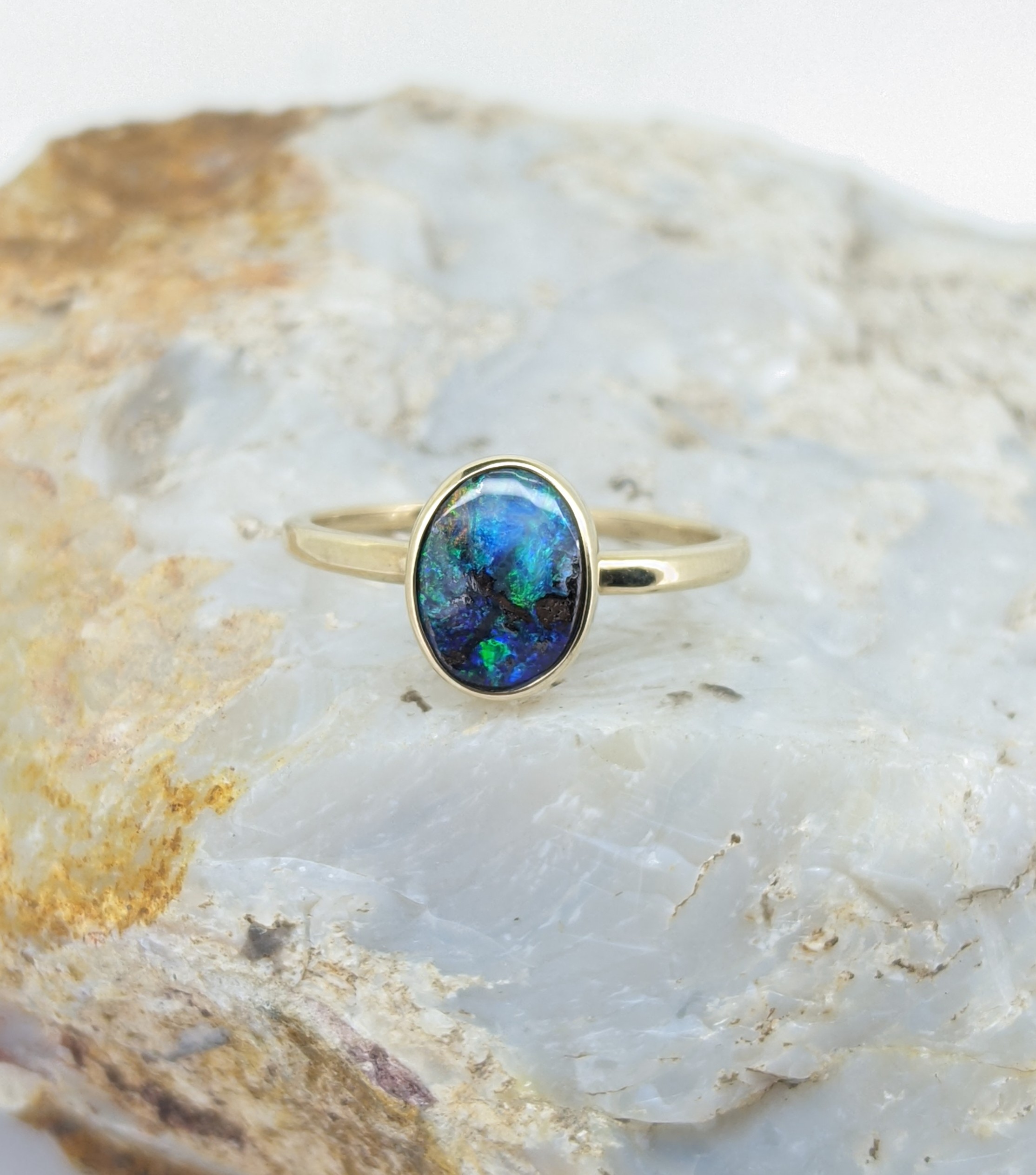 Solid natural boulder opal from Winton, Queensland. This solid boulder opal ring is set in 9K Yellow Gold. The opal has a constant display of the colours blue, green and orange.