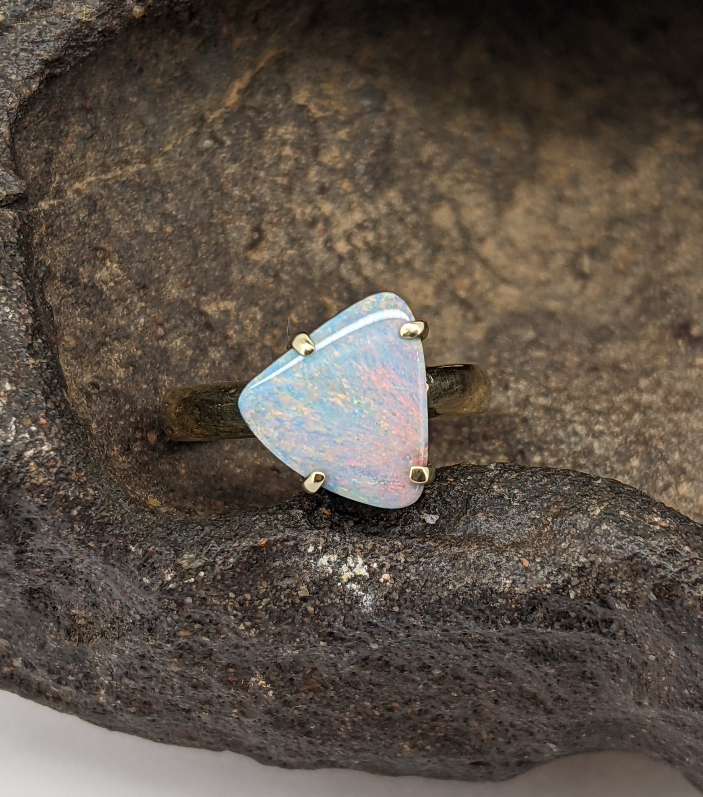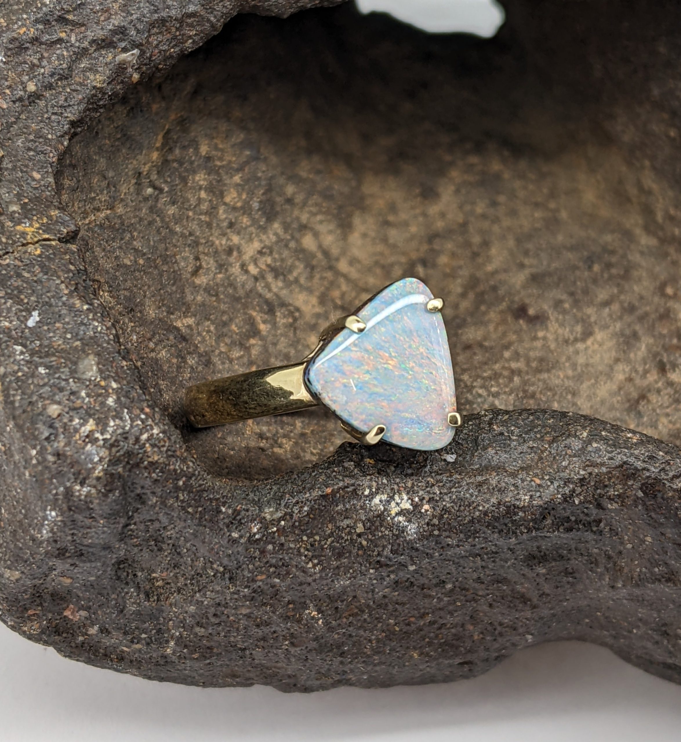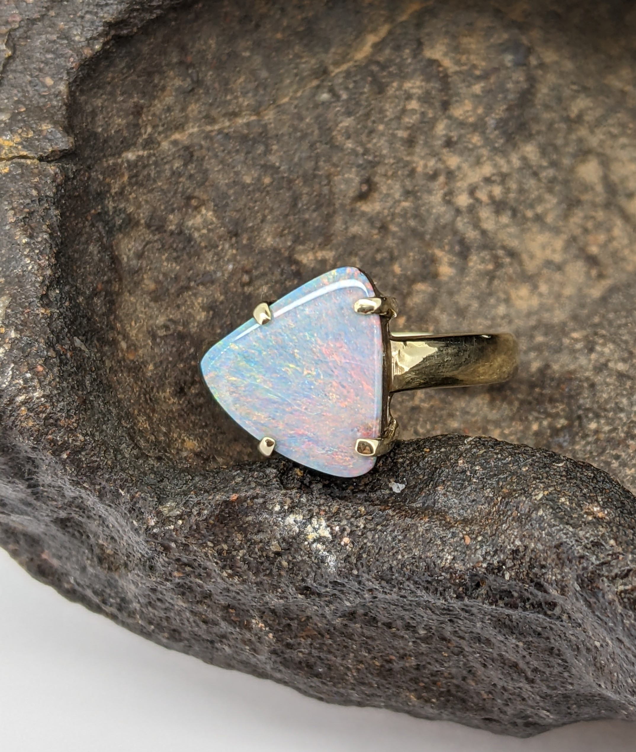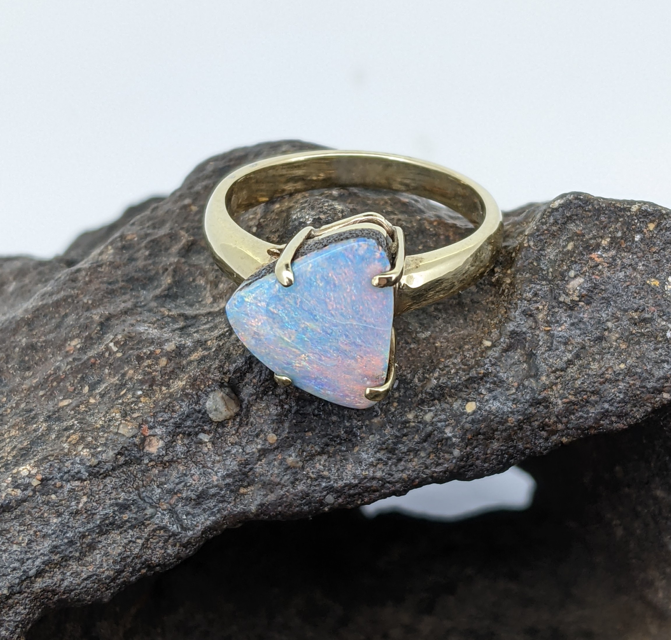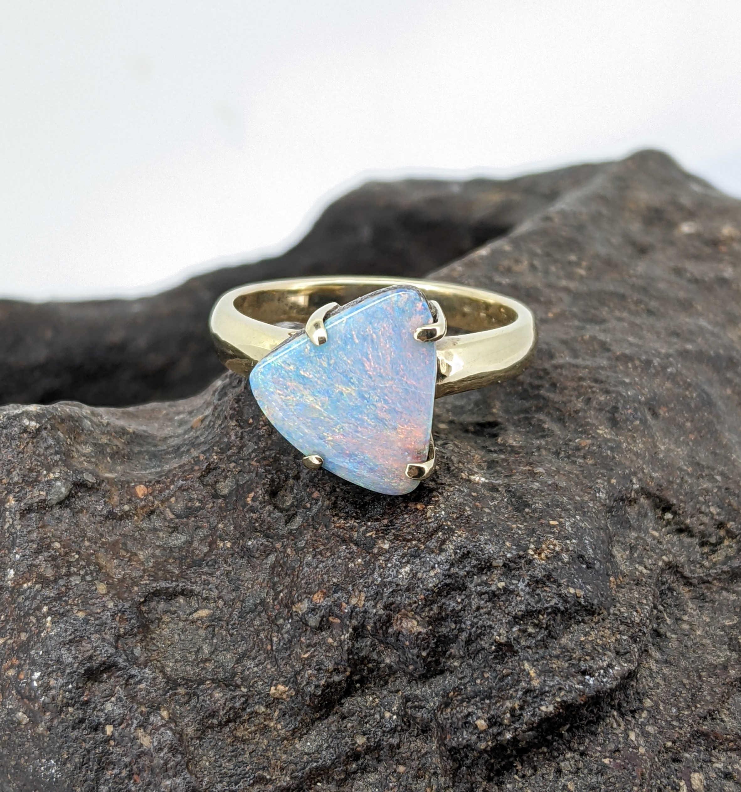 Solid natural boulder opal from Winton, Queensland. This solid boulder opal ring is crafted in 9K Yellow Gold. The opal has an intense and constant display of the colours red, orange and blue.