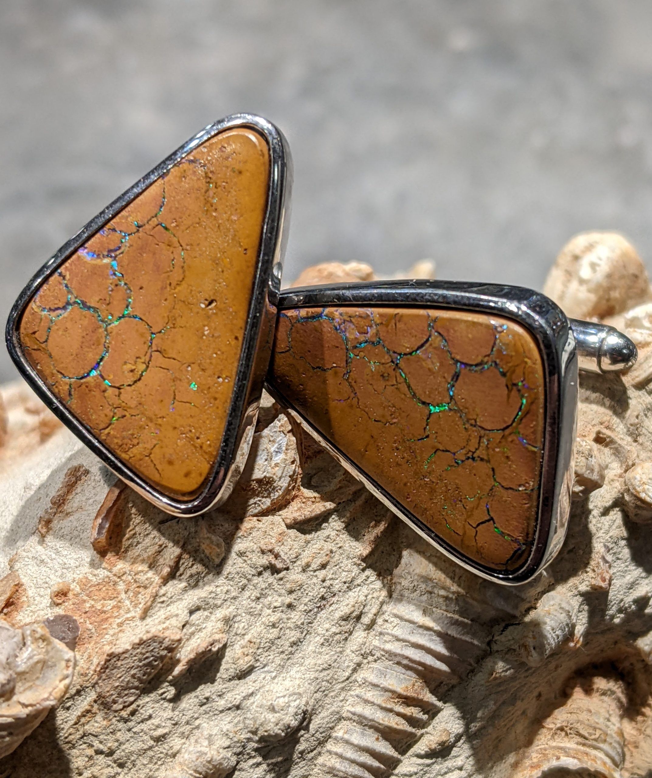Solid natural boulder opal from Winton, Queensland. These solid boulder opal cufflinks are set in Sterling Silver and have a sparkly display of the colours green and blue.