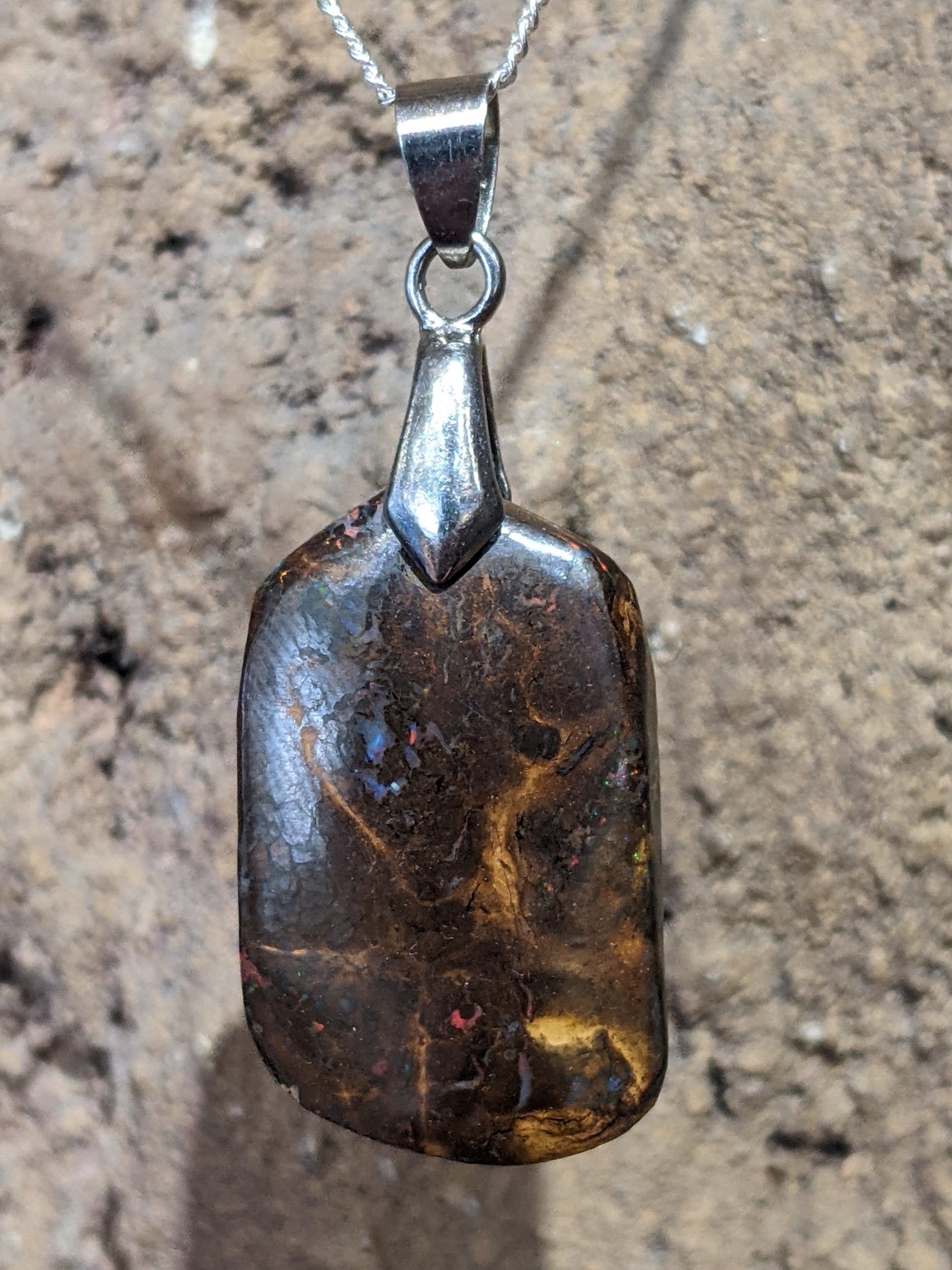 Solid natural boulder opal from Winton, Queensland. This solid boulder opal pendant is set in Sterling Silver and has a sparkly pinfire display of the colours red and green. The main brown coloration and pattern is the classic appearance of boulder opal. It is from the host rock itself, an ironstone/sandstone material, which is what makes boulder opals absolutely unique!