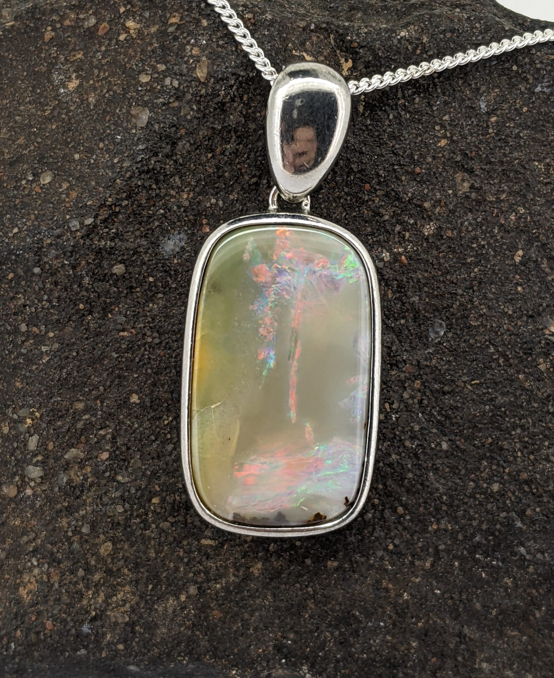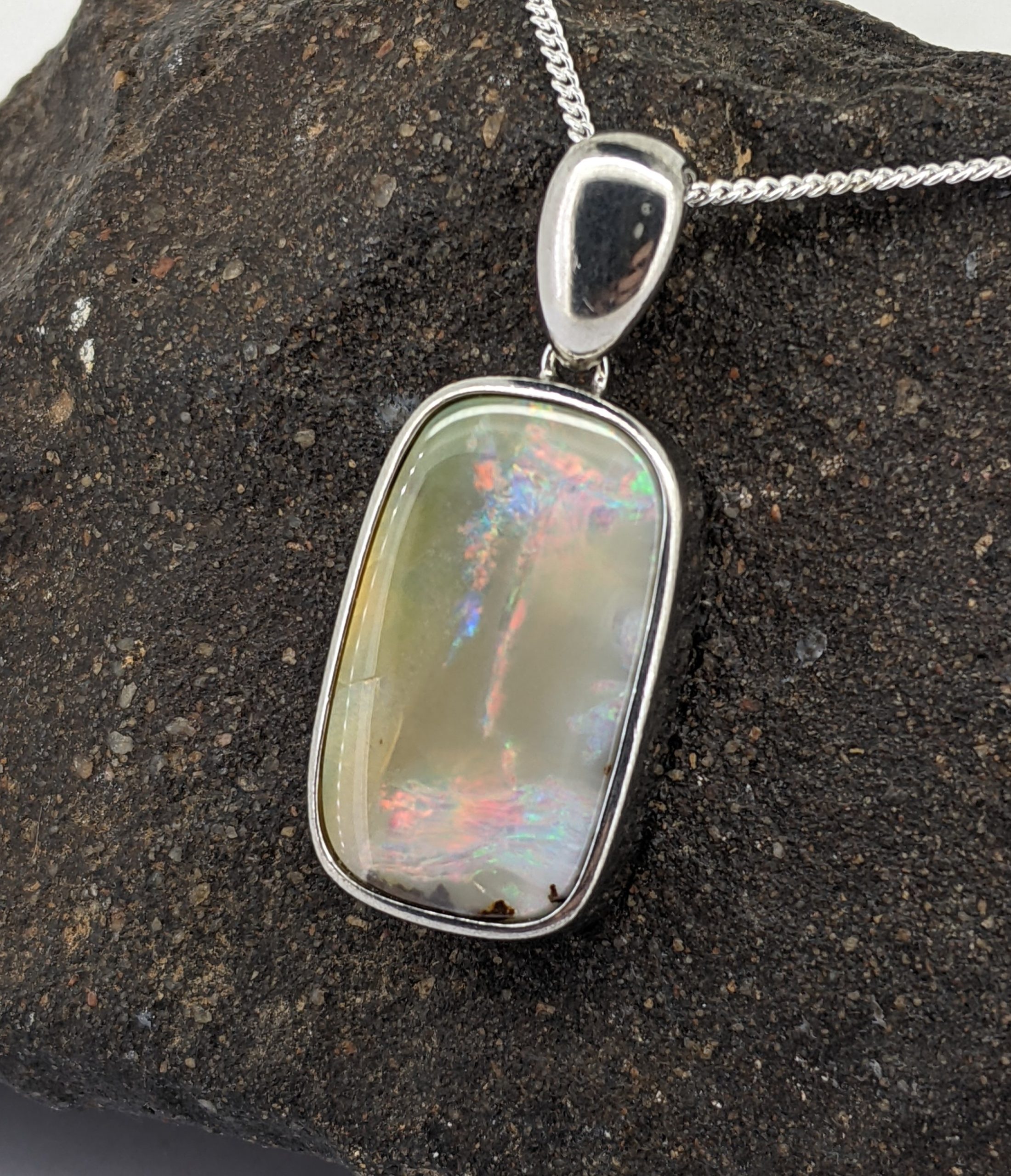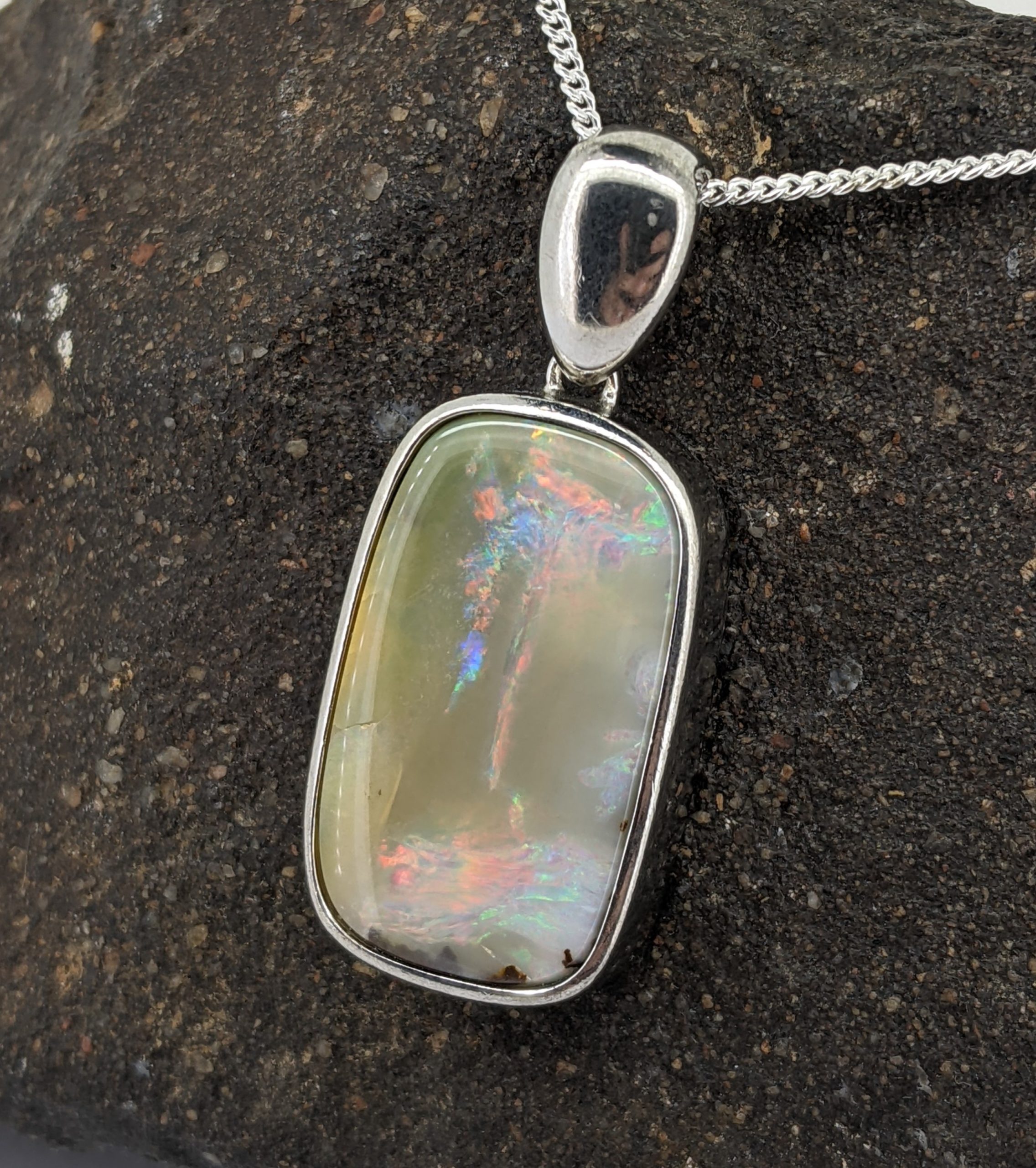 Solid natural boulder opal from Winton, Queensland. This solid boulder opal pendant is set in Sterling Silver. The opal has an intense display of the colours red, blue and green.