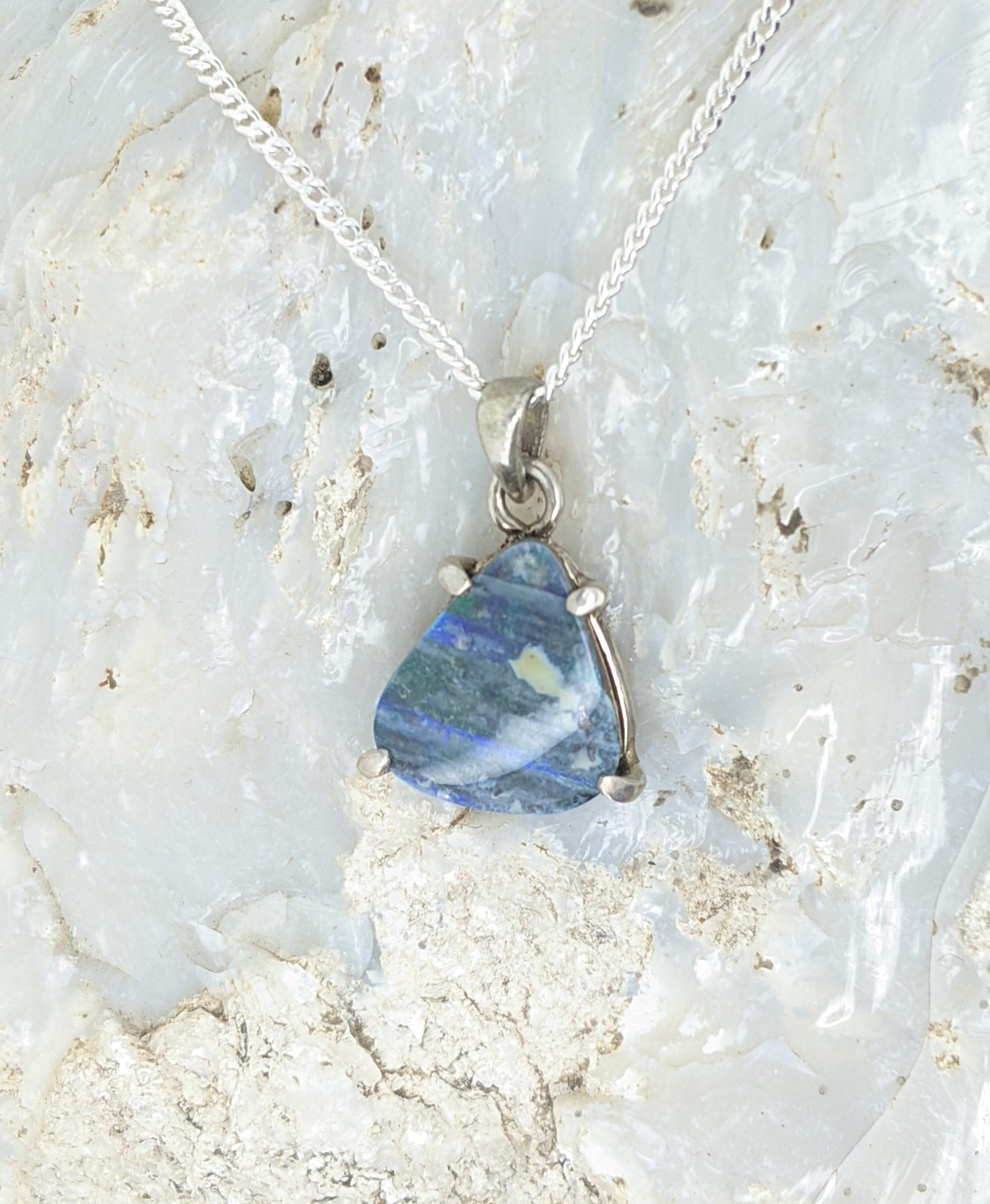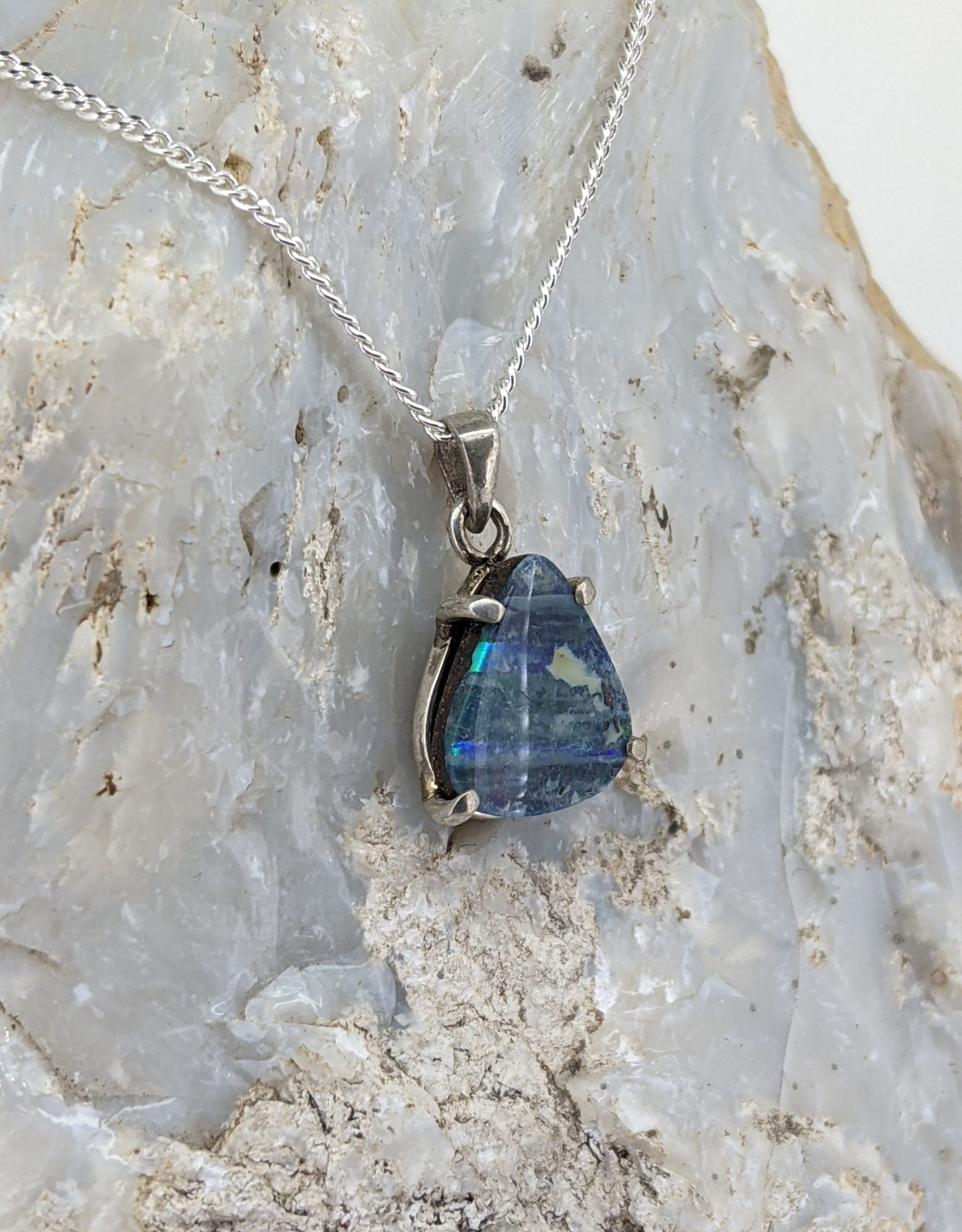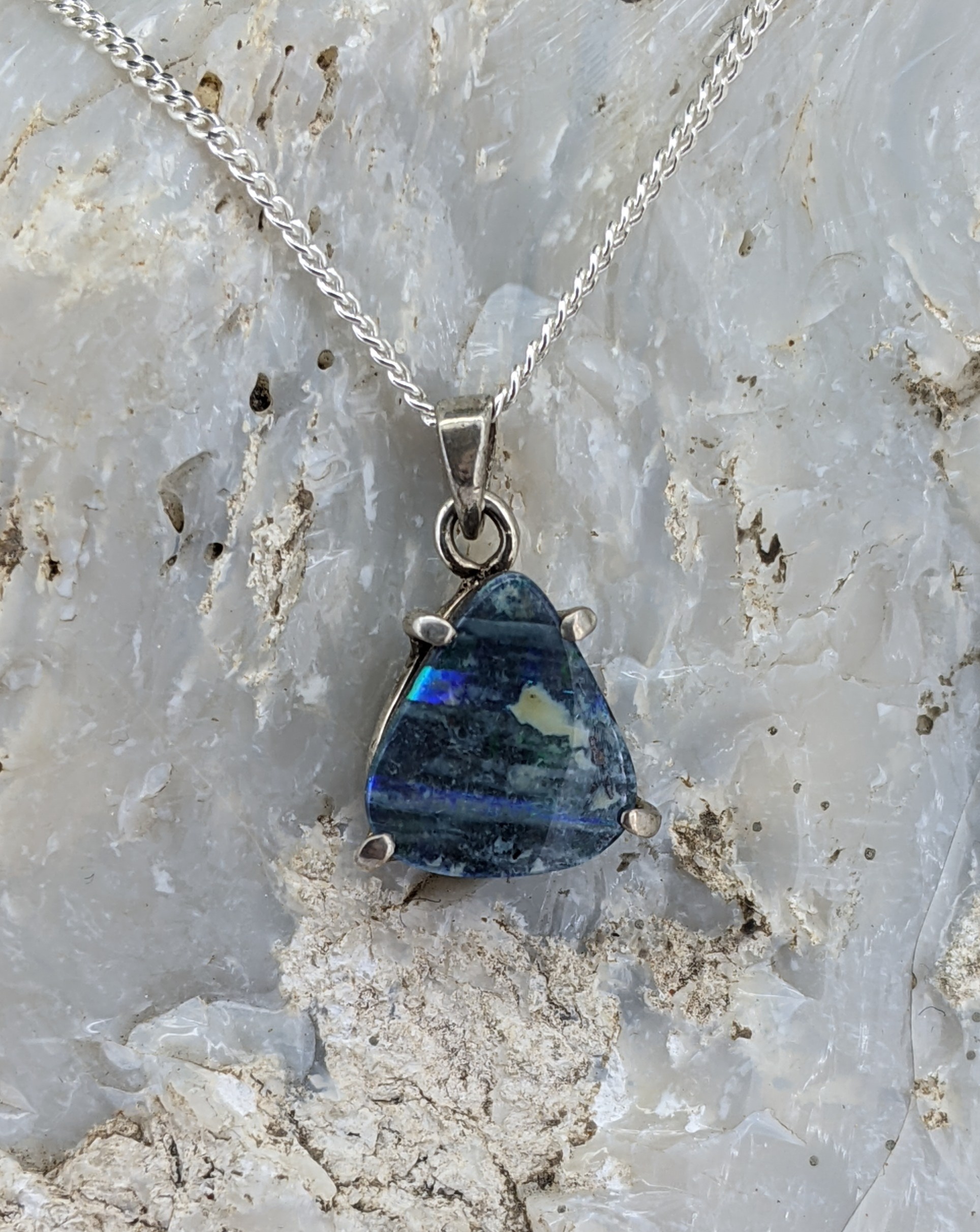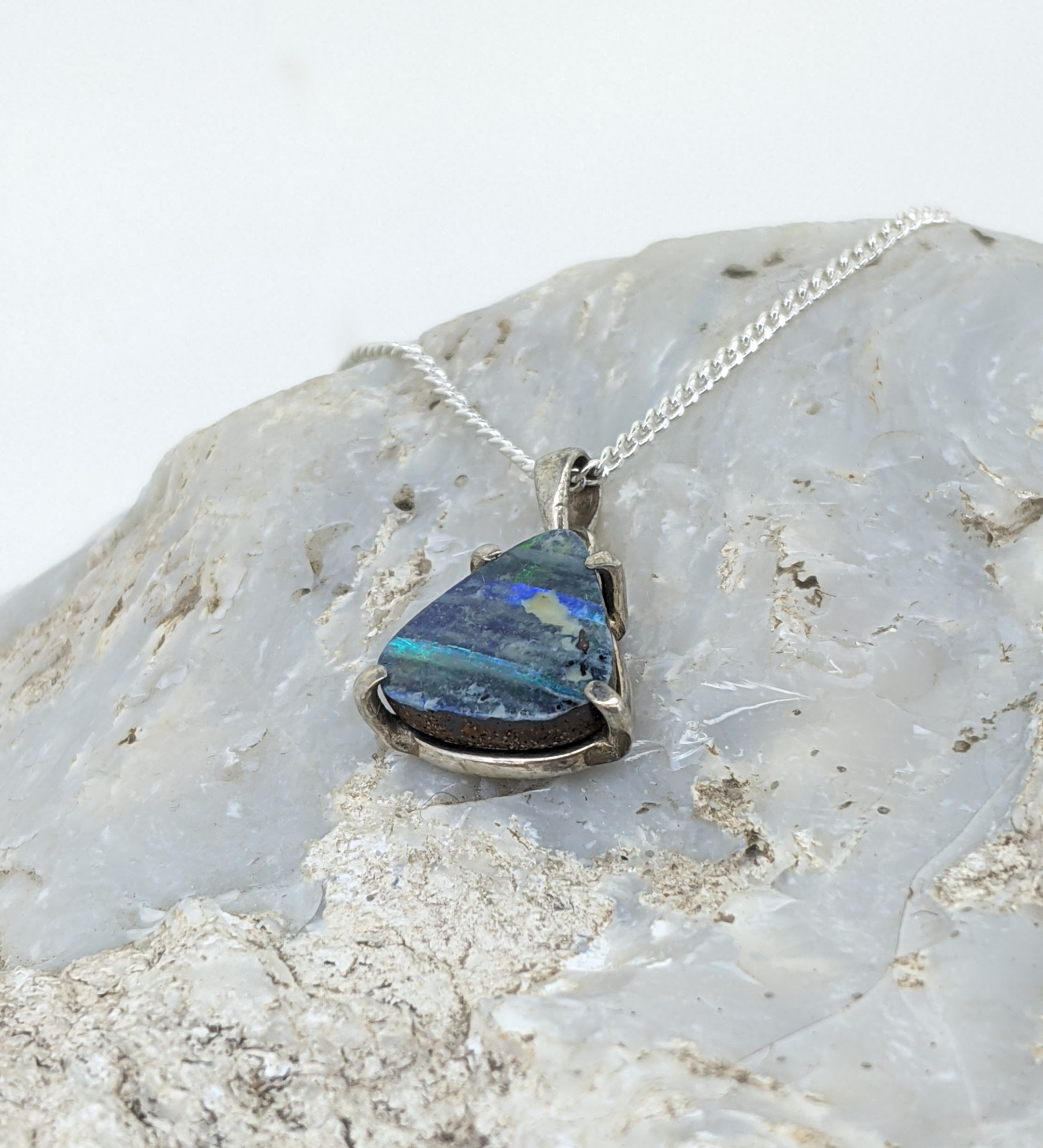 Solid natural boulder opal from Winton, Queensland. This solid boulder opal pendant is set in Sterling Silver. The opal has a flashy display of the colours green and blue.