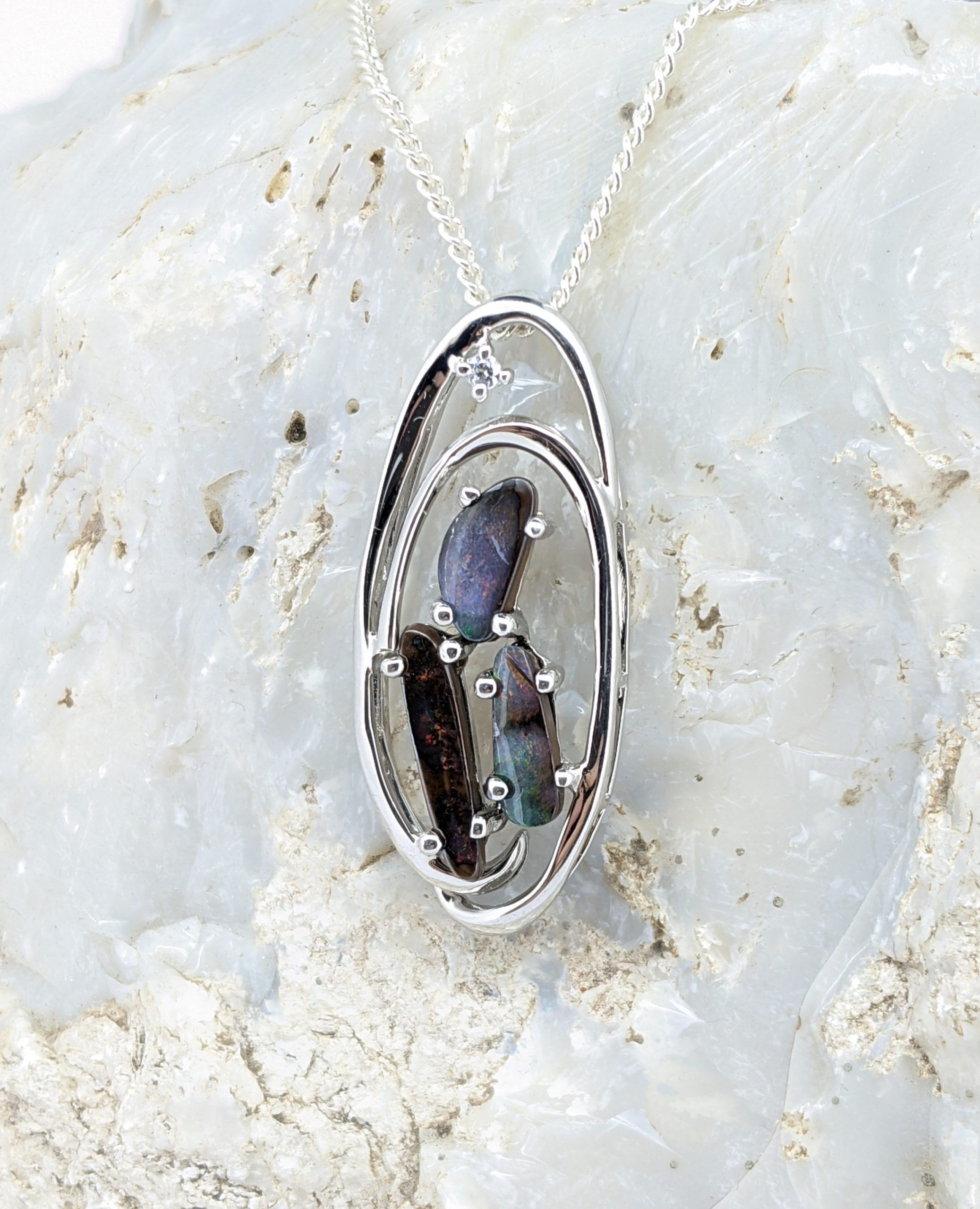 Solid natural boulder opals from Winton, Queensland. This solid boulder opal pendant is set in Sterling Silver. The opals are accentuated by a cubic zirconia and have a strong display of the colours red, orange and green.
