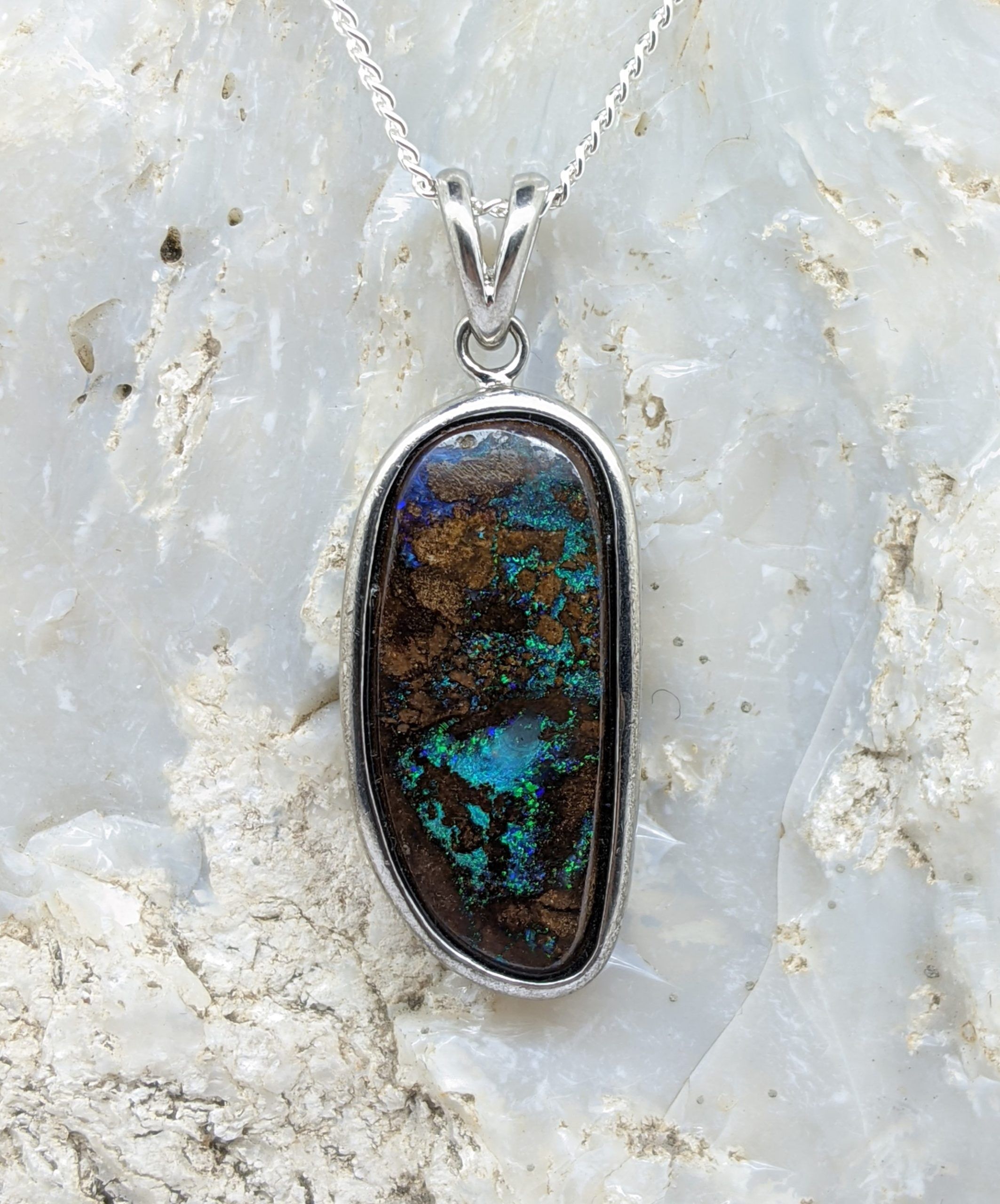Solid natural boulder opal from Winton, Queensland. This solid boulder opal pendant is set in Sterling Silver and has a strong display of the colours green and blue.