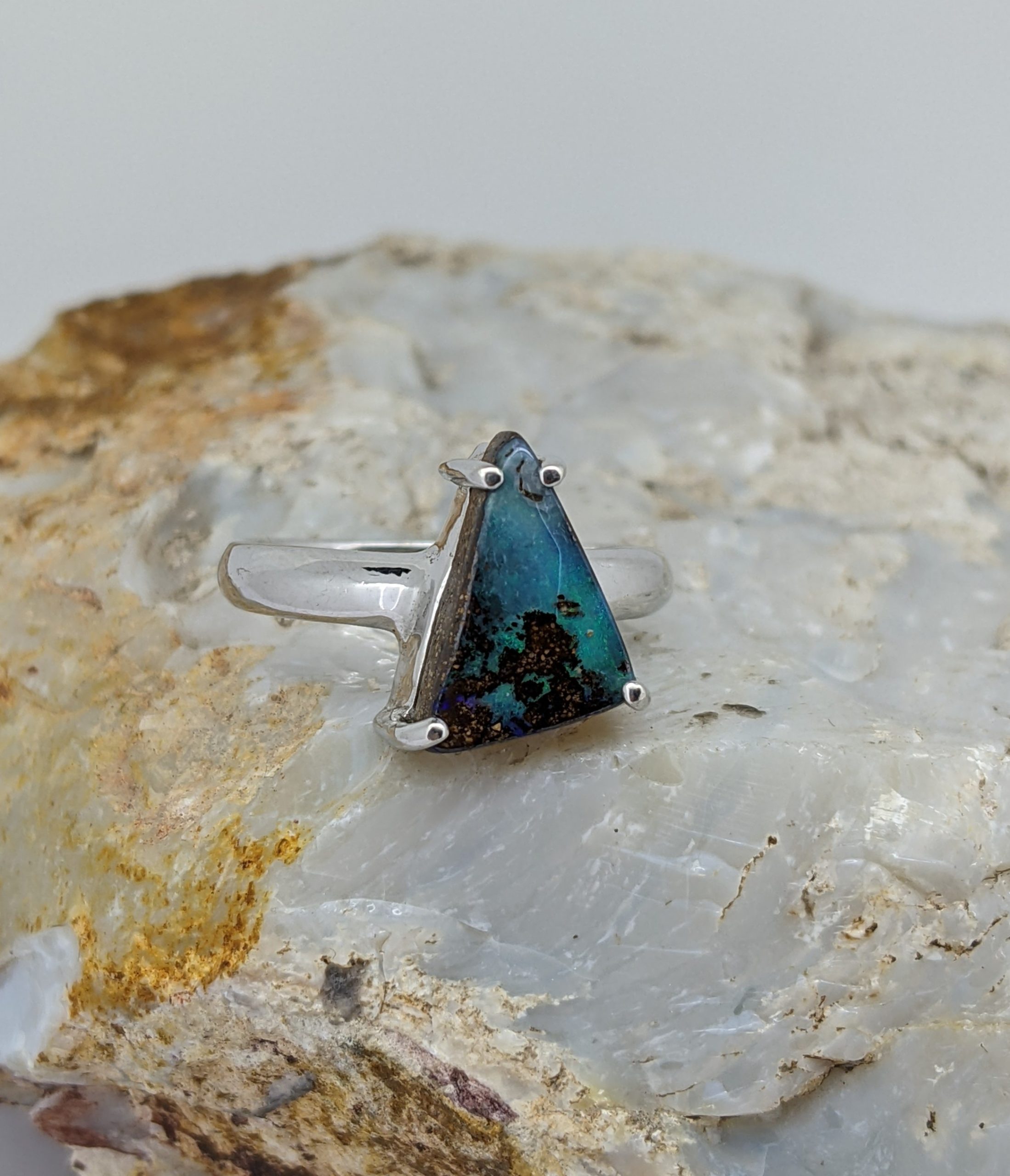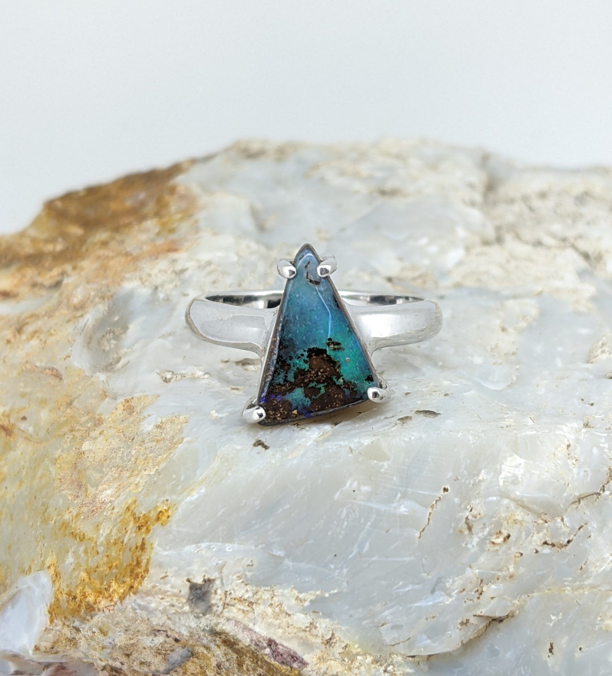 Solid natural boulder opal from Winton, Queensland. This solid boulder opal ring is crafted in Sterling Silver. The opal has a constant display of the colours green and blue.