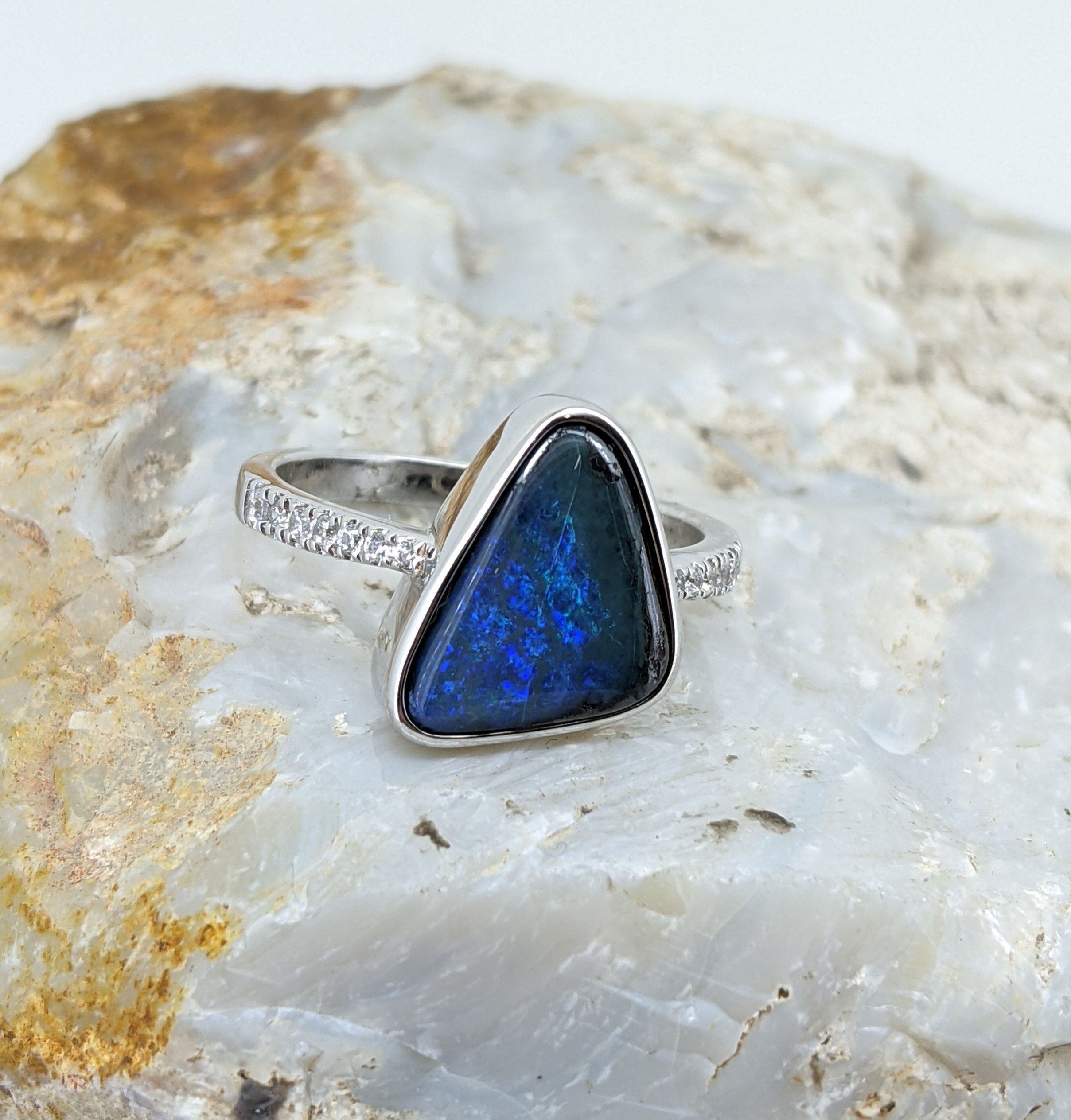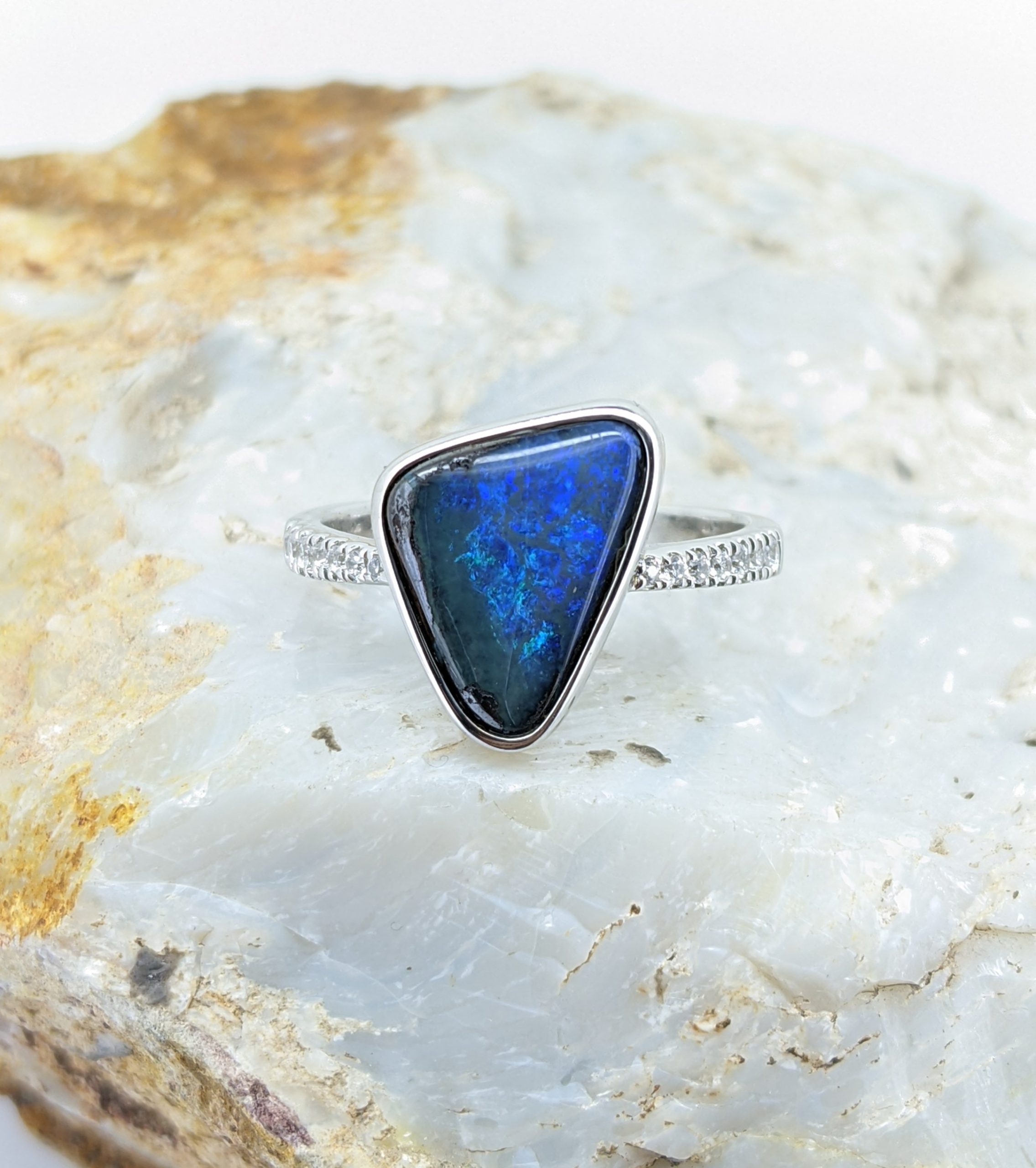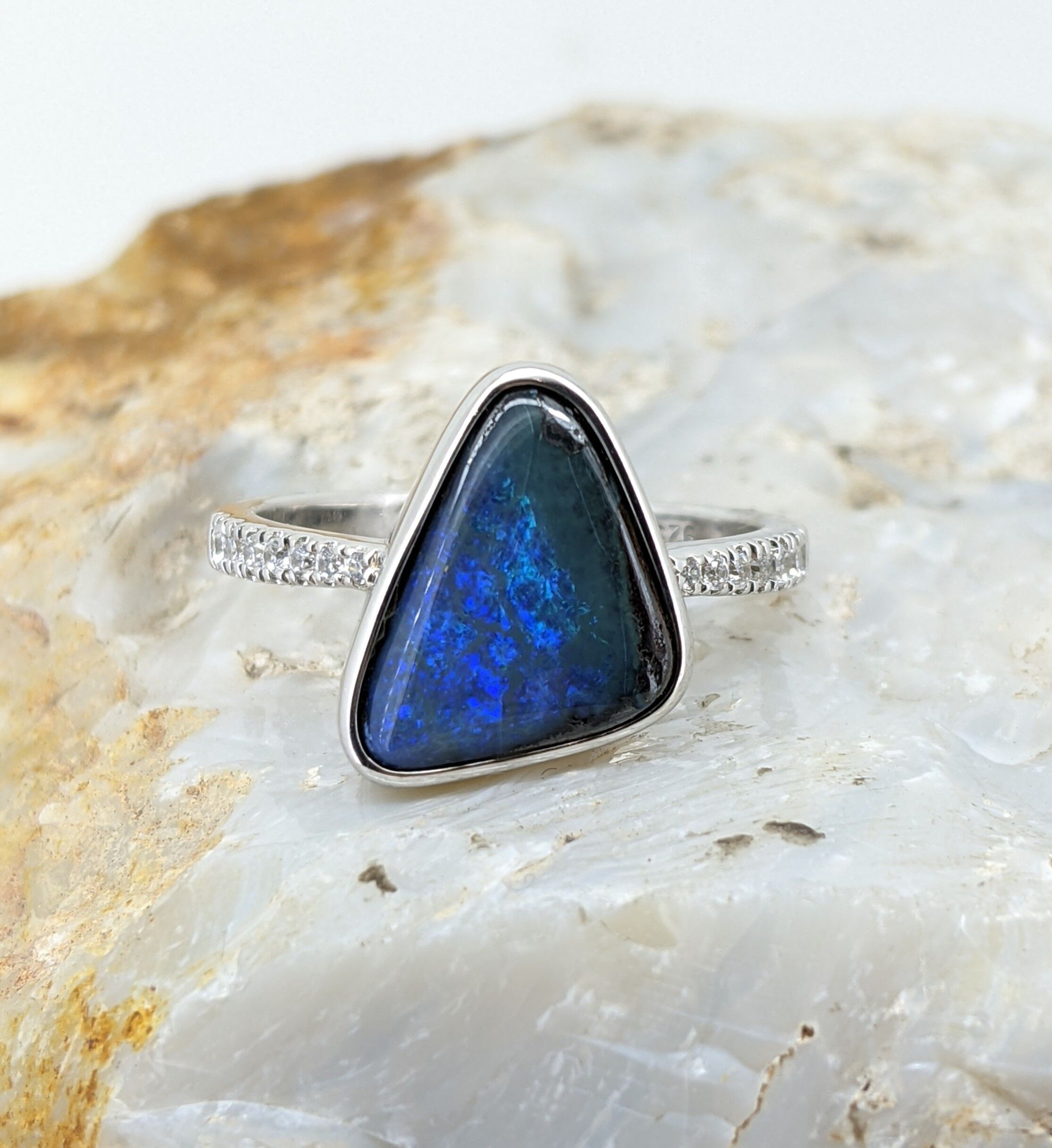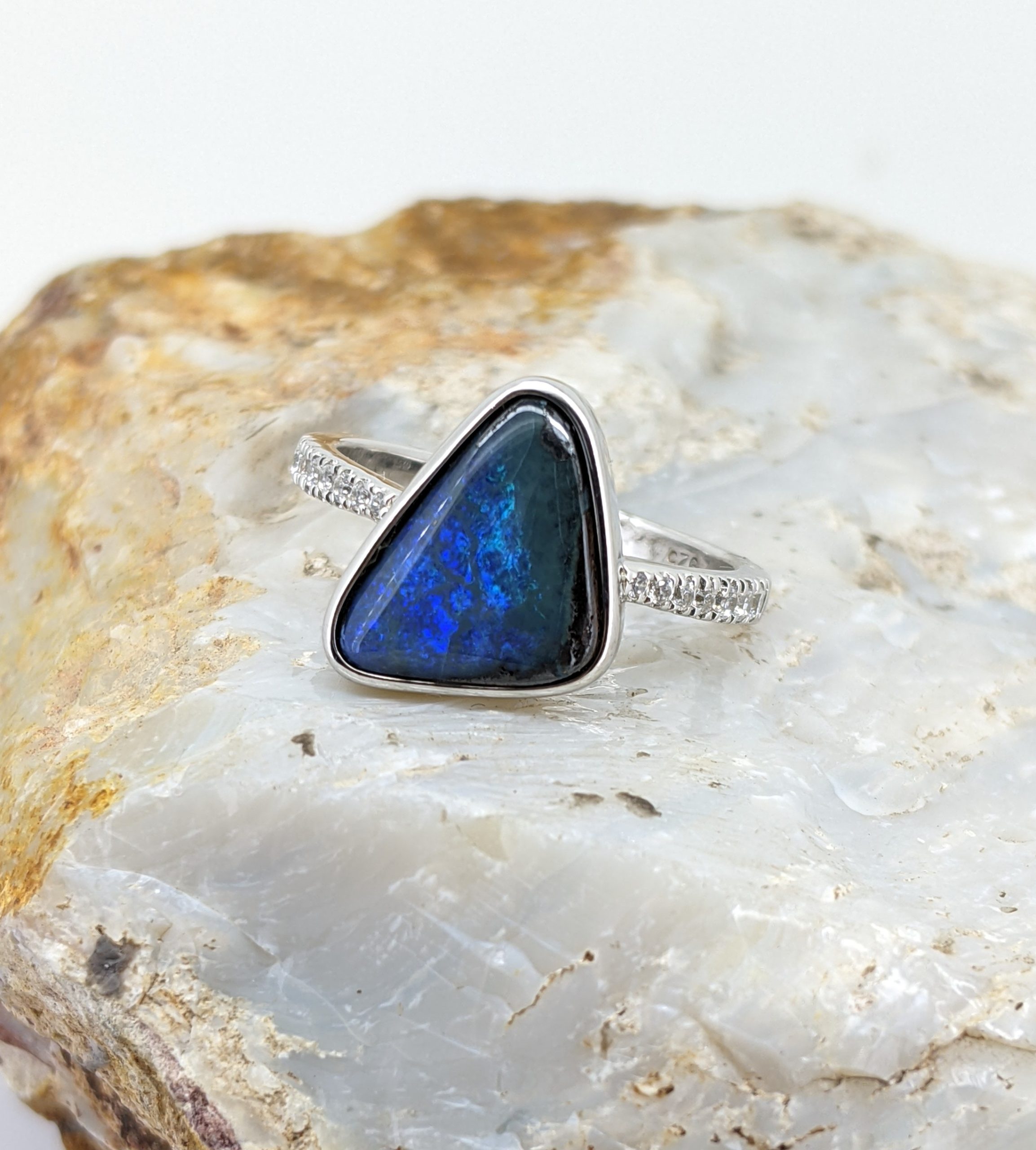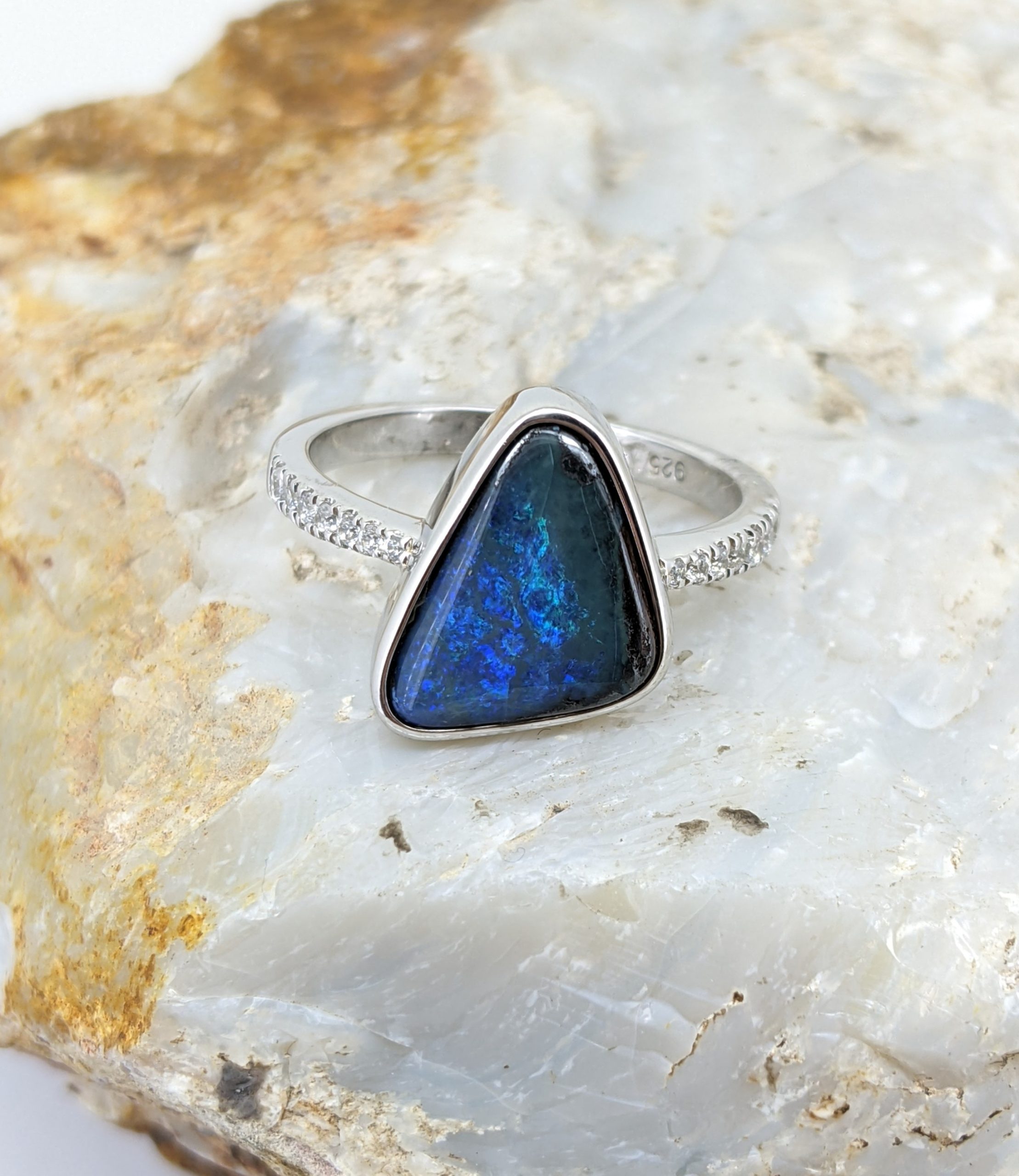 Solid Boulder Opal Sterling Silver Ring With Cubic Zirconias