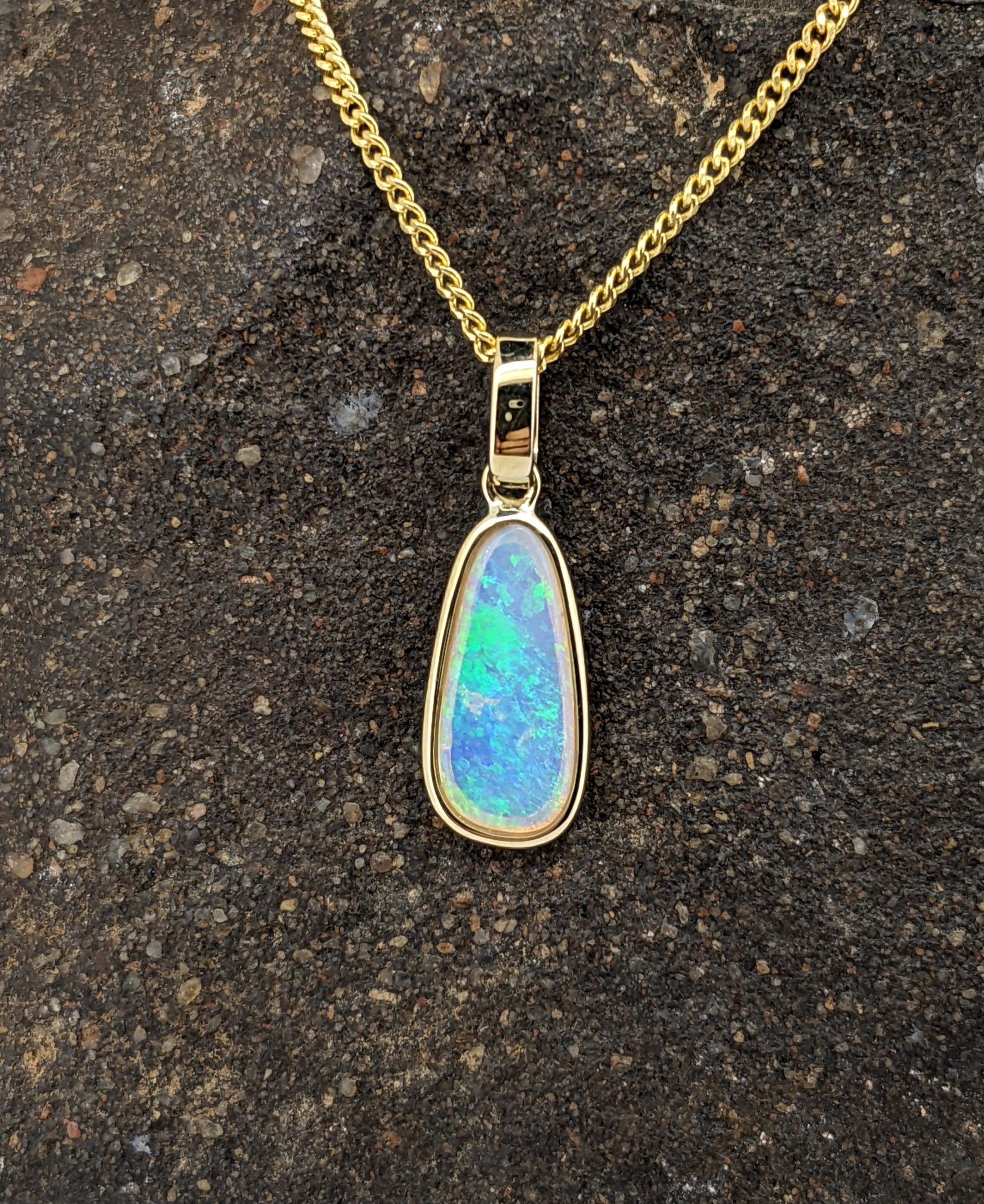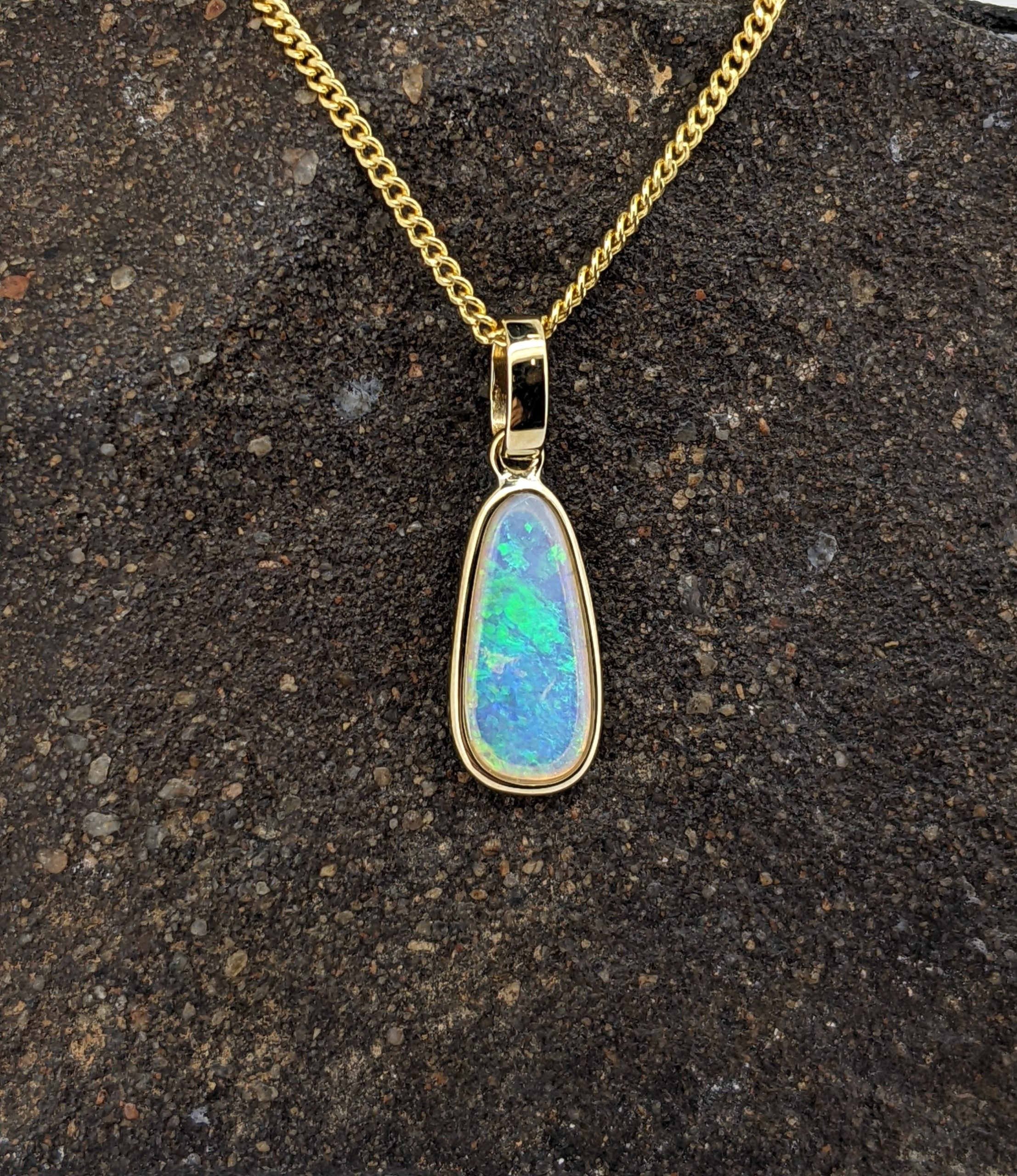 Solid natural white opal sourced from Coober Pedy, South Australia. This solid white opal pendant is set in 9K Yellow Gold. The opal has sparkly display of the colours blue and green.