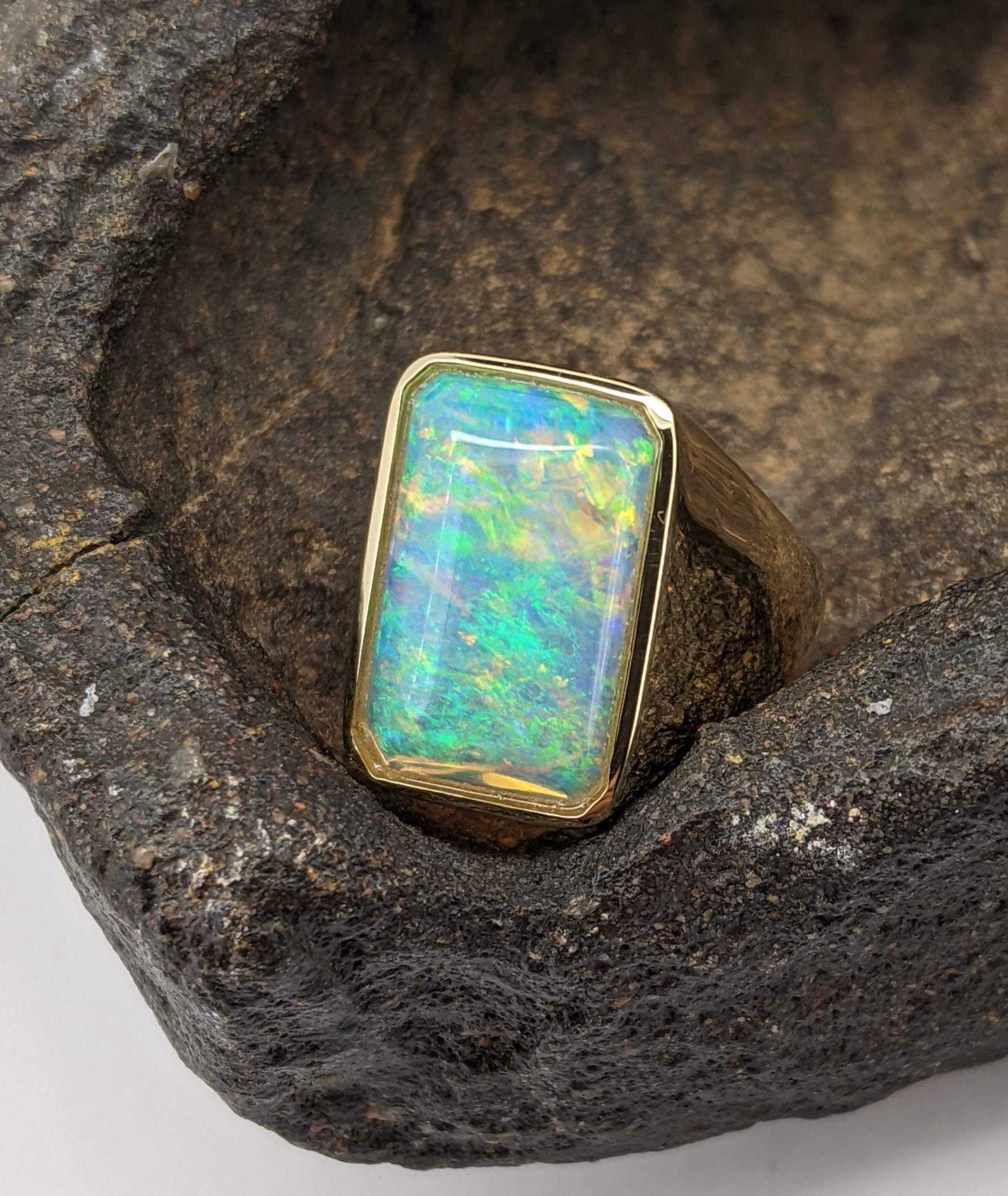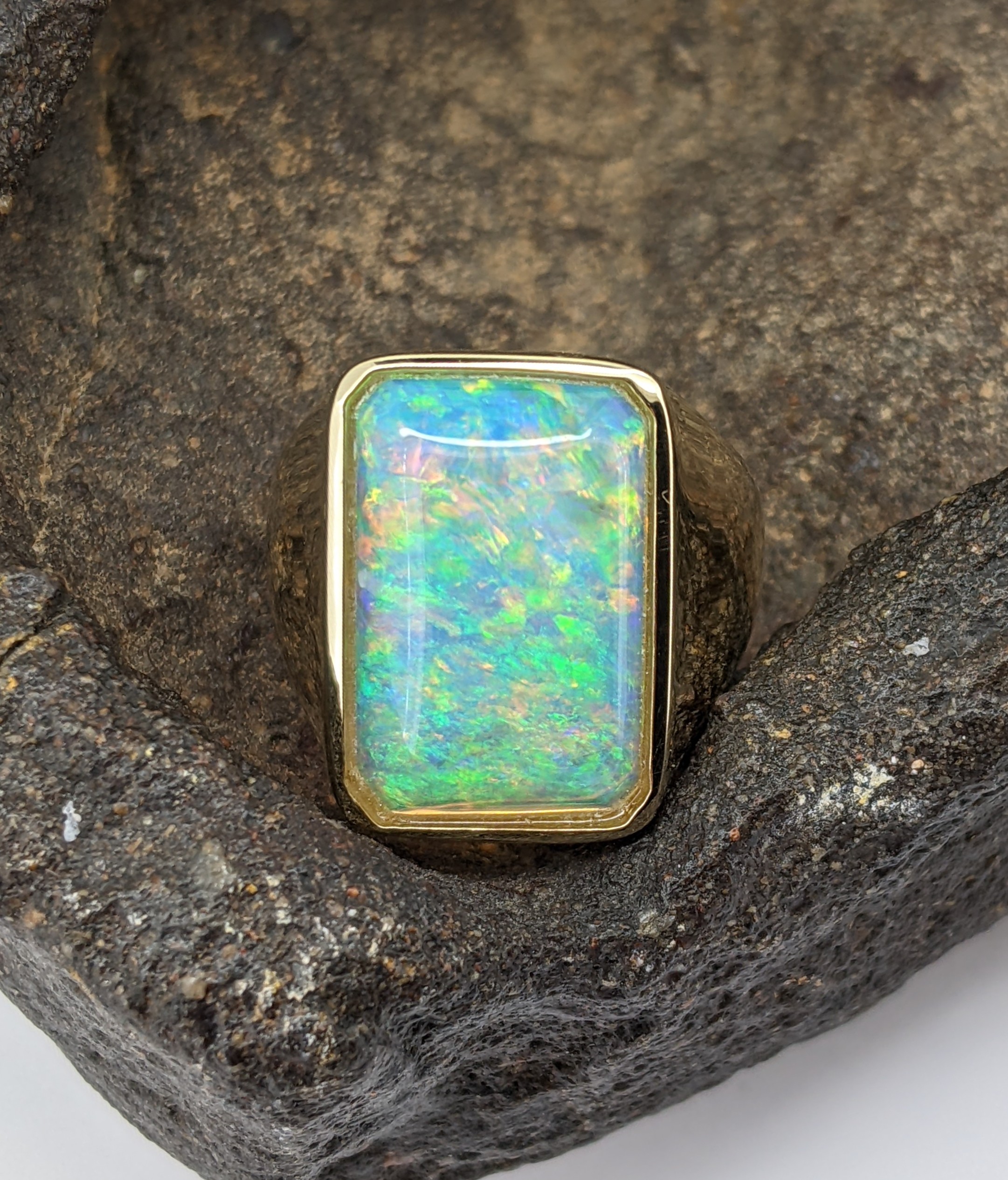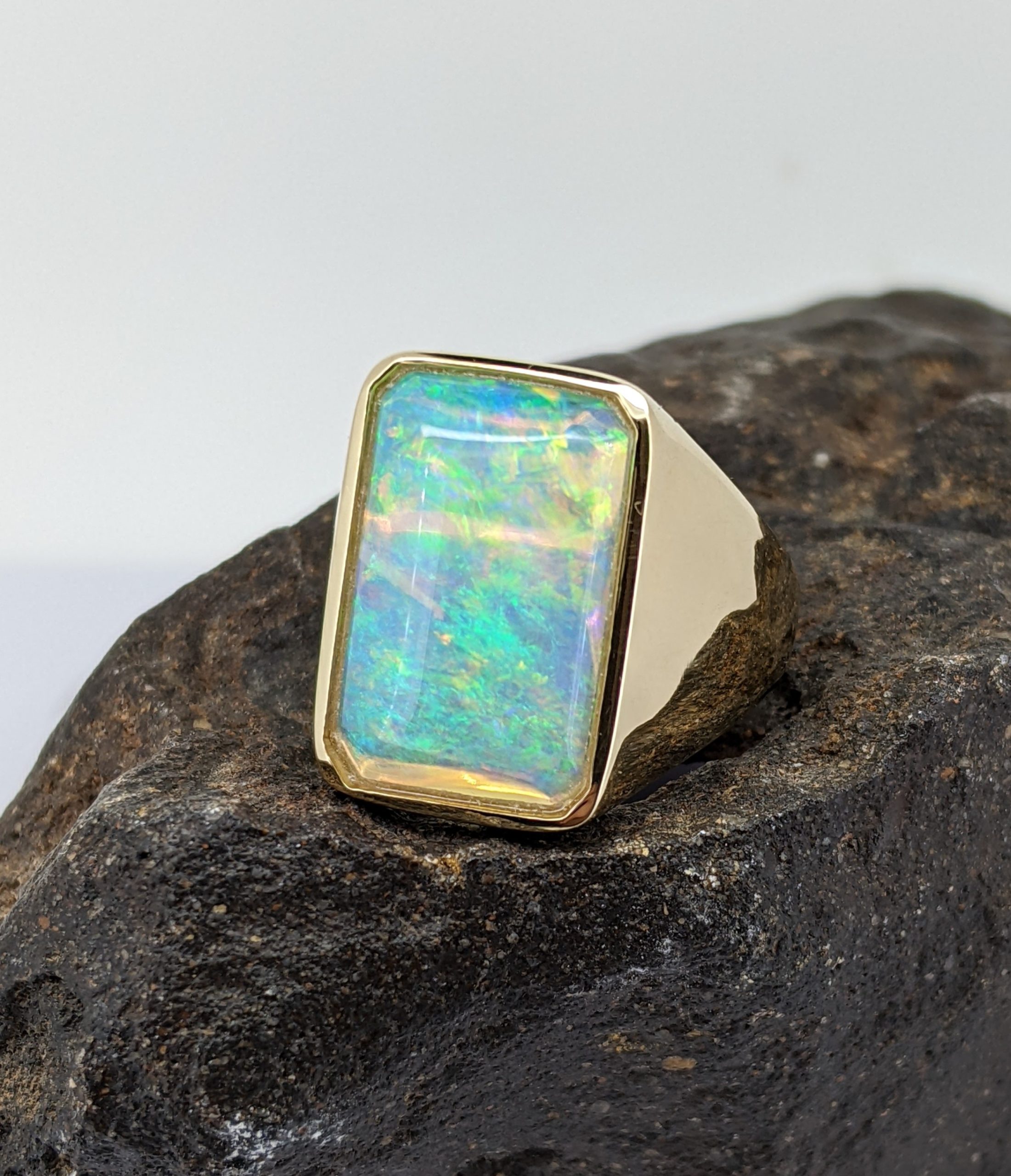Solid natural white opal sourced from Coober Pedy, South Australia. This solid white opal ring is crafted in 9K Yellow Gold. The opal has an intense and vibrant display of the colours green, blue, yellow and orange.