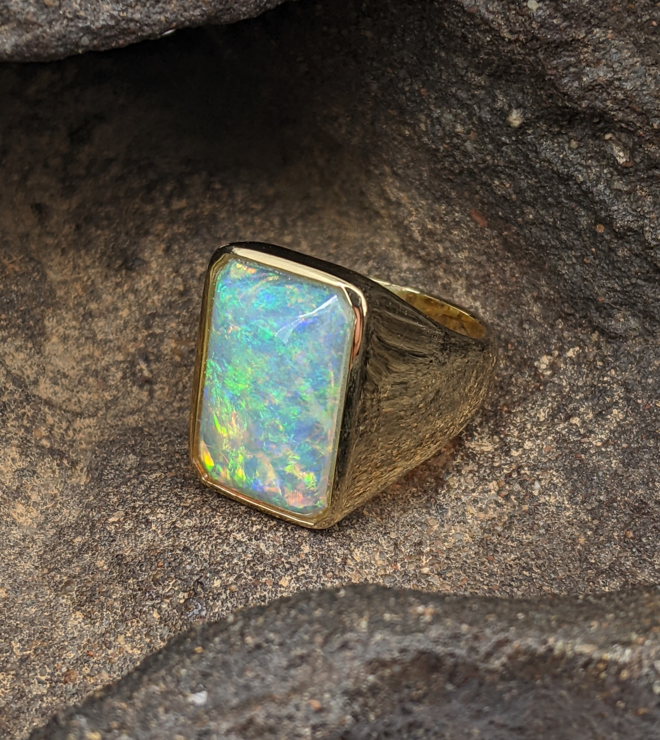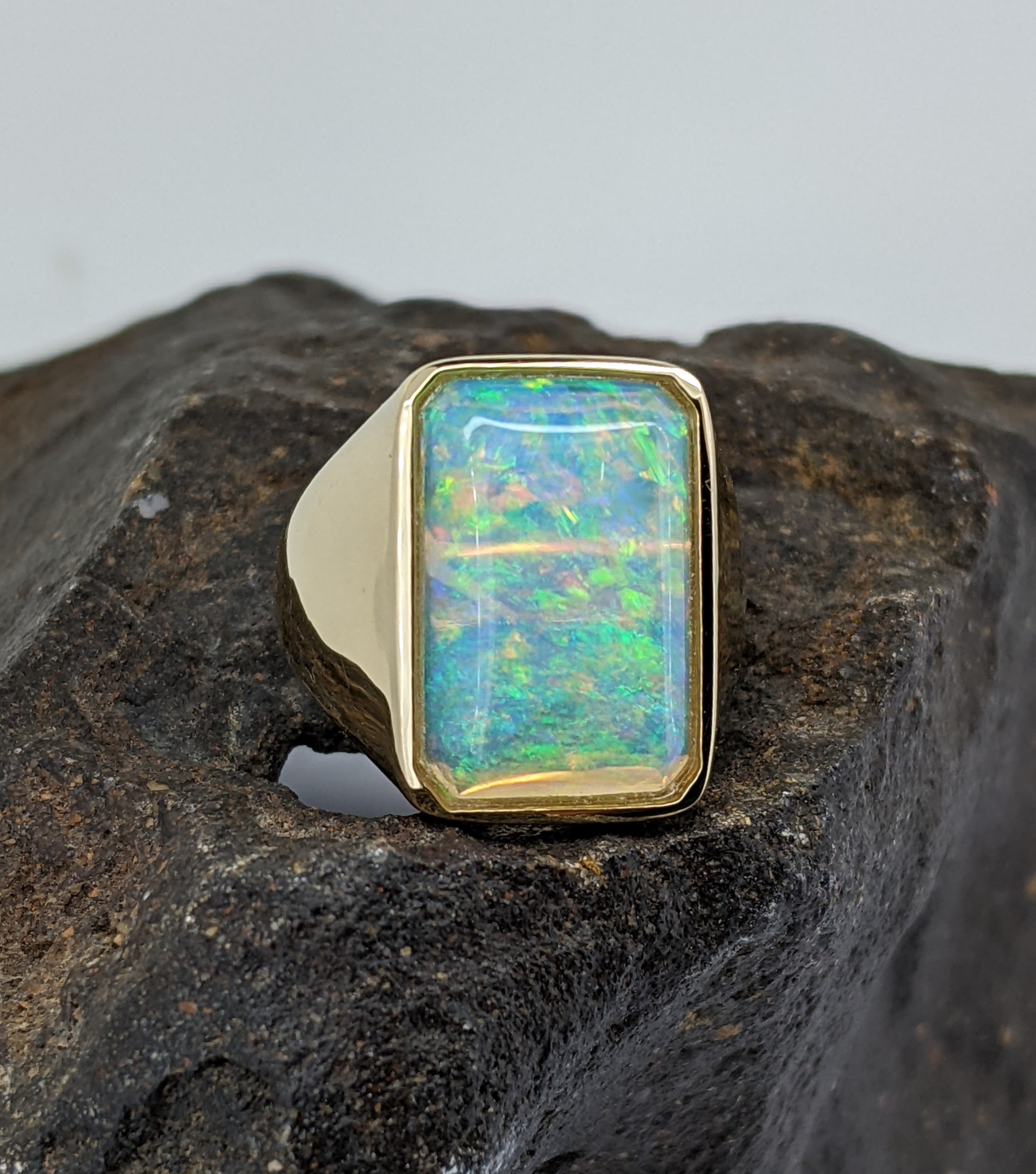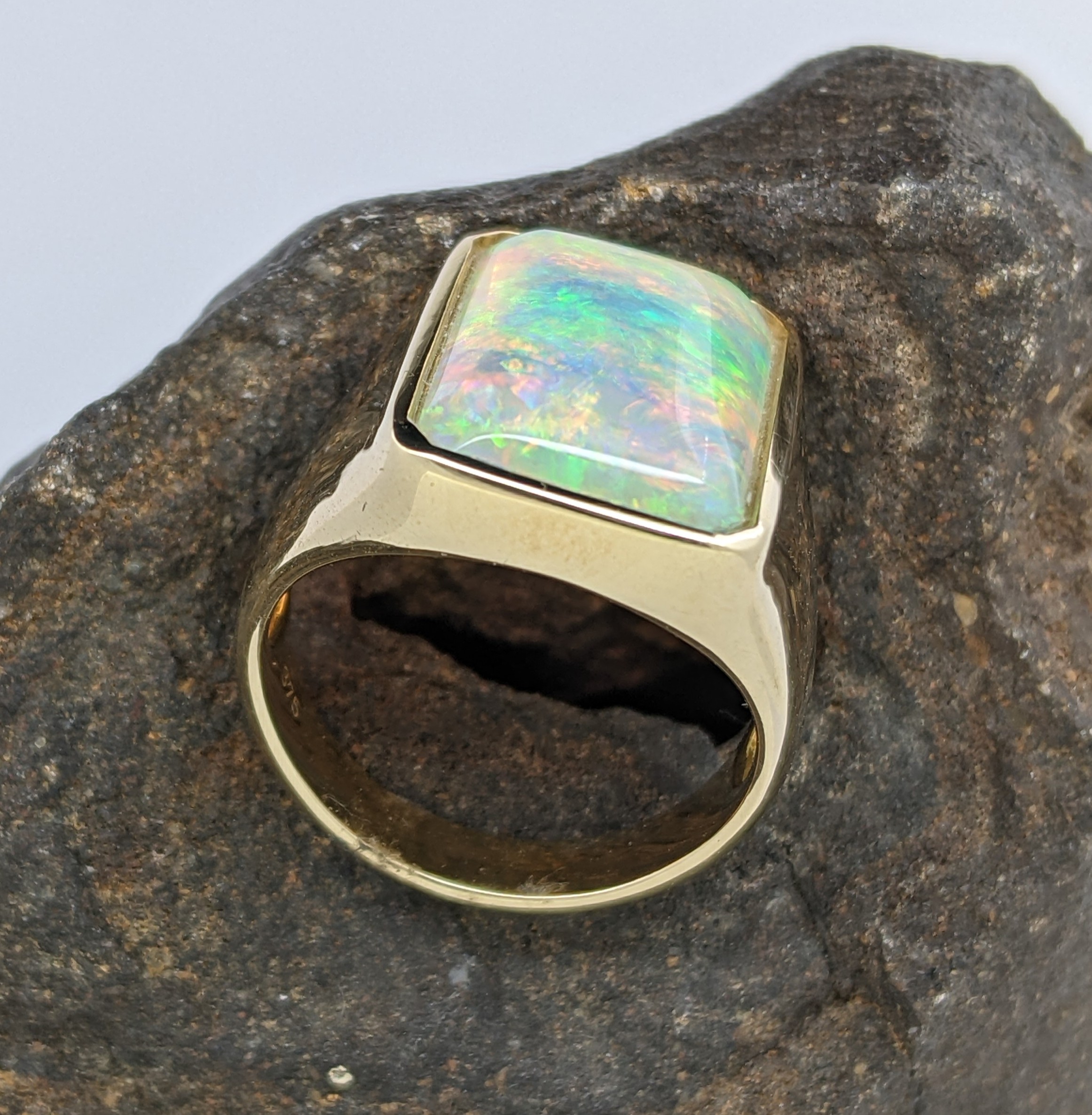 Solid natural white opal sourced from Coober Pedy, South Australia. This solid white opal ring is crafted in 9K Yellow Gold. The opal has an intense and vibrant display of the colours green, blue, yellow and orange.