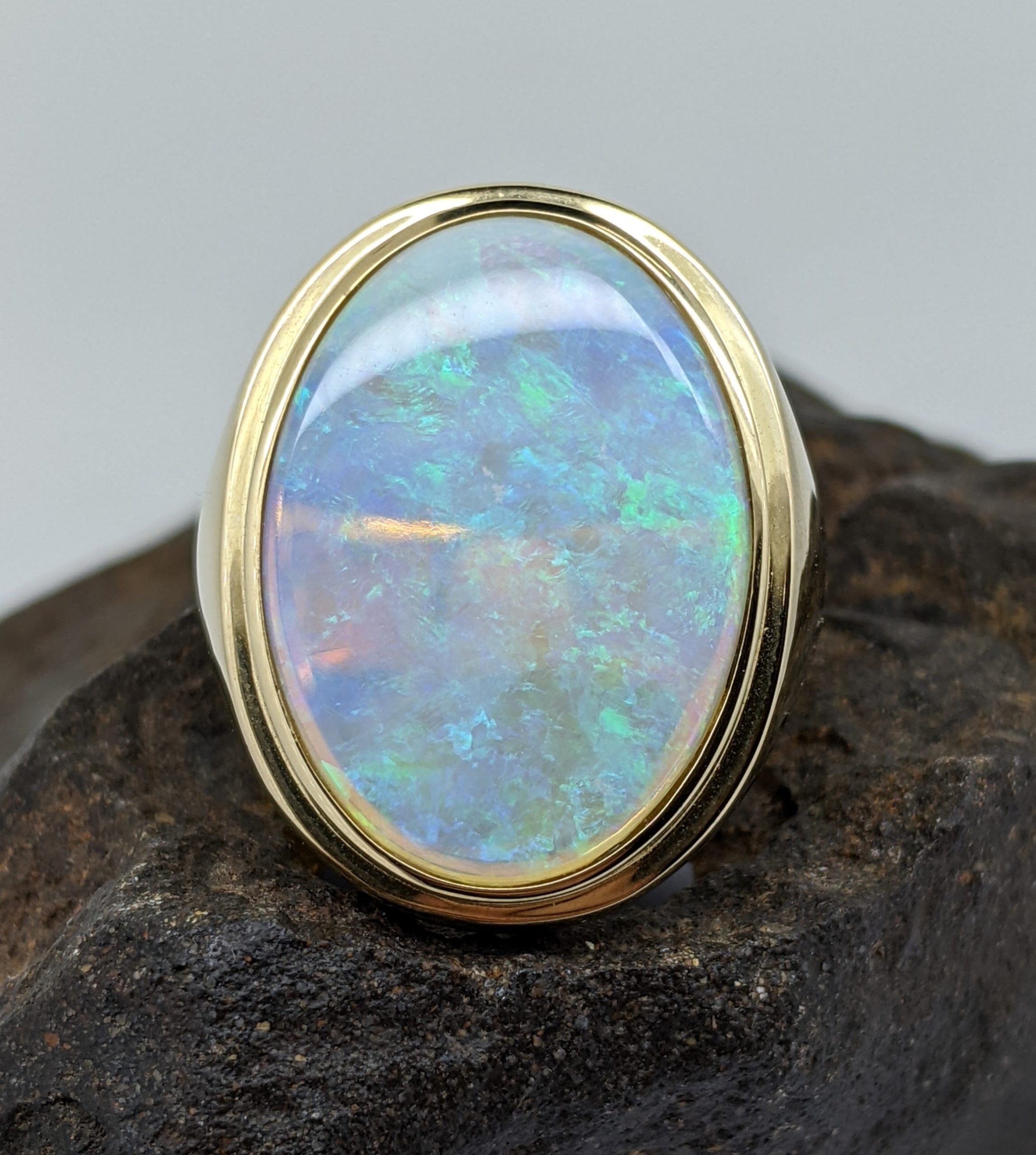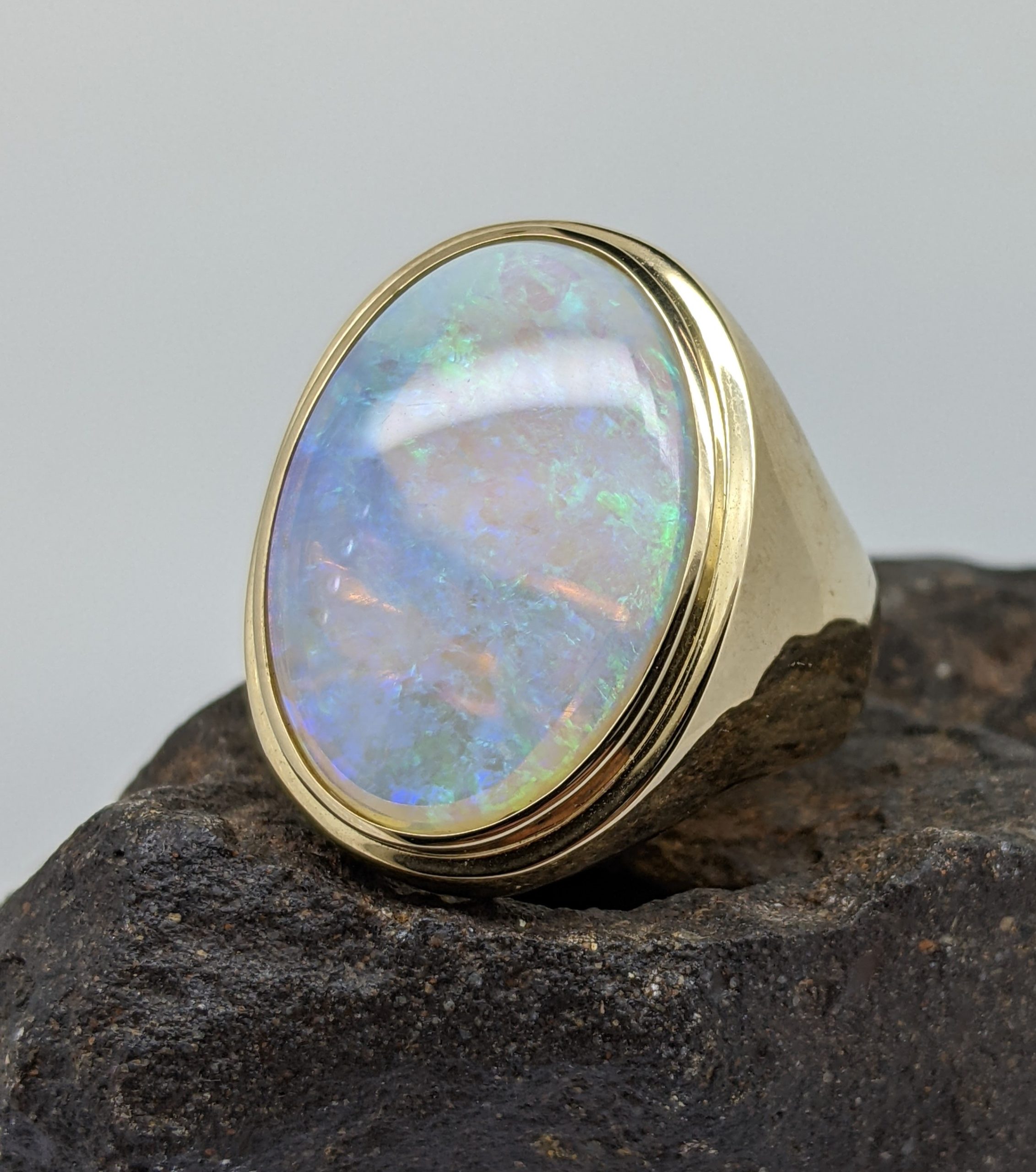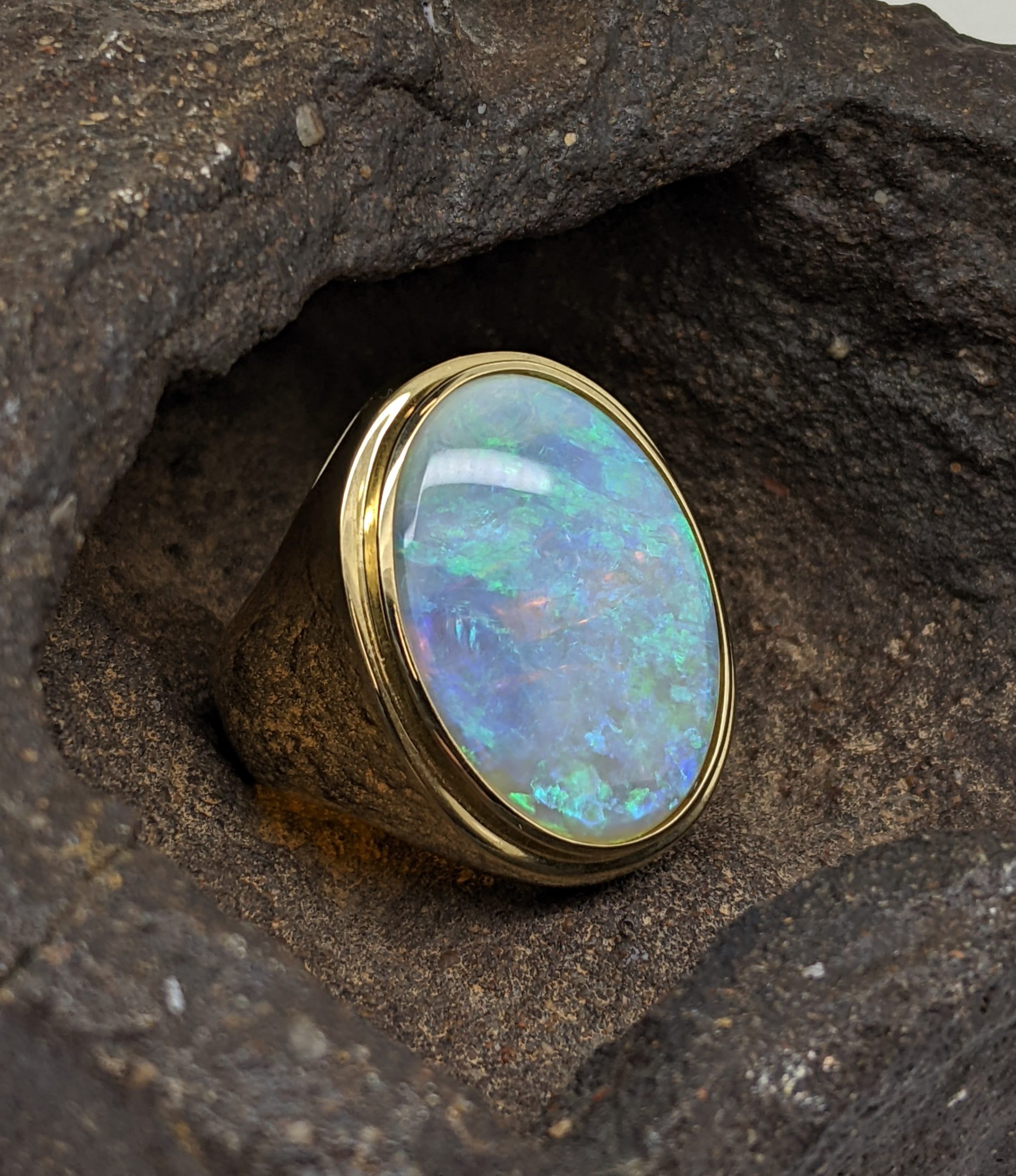 Solid natural white crystal opal sourced from Coober Pedy, South Australia. This solid white crystal opal ring is set in 9K Yellow Gold. The opal has a strong display of the colours blue and green.