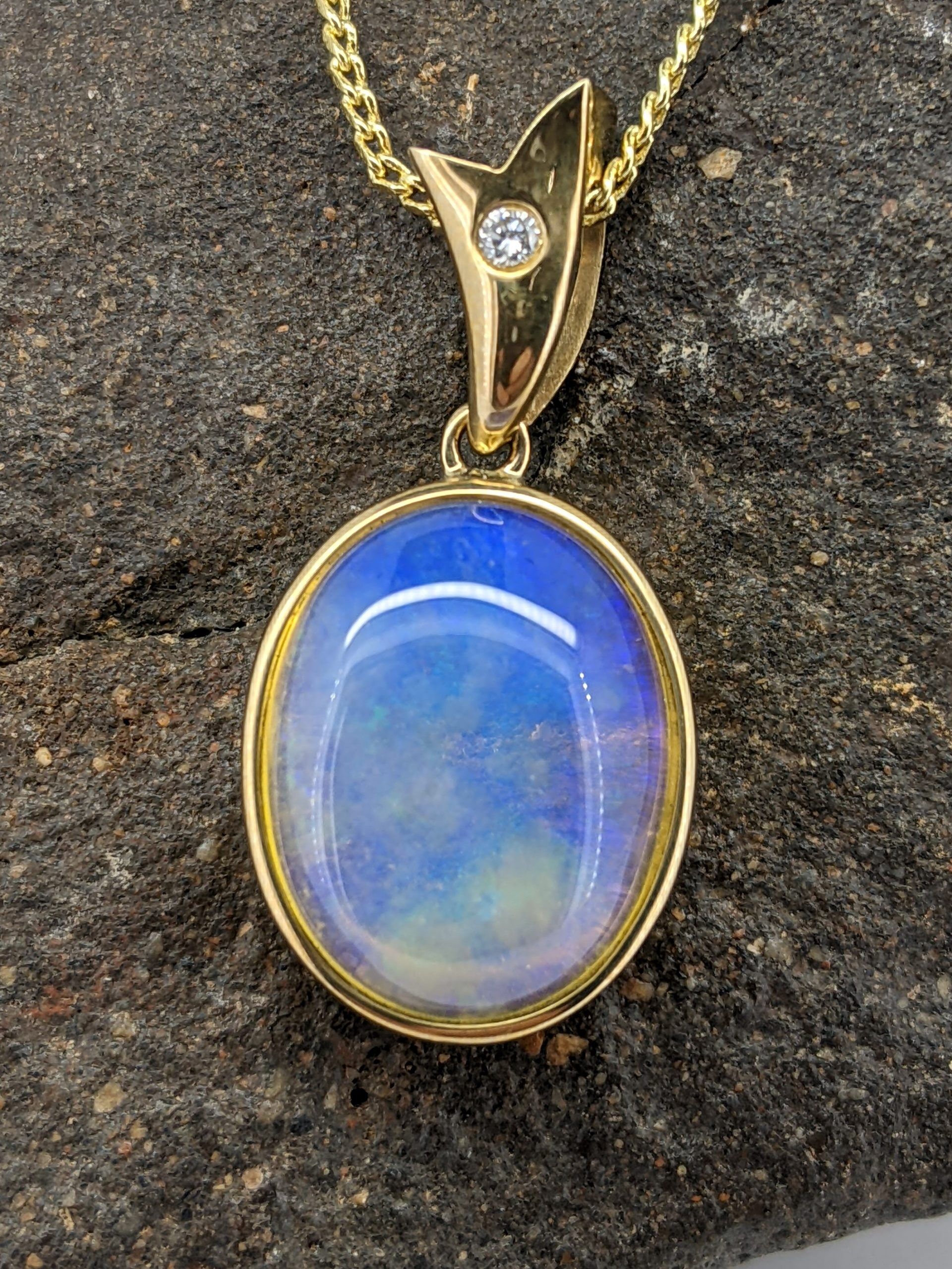 Solid natural white crystal opal sourced from Coober Pedy, South Australia. This solid white opal pendant is made in 9K Yellow Gold and is accentuated by a diamond. The opal has a constant display of the colours blue and green.