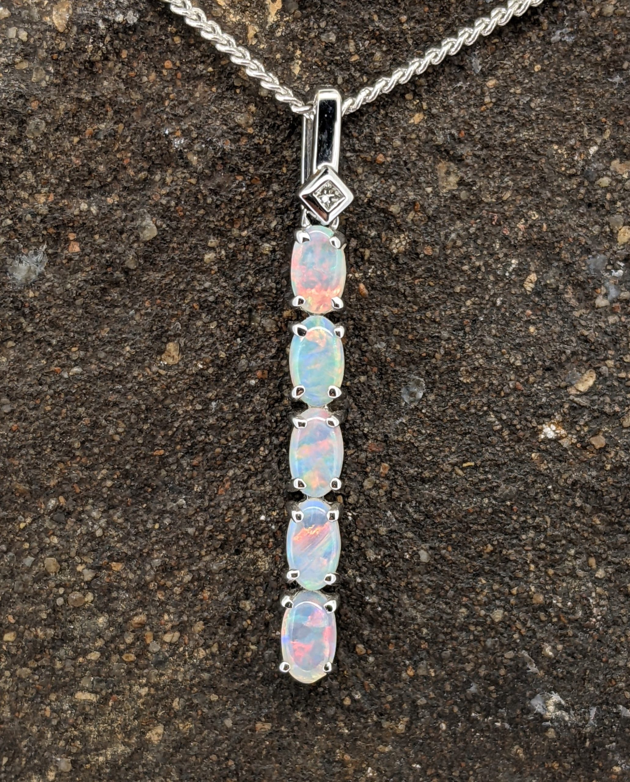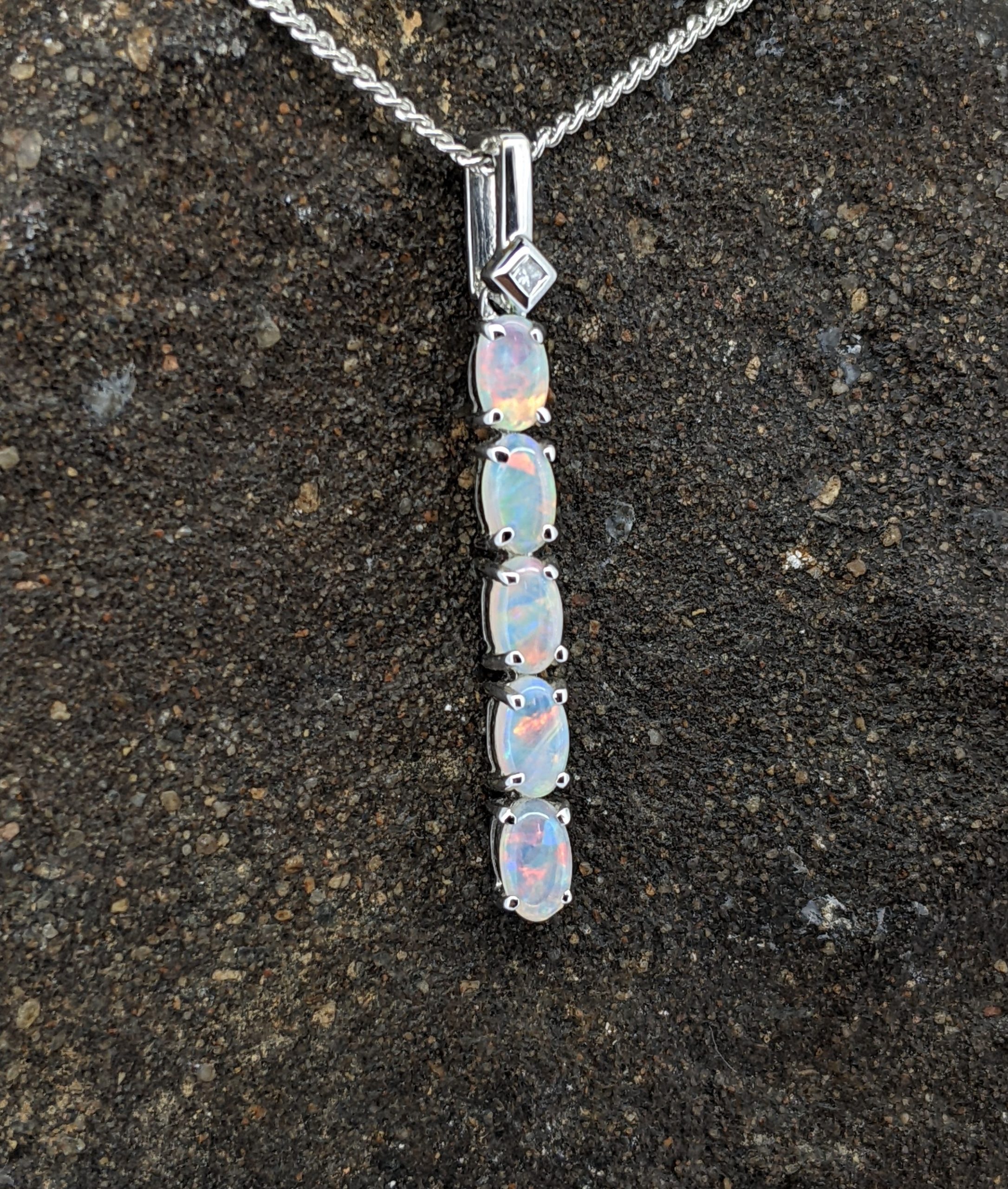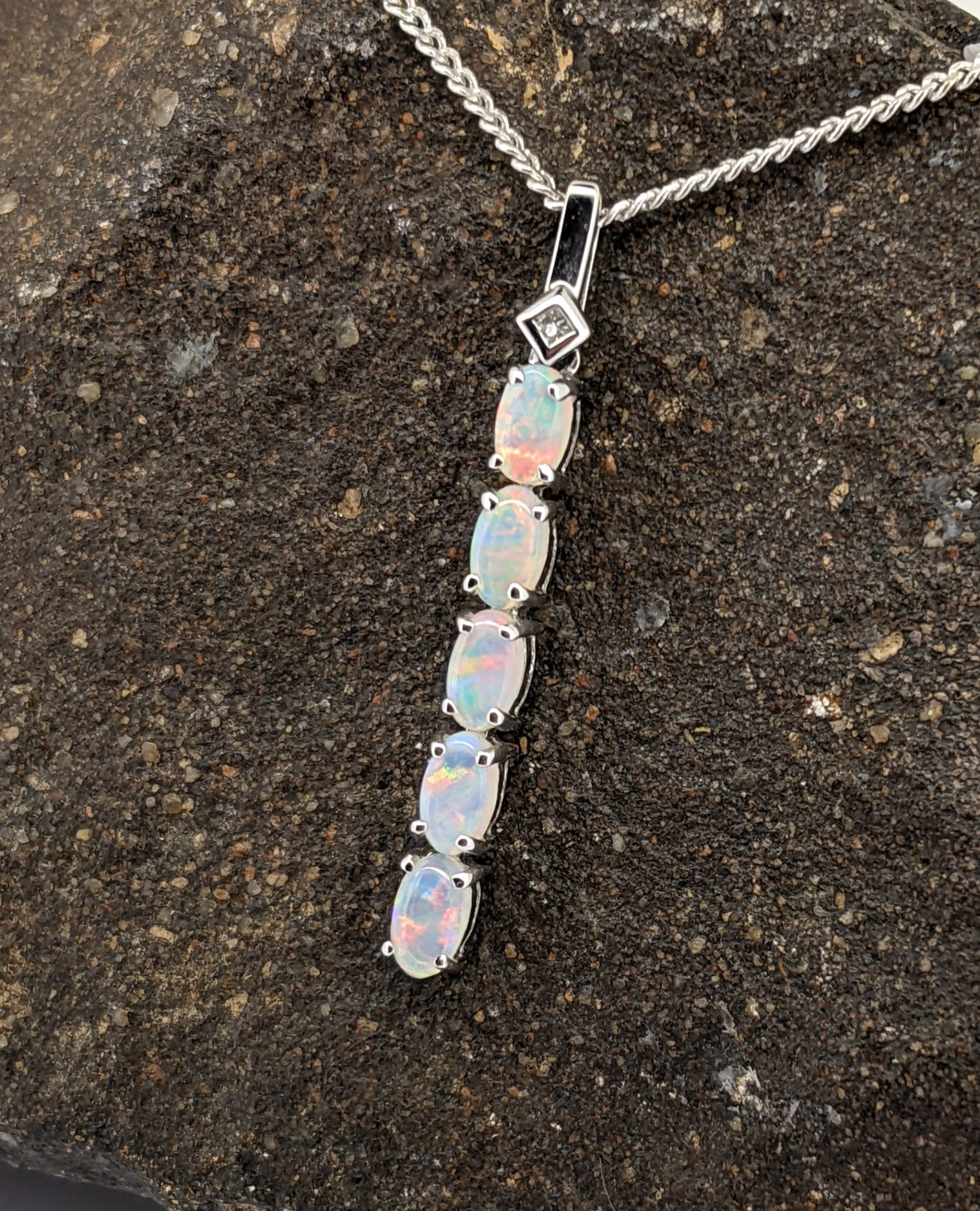 Solid natural white opal sourced from Coober Pedy, South Australia. This solid white opal pendant is set in 18K White Gold. The opal is accentuated by a diamond. It has an intense and flashy display of the colours red, blue and green.