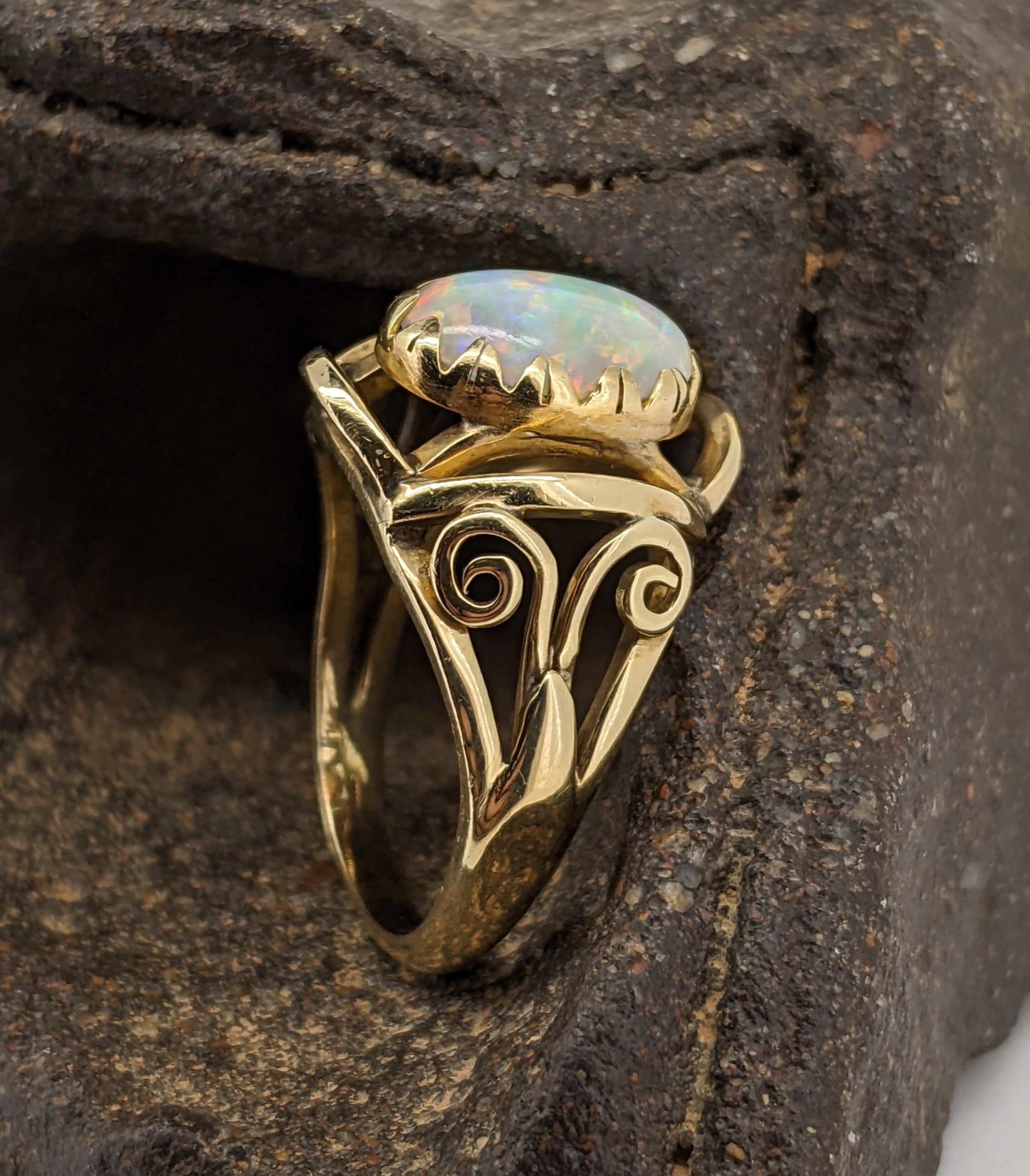 This solid white opal 18K Yellow Gold ring is a stunning piece of fine jewellery that will add a touch of elegance to any outfit. The ring features a vibrant multicoloured white opal as the main stone, set in luxurious 18K Yellow Gold. This piece is perfect for those who appreciate quality craftsmanship and unique design. Ideal for special occasions or as a thoughtful gift for someone special, this ring is sure to be a standout accessory.