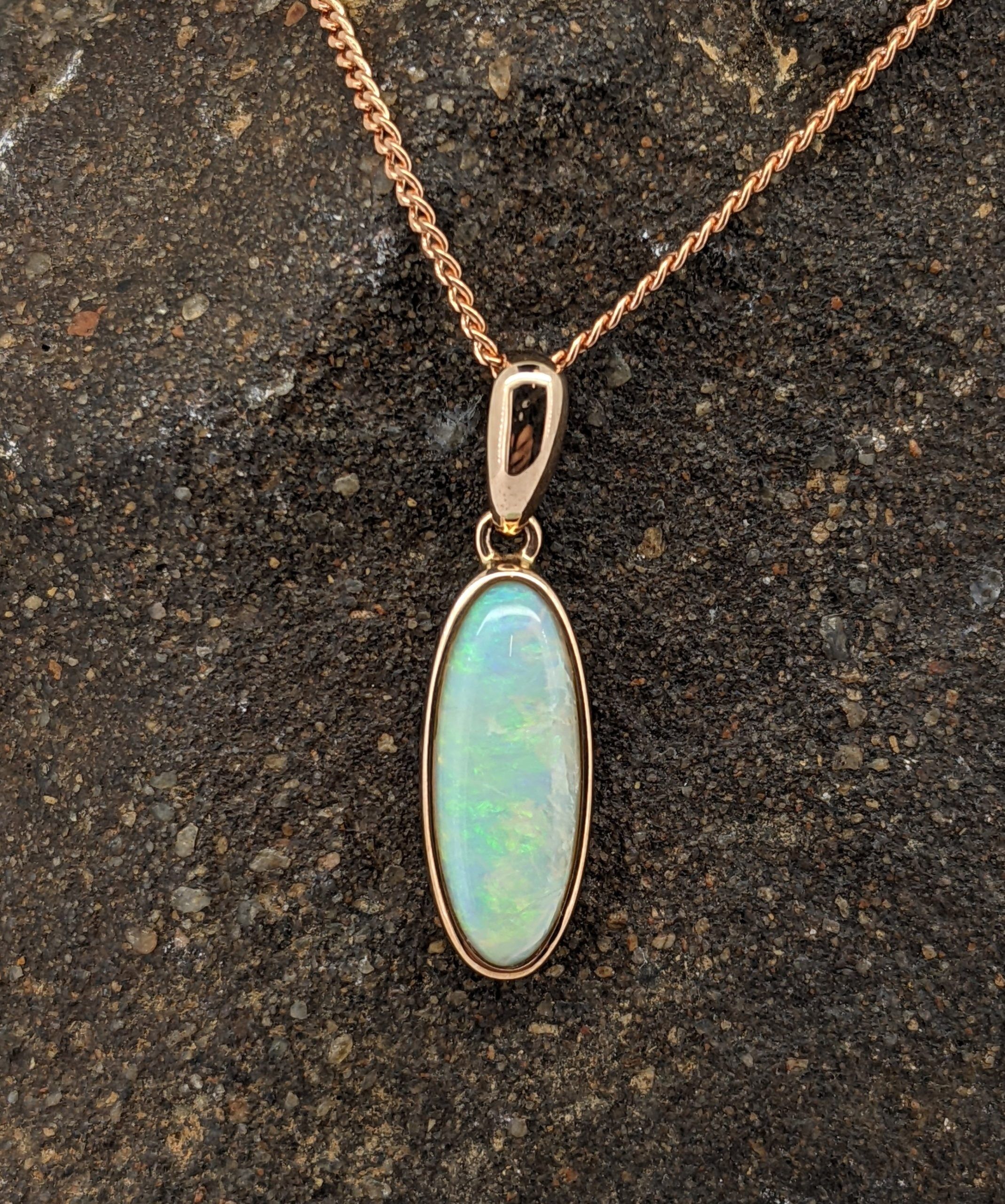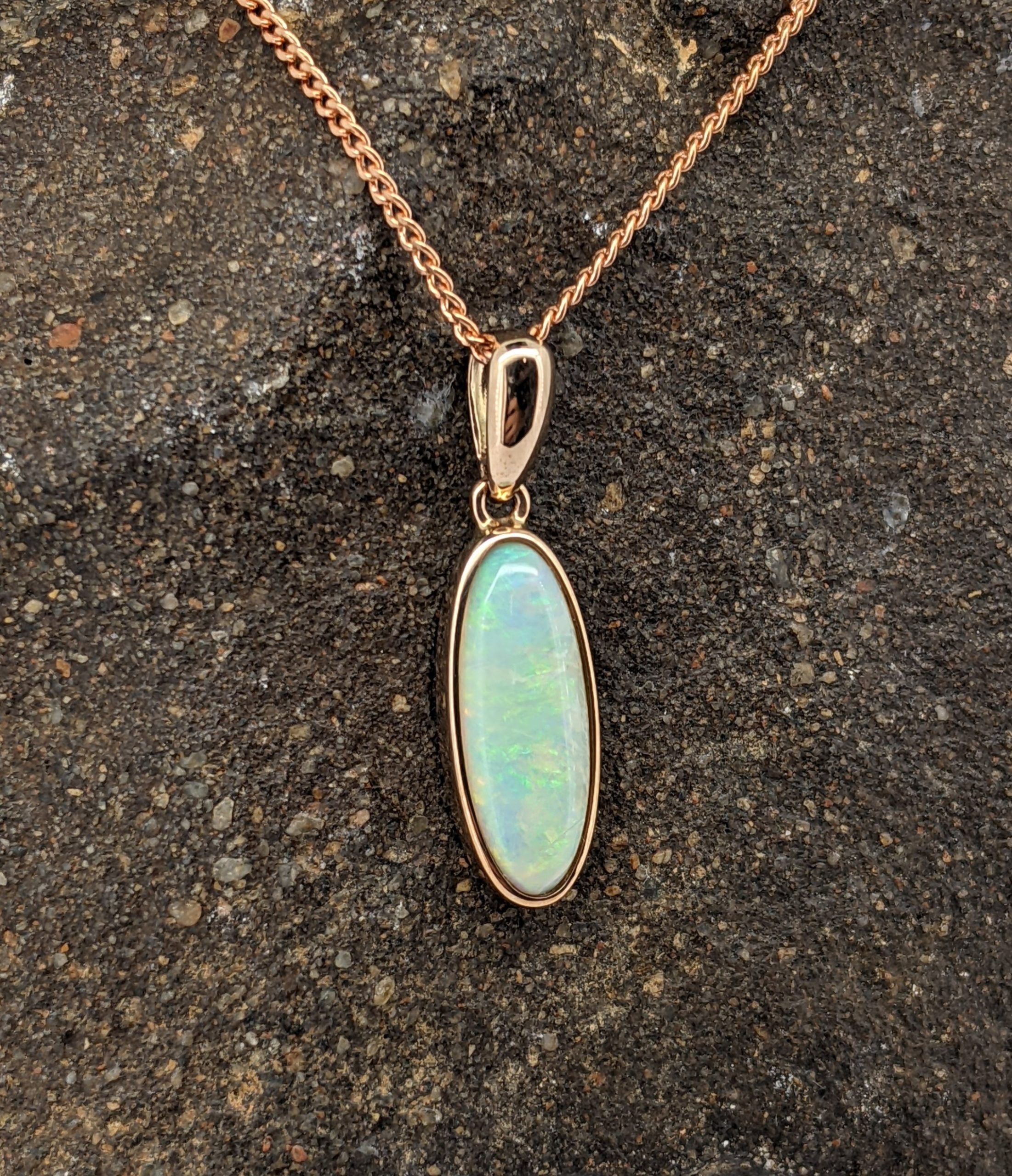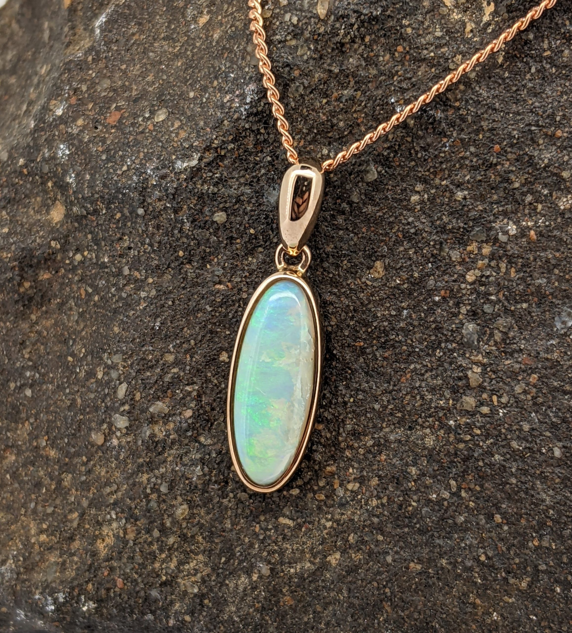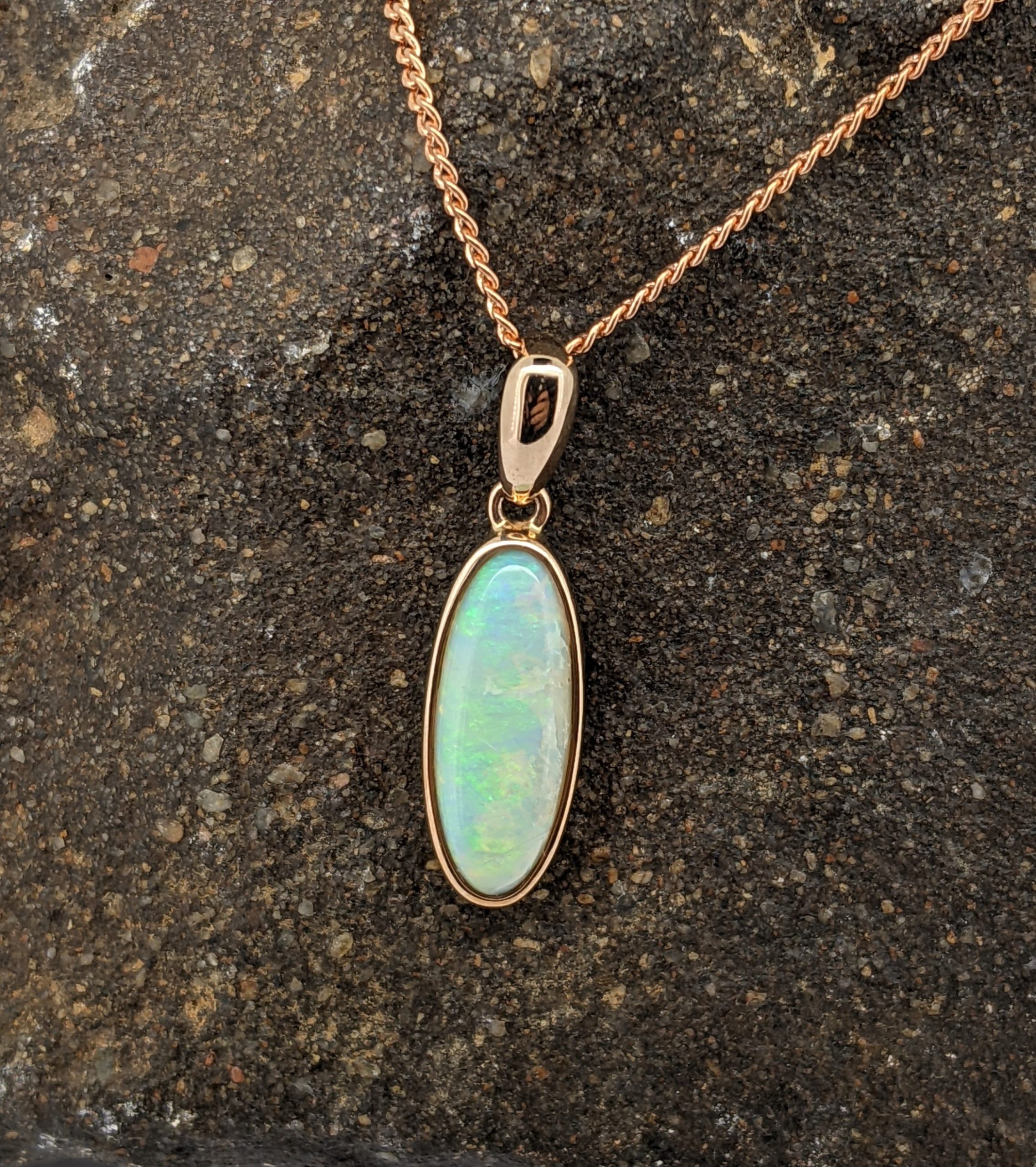 Solid natural white opal sourced from Coober Pedy, South Australia. This solid white opal pendant is set in 9K Rose Gold. The opal has a display of the colours green and yellow.
