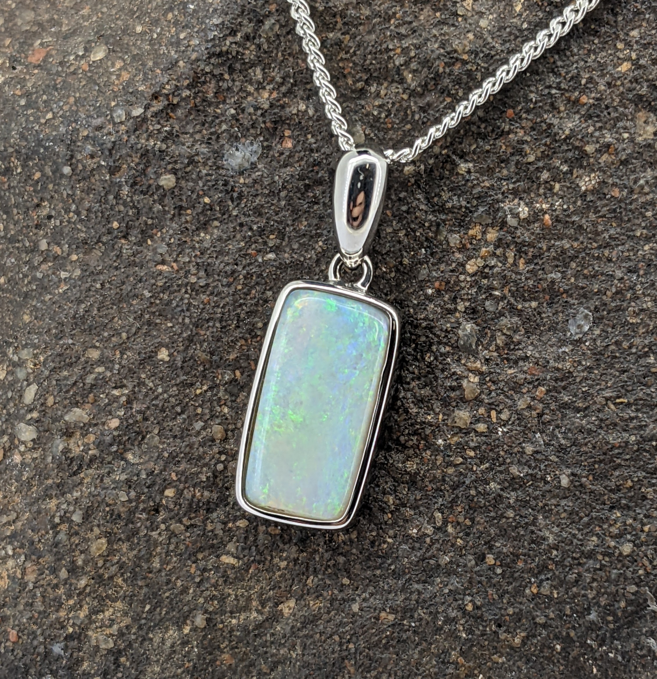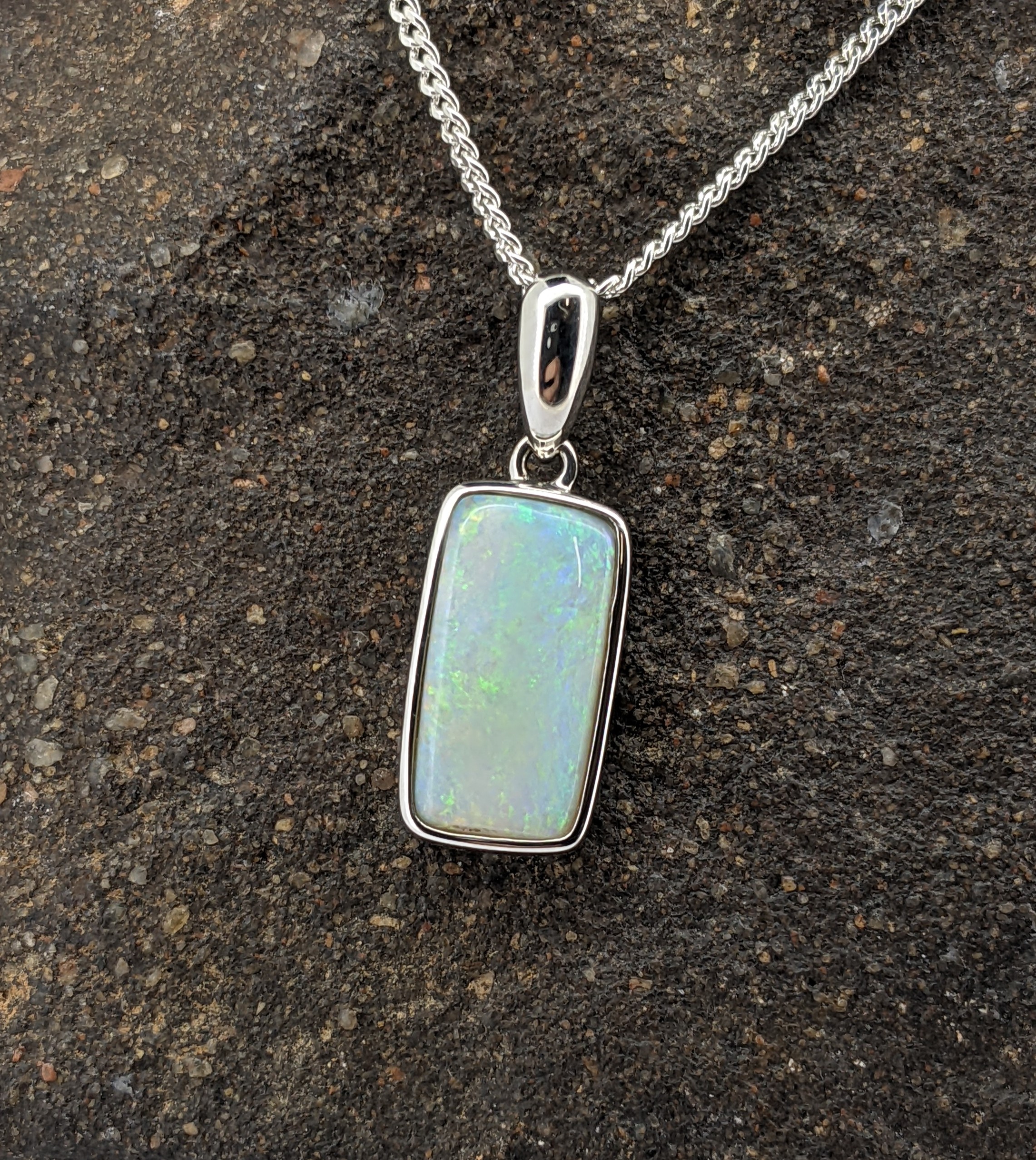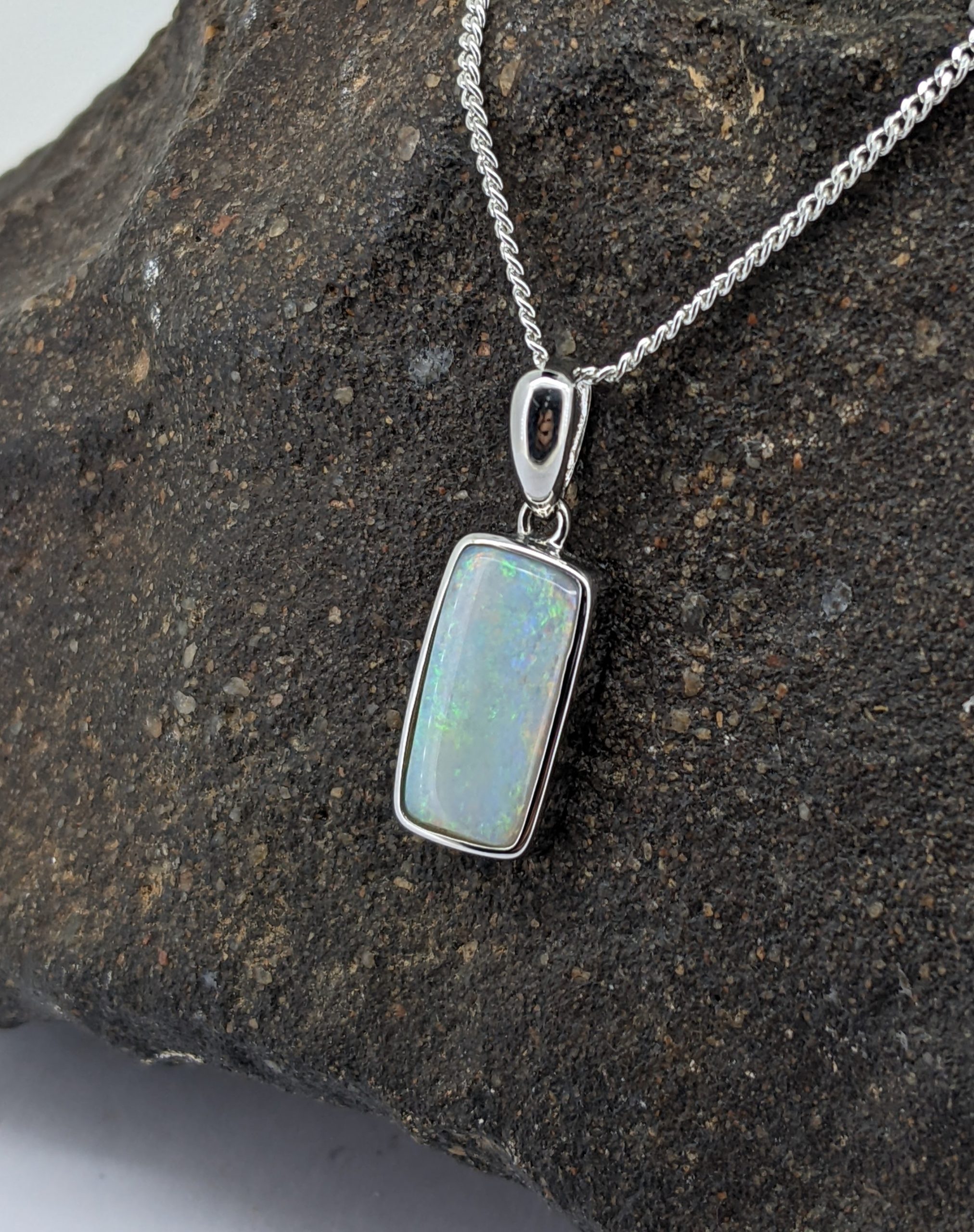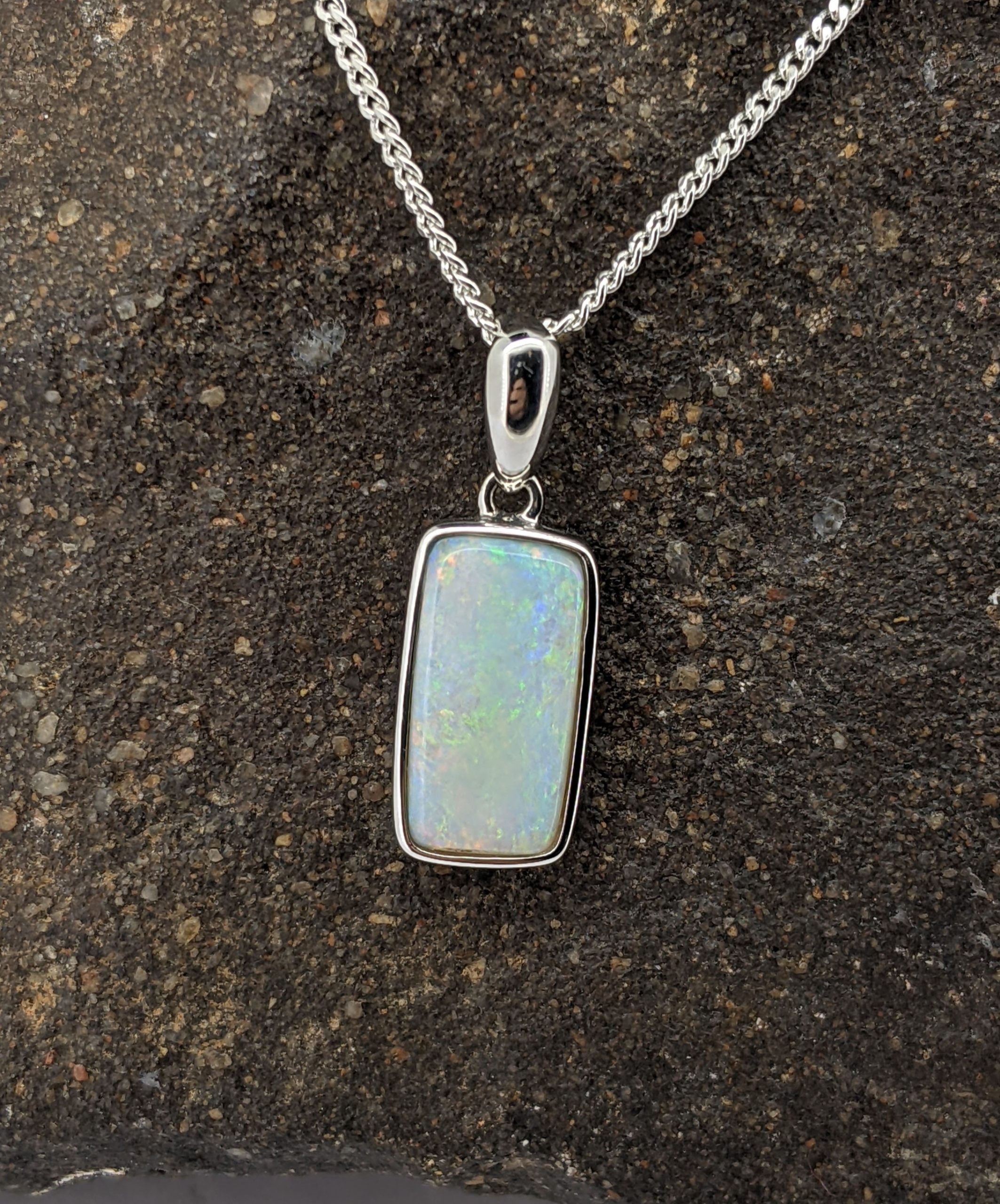Solid natural white opal sourced from Coober Pedy, South Australia. This solid white opal pendant is set in 9K White Gold. The opal has a display of the colours green, yellow, orange and blue.