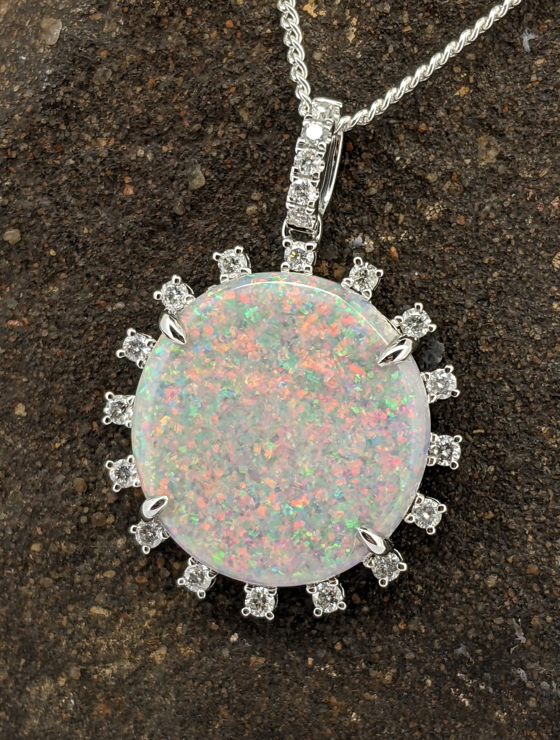 Solid natural white opal sourced from Coober Pedy, South Australia. This solid white opal pendant is set in 9K White Gold and is surrounded by 16 diamonds and complimented by a bail with a further five diamonds. The opal has a sparkling display of the colours red and green.